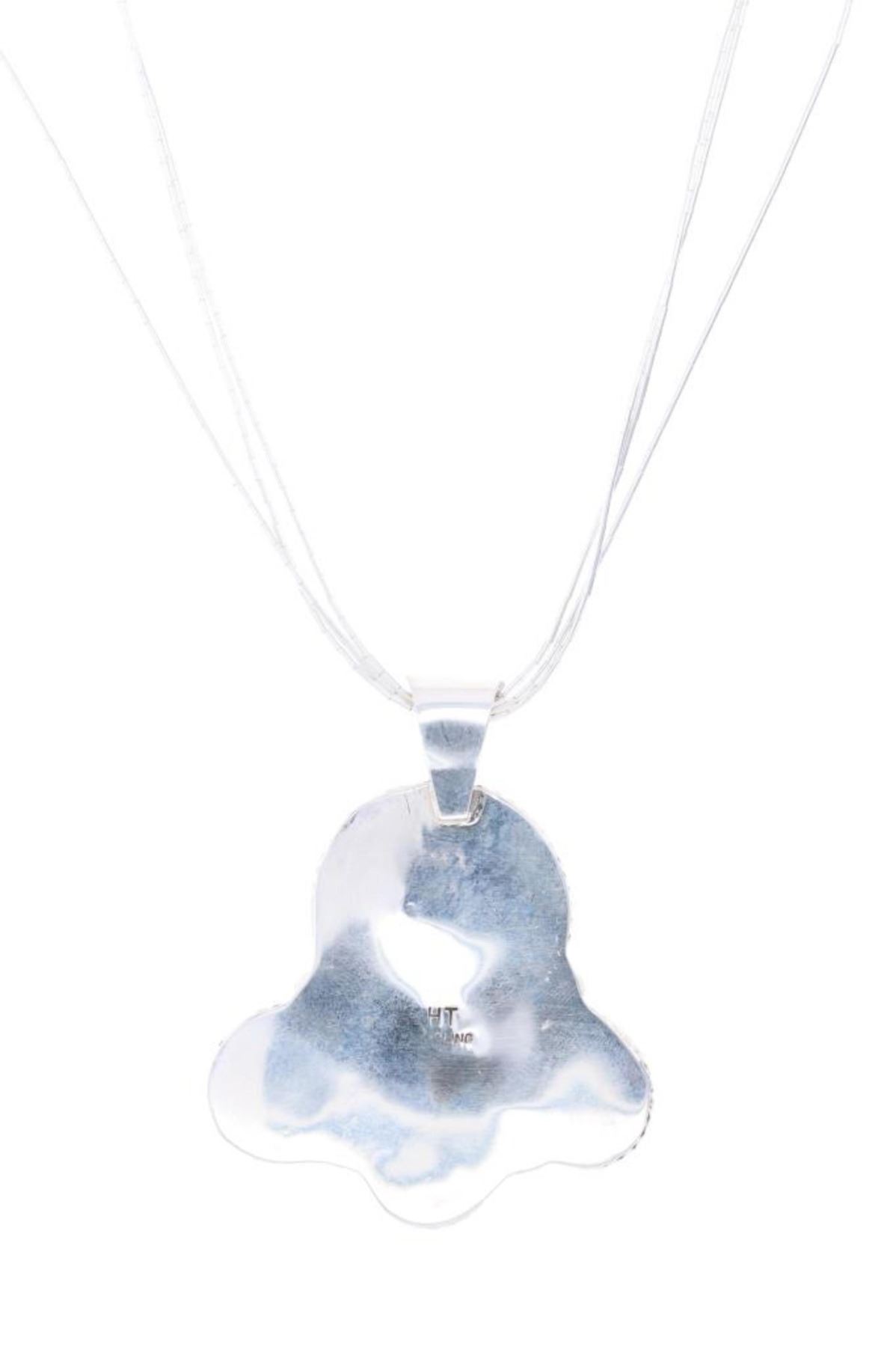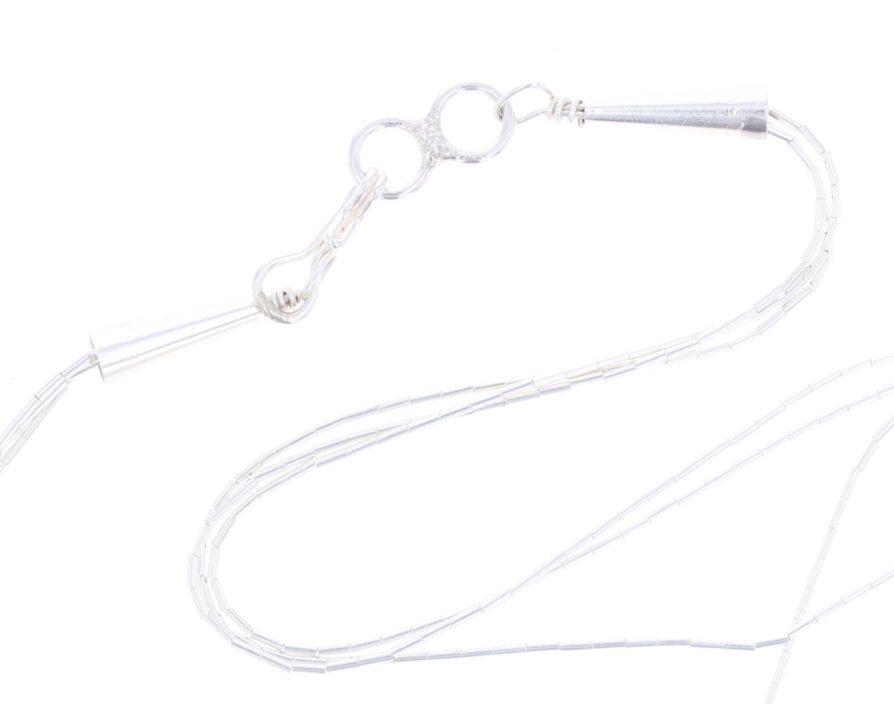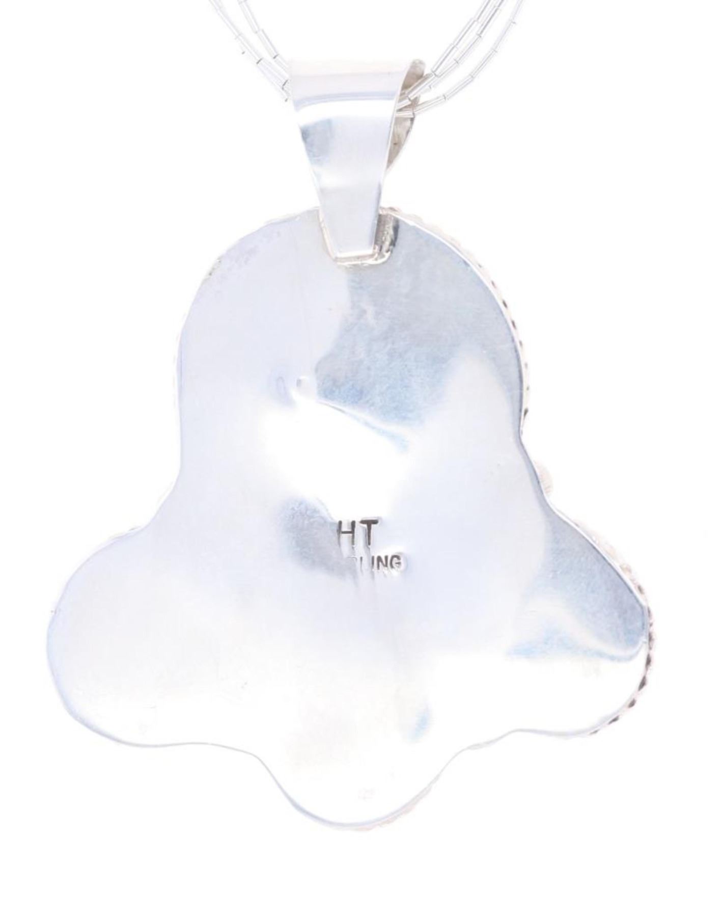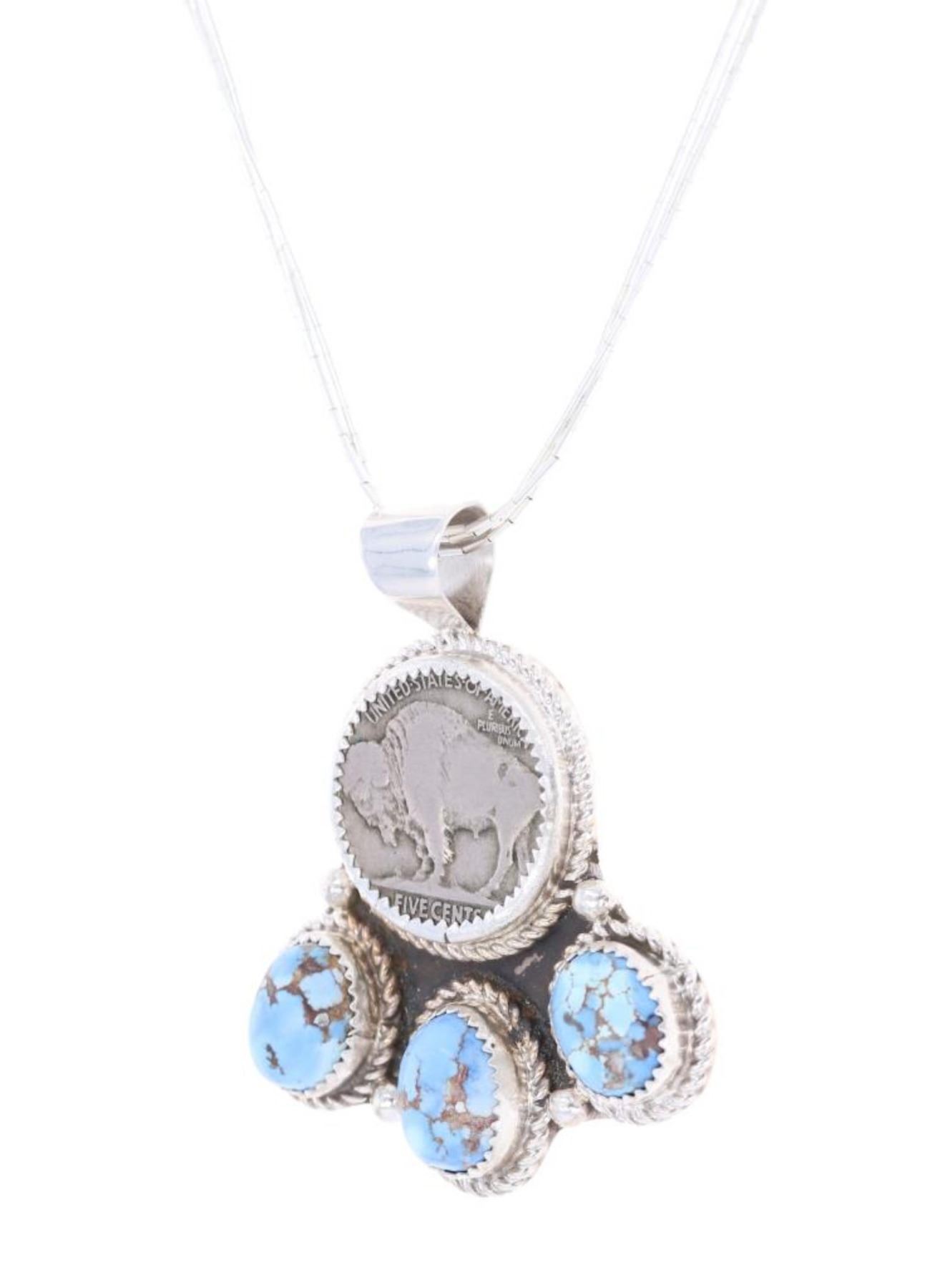 Featured in this lot is this sterling silver and Golden Hills Turquoise necklace from Navajo artist Herbert Tsosie. The necklace features a wonderfully and professionally crafted sterling silver and Golden Hills Turquoise construction that shows a triple strand necklace chain with a buffalo nickel in the center and three oval cut Golden Hills Turquoise cabochon set in the center. The necklace is marked on the back of the pendant as follows: HT - Sterling. The condition of this Navajo necklace is good with no obvious signs of damage and shows good overall condition. The measurements of this necklace from clasp to clasp is 19 1/2" and the pendant measures 2 1/8" x 1 3/4". The collective weight of this necklace is 22.6g.