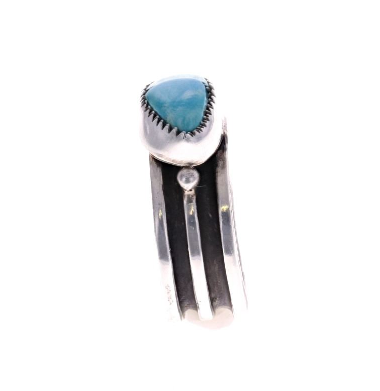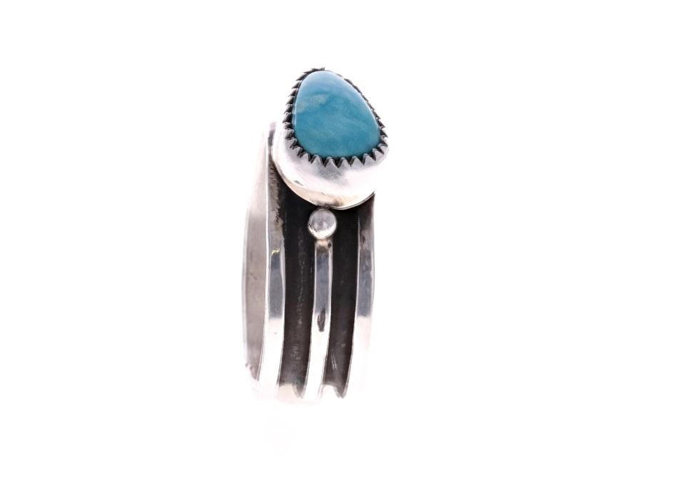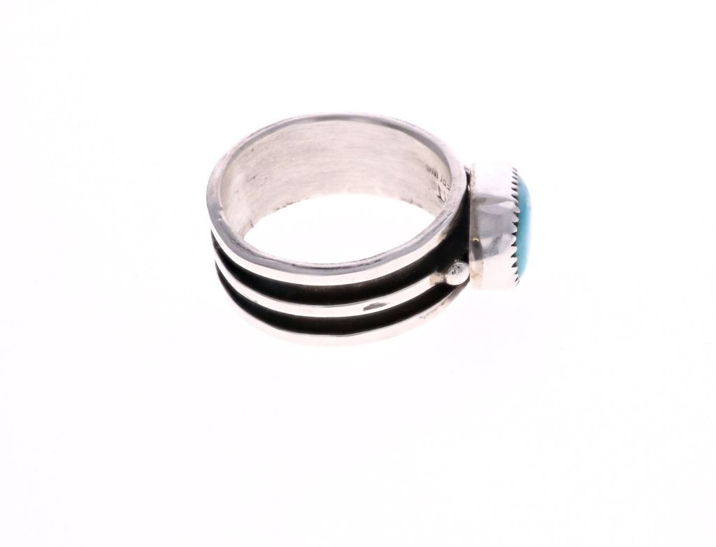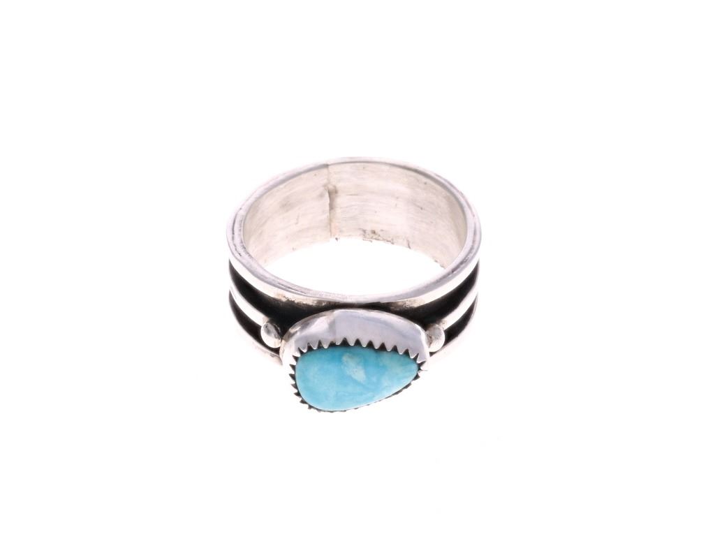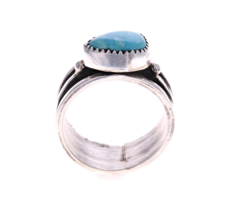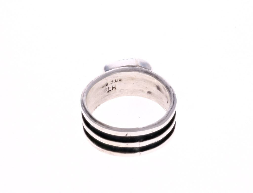 For your consideration is this Navajo, sterling & Fox turquoise ring made by Navajo silversmith Herbert Tsosie. This ring features a sterling construction with a sterling stripe set around the the center of the ring. The top is adorned with a Fox turquoise triangle cabochon. The interior of the ring is marked reading, "HT Sterling". It shows good condition overall with no wear or damage present. It measures 3/8" L x 1" W x 1 1/4" H and has a US ring size of 12. It has a total weight of 9.5 grams.