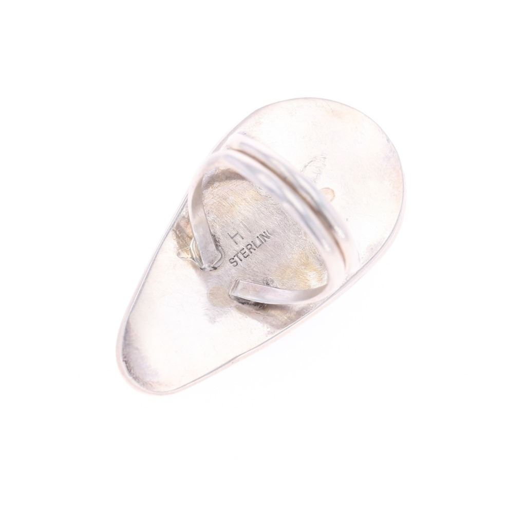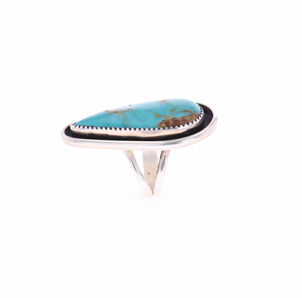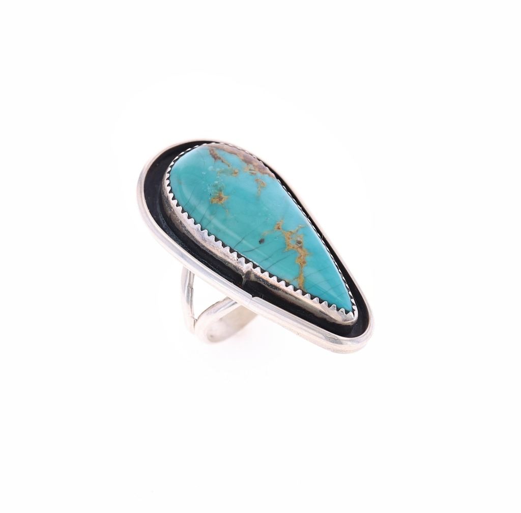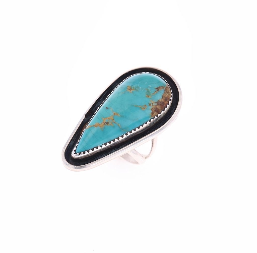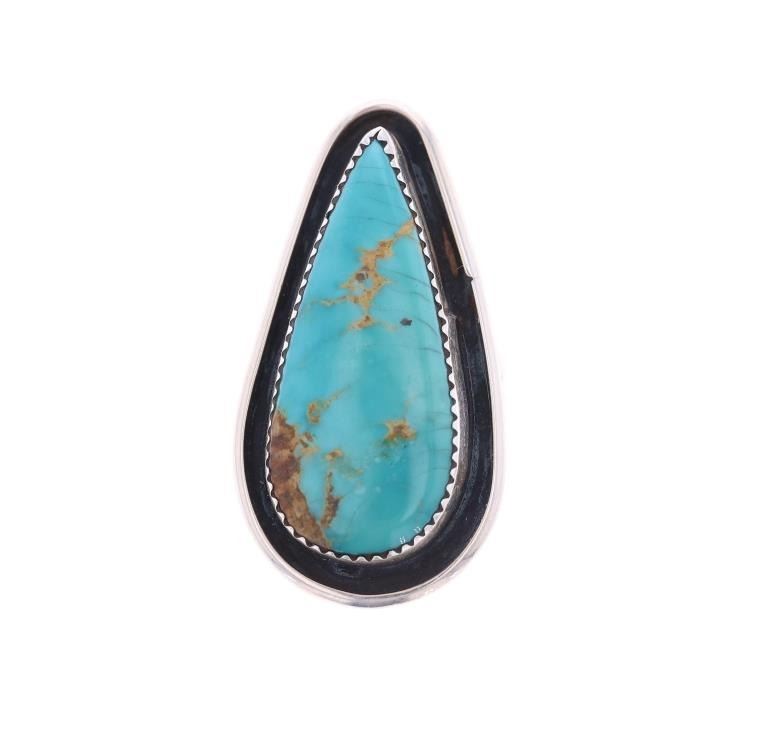 Featured in this lot is this sterling silver turquoise ring from Navajo artist Herbert Tsosie. The ring shows a split shoulder ring band with a shadowbox style border and a pear cut large cripple creek turquoise cabochon. The ring is marked as follows: HT - Sterling. The condition of this Navajo ring is good with no obvious signs of damage and shows good overall condition. The measurements of this ring is 1" x 1 5/8" x 7/8" and the ring size is US 7. The collective weight of this ring is 11.8g.