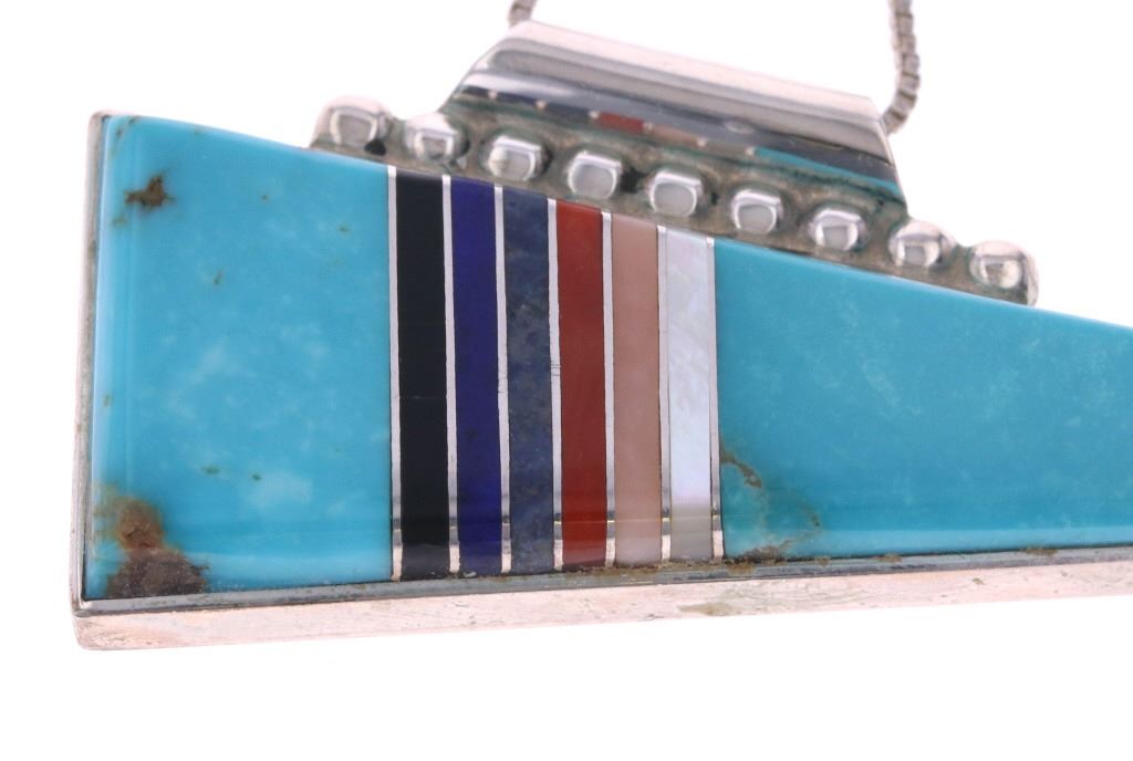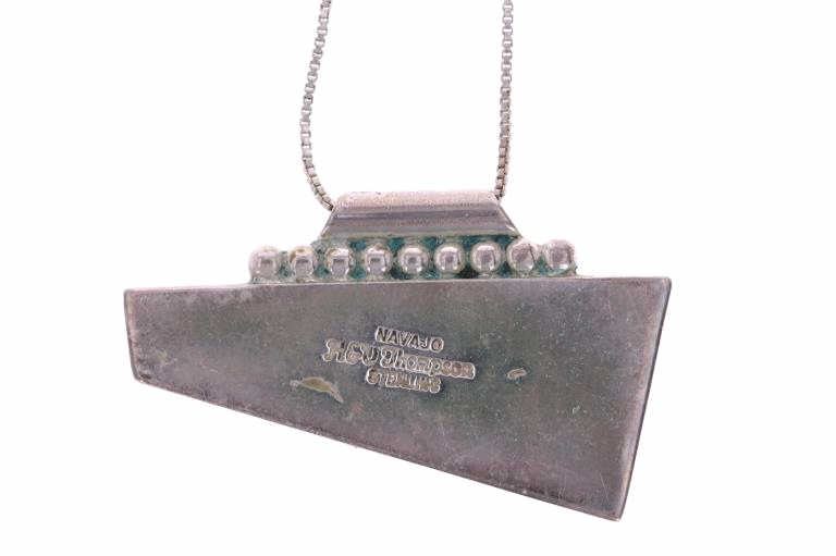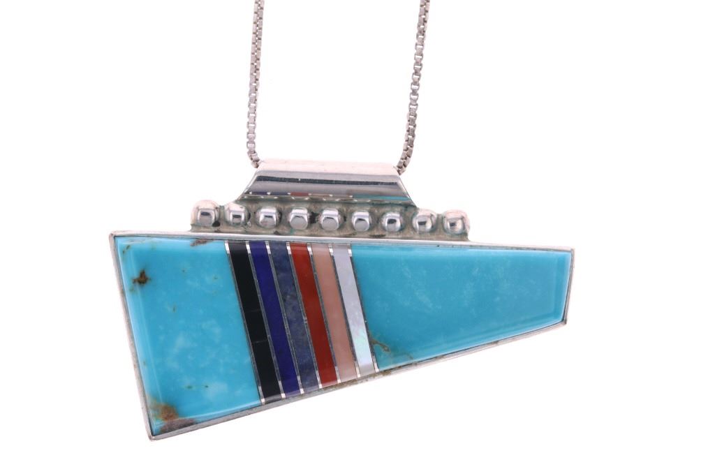 Featured in this lot is this Navajo H&U Thompson multistone inlay necklace. The necklace features a wonderfully and professionally crafted sterling silver and multistone construction that includes cabochon such as: Cripple Creek Turquoise, Mother of Pearl, Jet, Lapis Lazuli, and spiny oyster. The necklace is inlayed with graduated cabochon and includes a sterling silver box chain. The pendant is marked as follows: Navajo - H&U Thompson - Sterling. The condition of this Navajo necklace is well preserved with no obvious signs of damage and shows a well preserved overall condition. The measurements of this necklace is 18" in chain length and the pendant measures 1 1/8" x 1 3/4". The collective weight of this necklace is 14.5g.