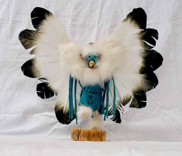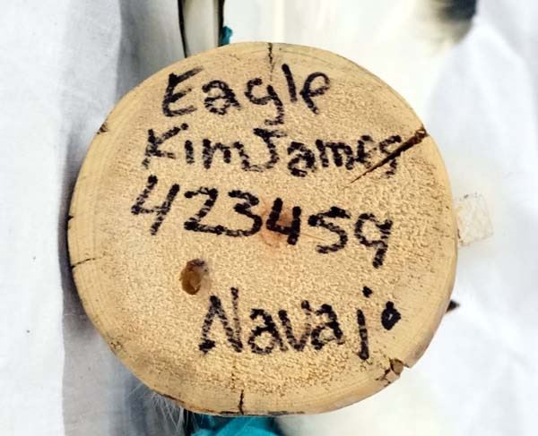 From the Whittredge Estate, we have a Native American Navajo Hand Carved Eagle Kachina by Kim James, measures 12''H x 13''W, signed by artist, embellished with feathers, leather, and rabbit fur