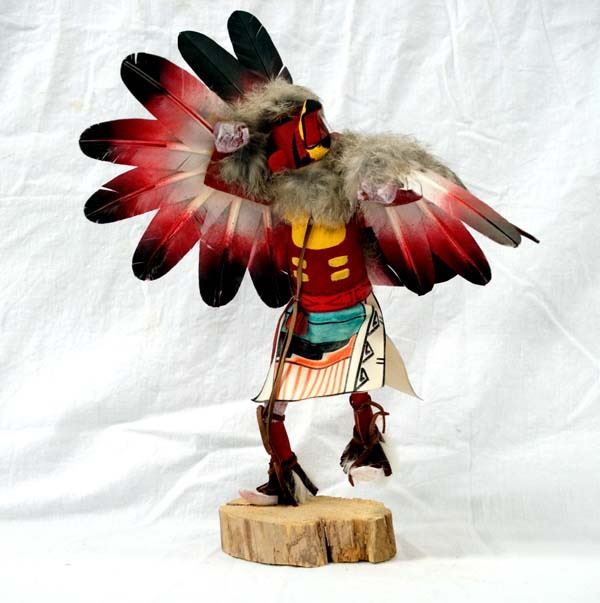 1993 Native American Navajo Hand Carved Red Tail Hawk Kachina by Harvey, signed by artist and measures 12''H x 6.5''W x 5''Deep, embellished with rabbit fur, feathers, and leather