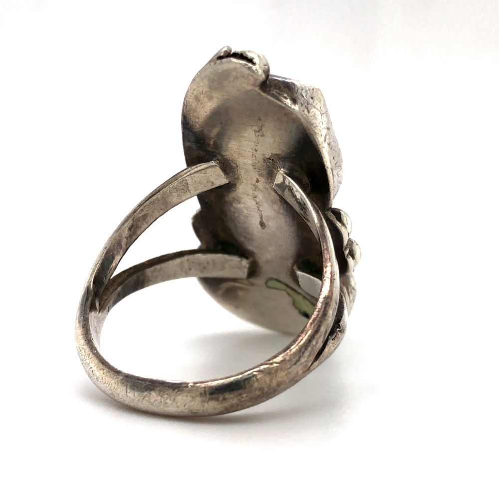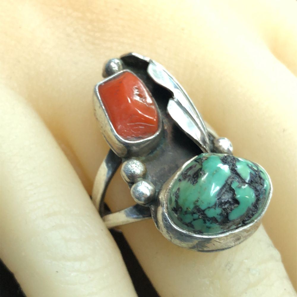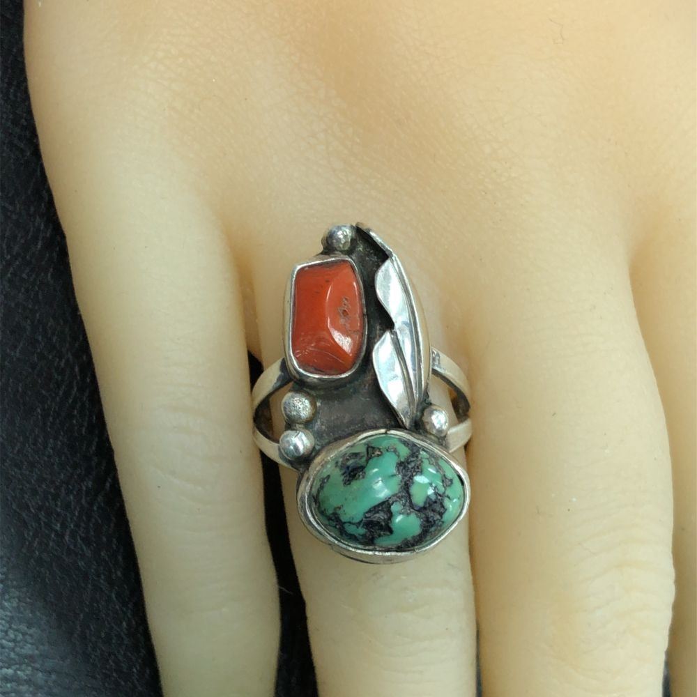 Navajo Vintage 1960's Handmade Kingman Turquoise spider Mediterranean red Coral sterling silver Ring Size 7 1/4 L 1 1/4 " x W 1/2 "