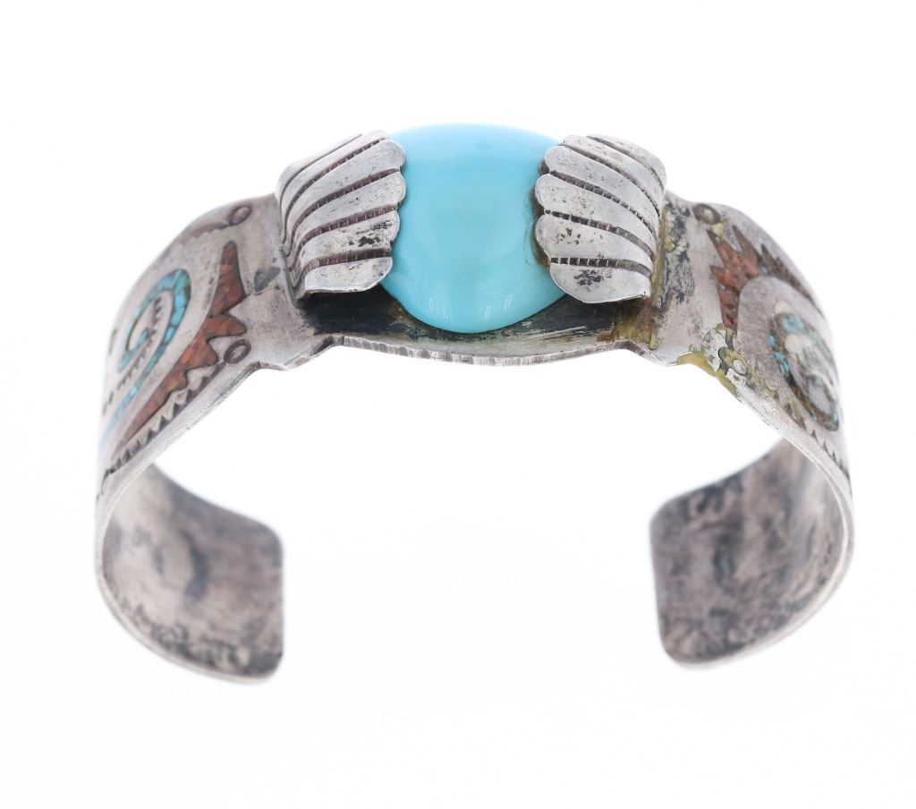 Featured in this lot is this handmade sterling silver and chipped inlay bracelet from Navajo artist B. Een. The bracelet features a wonderfully and professionally handmade sterling silver construction that features shoulders that are decorated with turquoise and red branch coral chipped inlay in geometric patterns and shows a centerstone of sleeping beauty turquoise that is set between scalloped placements. The artist hallmark can be seen on the underside of the bracelet with a 'handmade' stamp above the hallmark. The condition of this bracelet is fair with the left side of the bracelet showing some wear to the chipped inlay and some repair to the left scalloped centerstone placement but shows fair overall condition. The measurements of this bracelet are 2 1/8" x 2 5/8" x 1" and the circumference is 5". The collective weight of this bracelet is 52g.