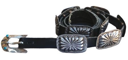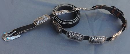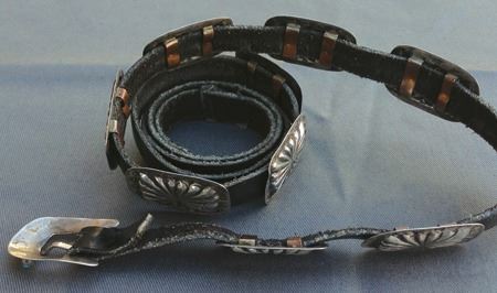 Ca. 1990s, Extra long leather hatband with 10 all-silver conchos. Fully adjustable. Conchos 1-1/2" x 1"