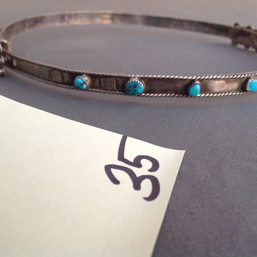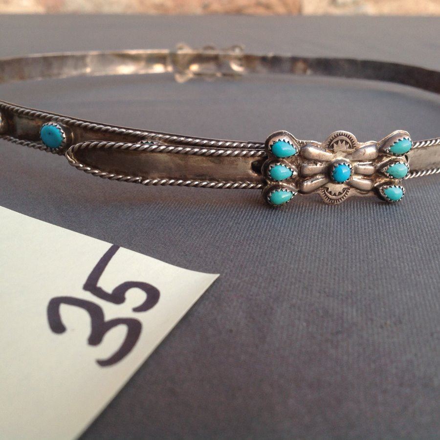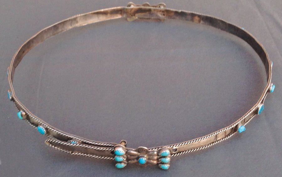 Belt style, handwrought all silver hatband with great rope work edging, repousse "buckle," and several turquoise stones. Very good condition.,,8 1/4" to 7 1/4"