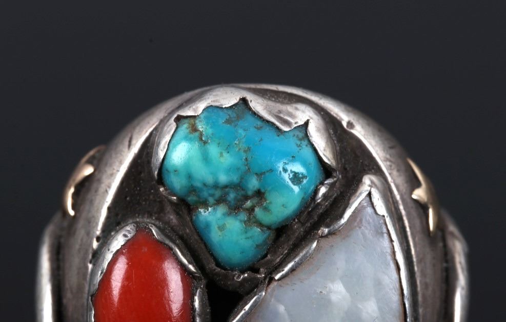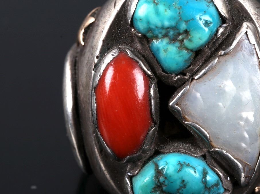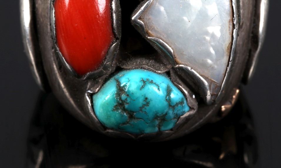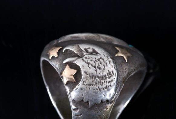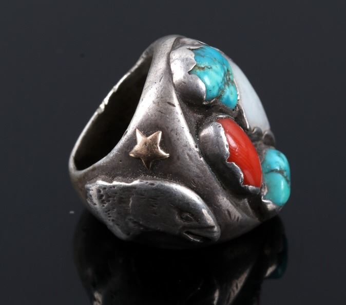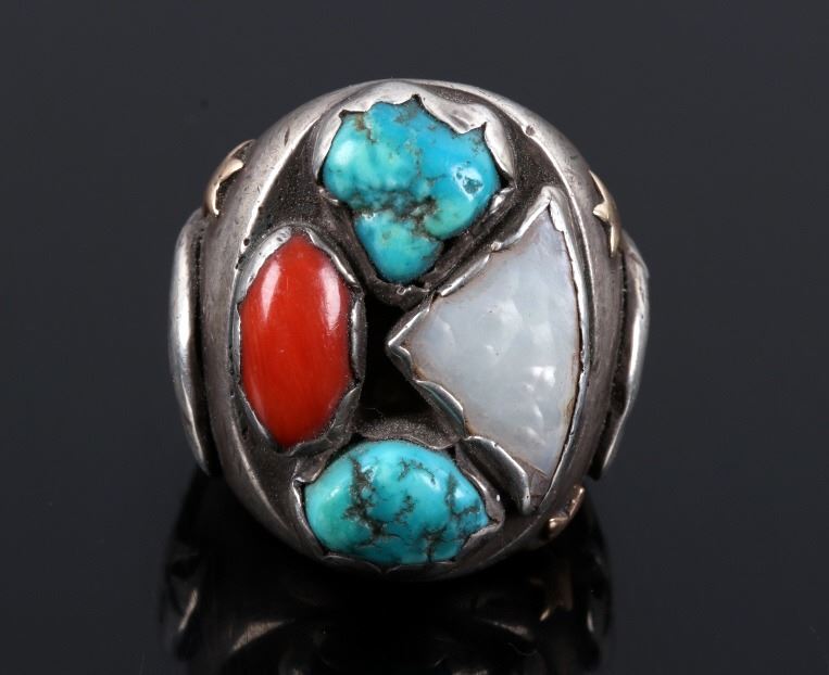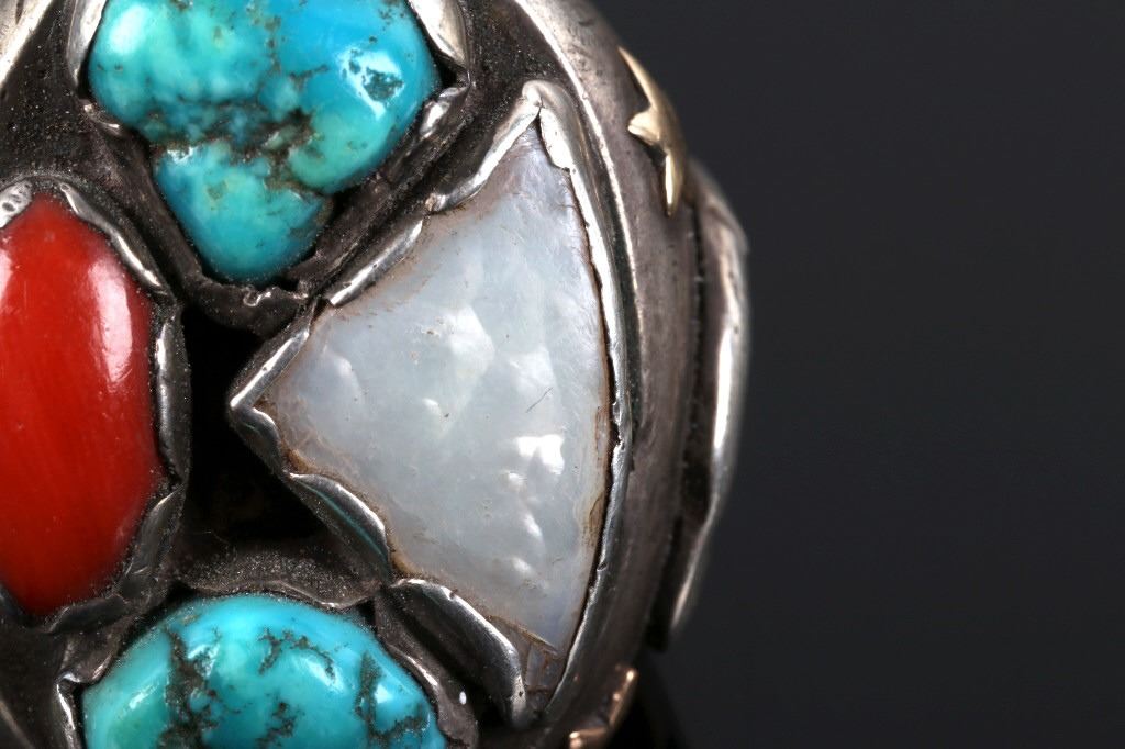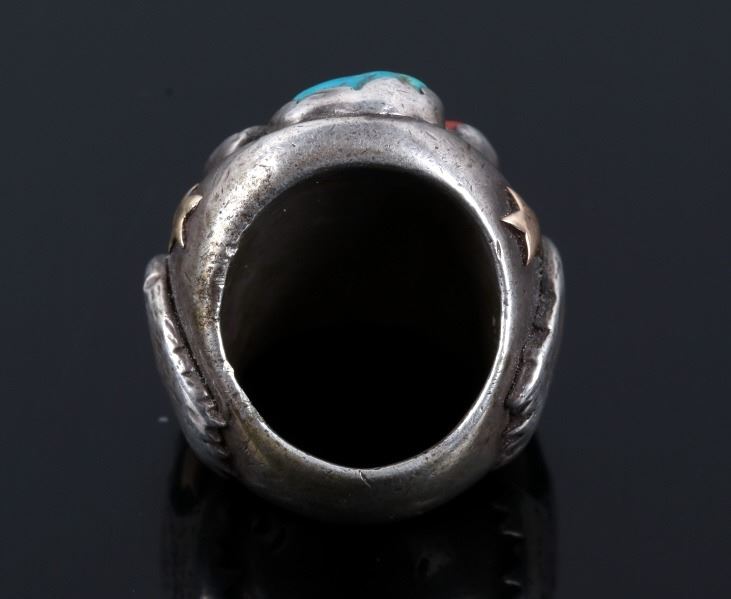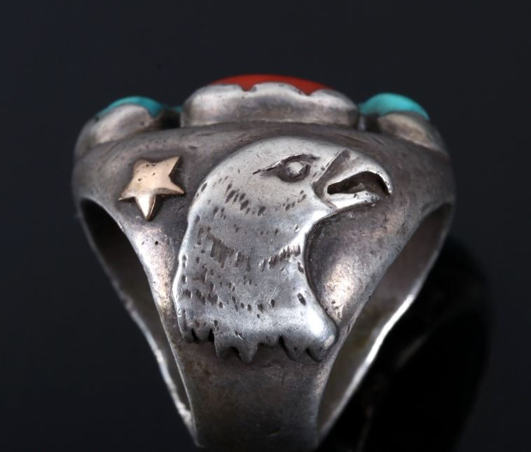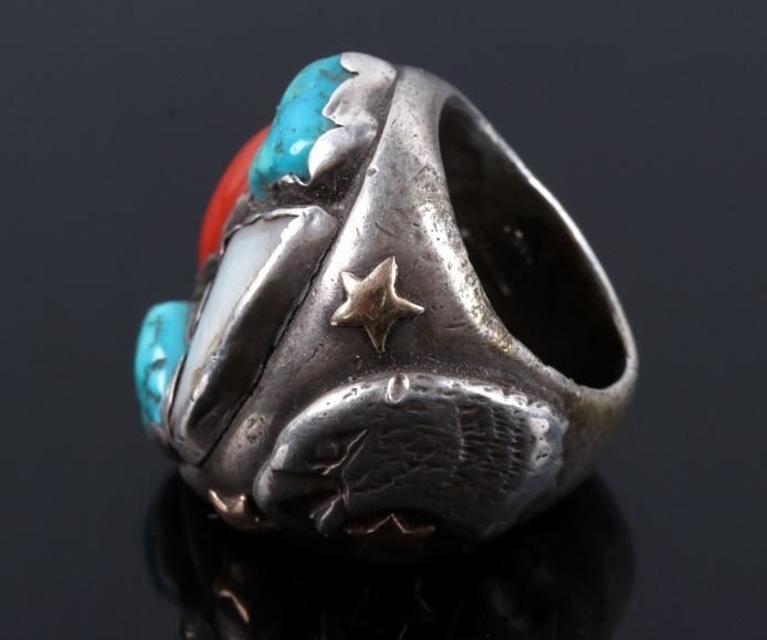 Included in this lot we have a Navajo Native American sterling silver and 14k gold multi stone ring. The ring displays thick sterling silver construction with a silver eagle portrait designs on each side. The face of the ring displays two nuggets of turquoise, a cabochon of ox blood coral, and a triangular piece of mother of pearl. Each of the sides display a sterling silver eagle head with 14k gold stars around the portraits. The ring is marked across the interior of the piece reading "14K Sterling". The ring displays a thick sturdy construction and shows good condition overall with some light wear. The ring is fitted for a US size 7 with the top measuring 1 1/4" long.