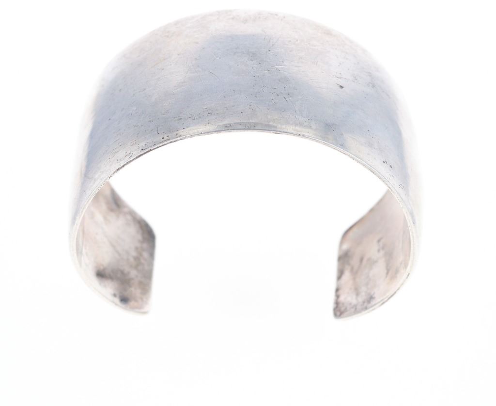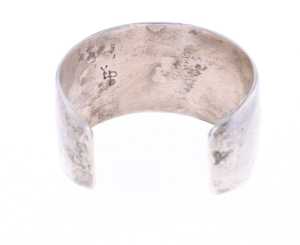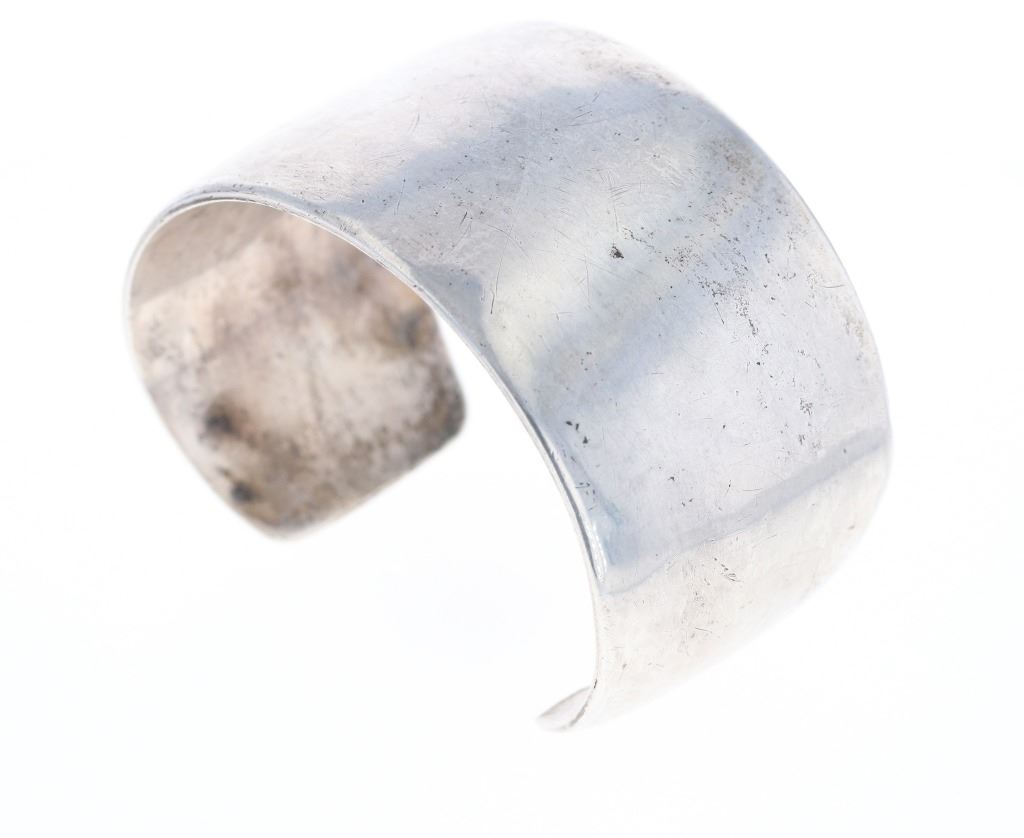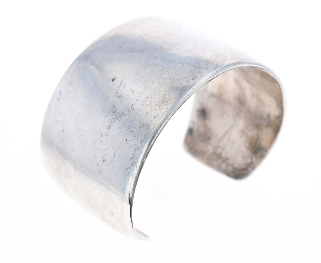 Featured in this lot is this Navajo heavy sterling silver bracelet circa 1950's. The bracelet features a wonderfully and professionally crafted sterling silver construction with a wide birth and a girthy construction. The condition of this bracelet is good with no obvious signs of damage and in good overall condition. The measurements of this bracelet is 2" x 2 1/2" x 1 1/2" and the circumference is 5". The collective weight of this bracelet is 63.2g.