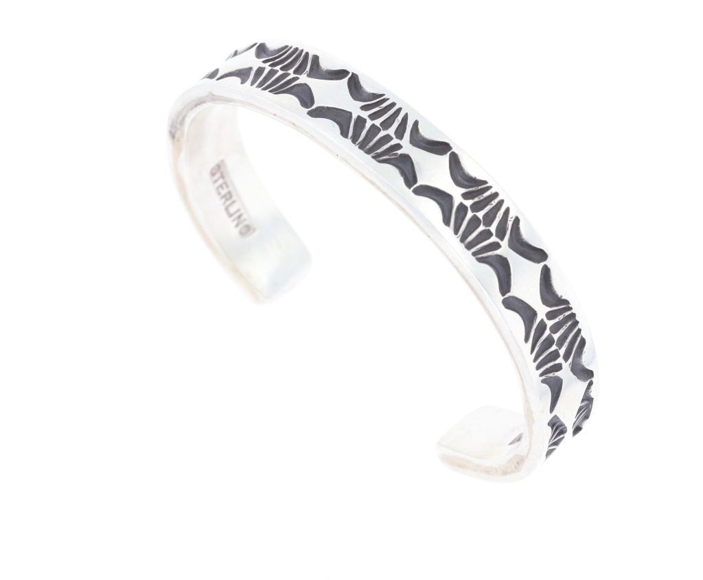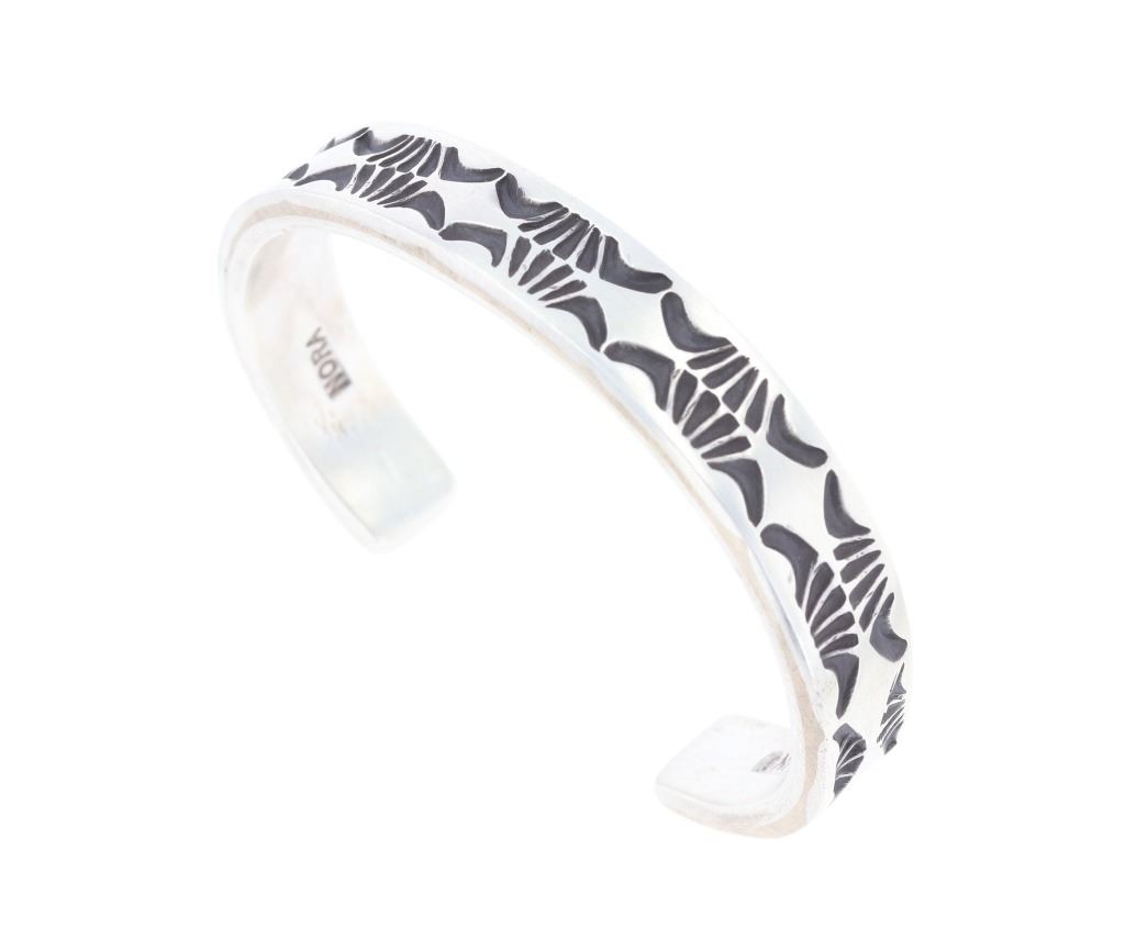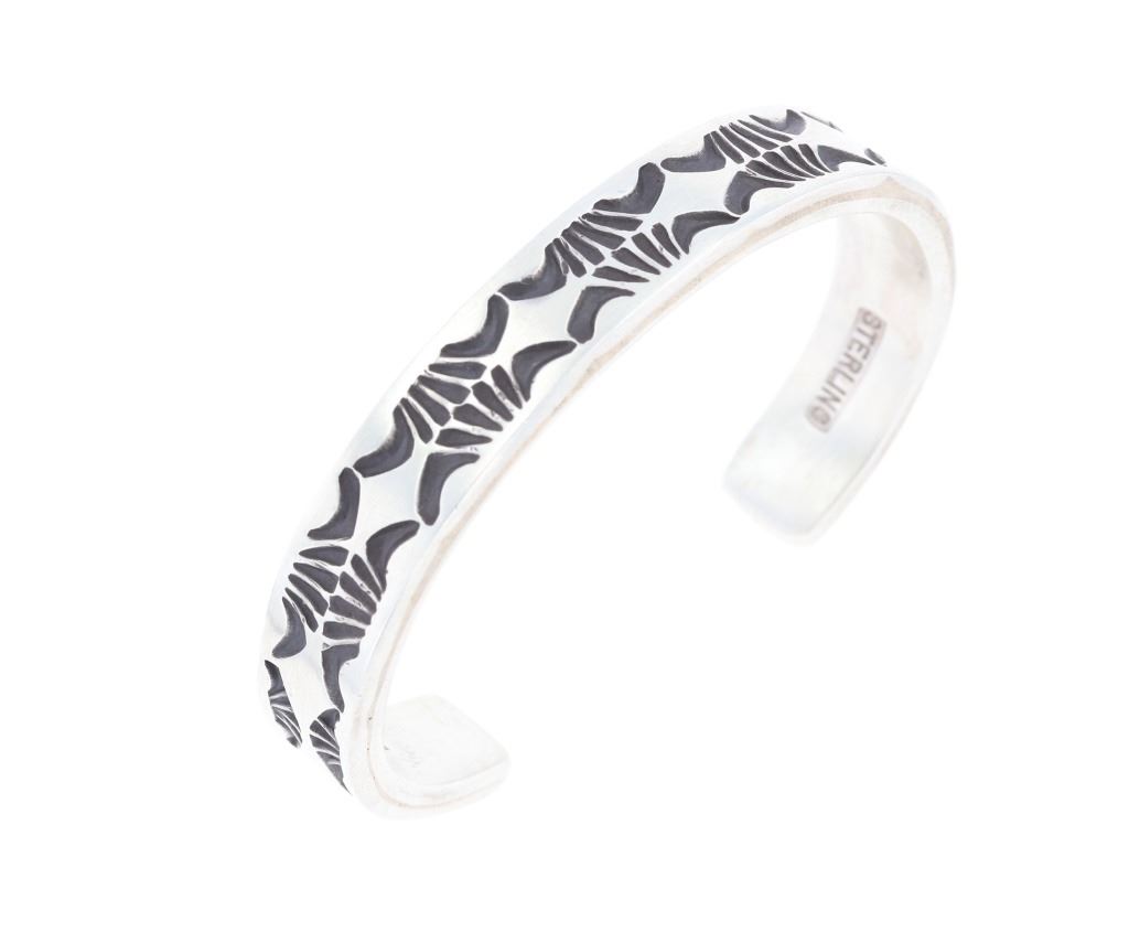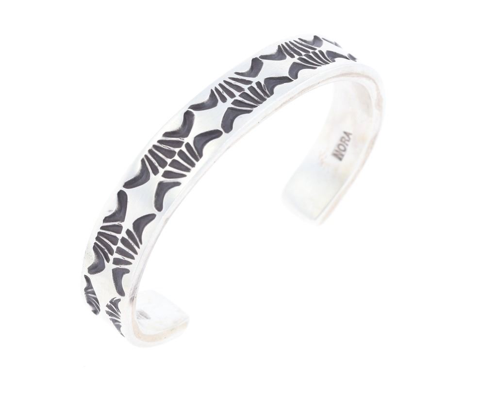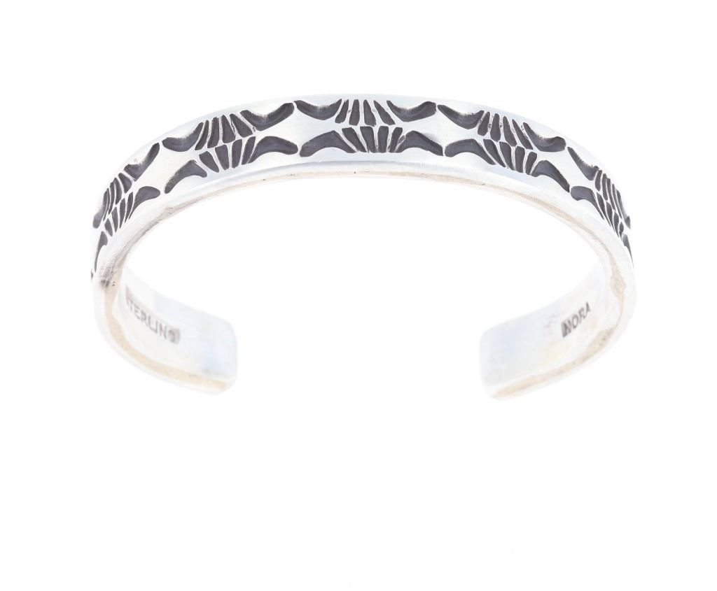 Featured in this lot is this handmade sterling silver bracelet from Navajo artist Nora Tahe. The bracelet features a wonderfully and professionally crafted, heavy handmade sterling silver construction with a stamped and tooled sterling silver face of geometric patterns. The artist’s hallmark can be seen on the underside of the bracelet with a 'sterling' stamp on the underside as well. The condition of this bracelet is good, with no obvious signs of damage. The measurements of this bracelet are 2 1/8" x 2 7/8" x 1/2" and the circumference is 4 3/4". The overall weight of this bracelet is 69.1g.