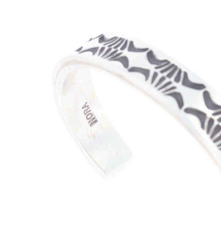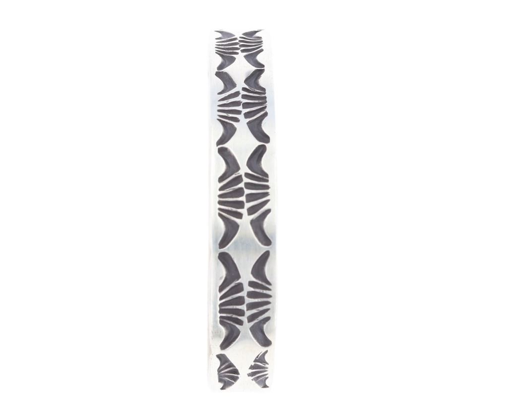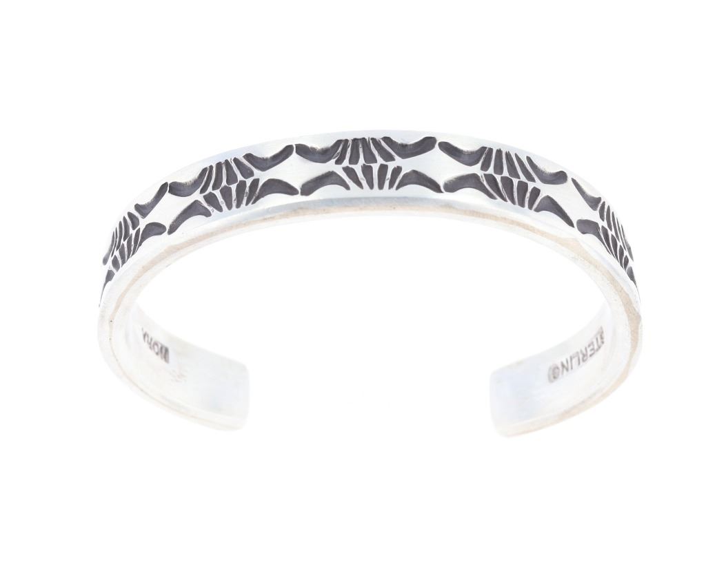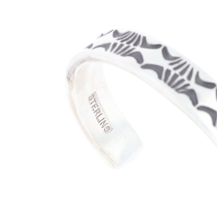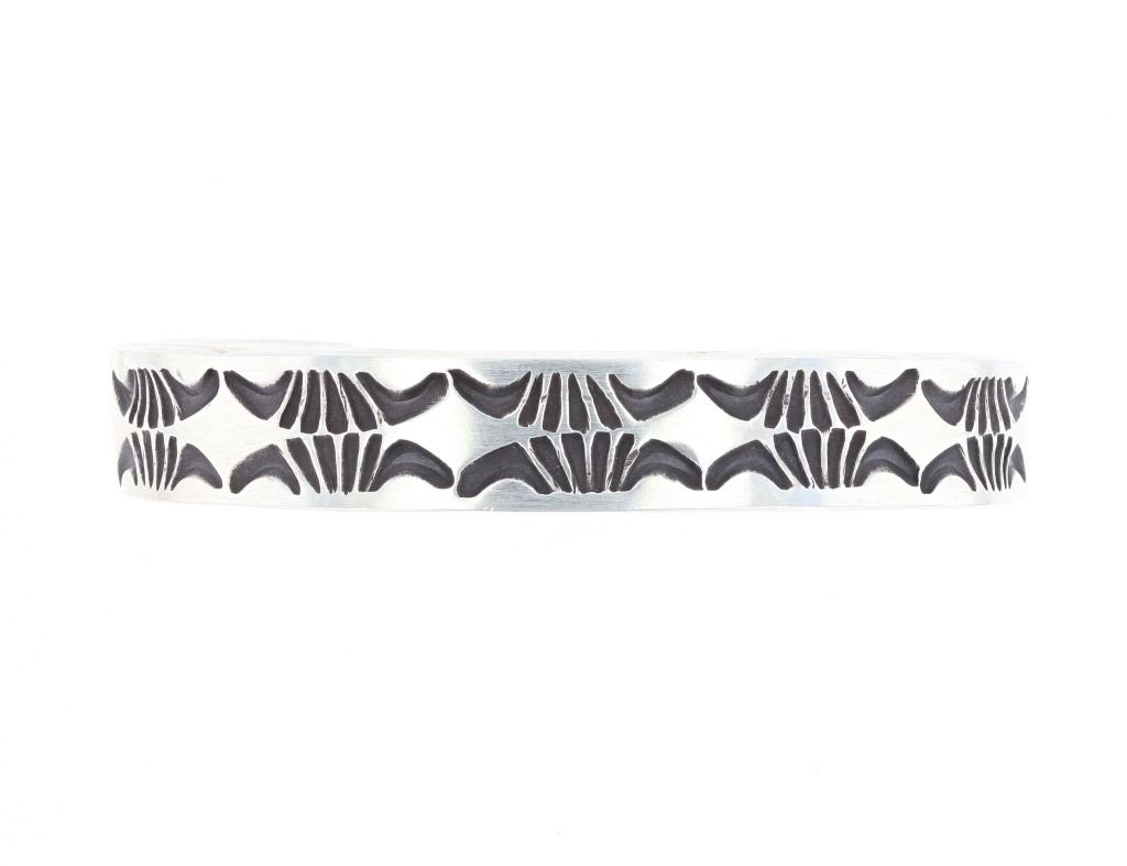 Featured in this lot is this handmade sterling silver bracelet from Navajo artist Nora Tahe. The bracelet features a wonderfully and professionally crafted, heavy handmade sterling silver construction with a stamped and tooled sterling silver face of geometric patterns. The artist’s hallmark can be seen on the underside of the bracelet with a 'sterling' stamp on the underside as well. The condition of this bracelet is good, with no obvious signs of damage. The measurements of this bracelet are 2 1/8" x 2 7/8" x 1/2" and the circumference is 4 3/4". The overall weight of this bracelet is 69.1g.