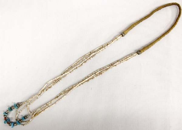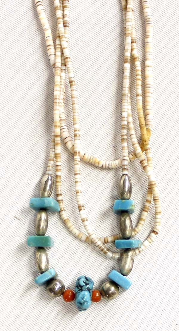 Native American Navajo Shell Heishi Turquoise Nugget, Three Strand Necklace. Sterling Silver Hollow Beads, Natural Nuggets. End to end 28''. Nuggets approx. 1/2''L