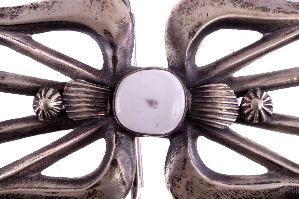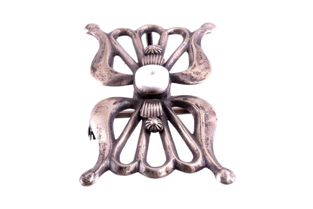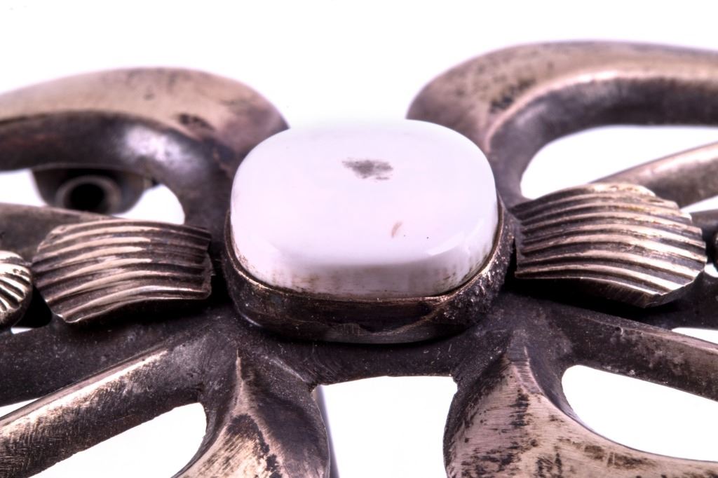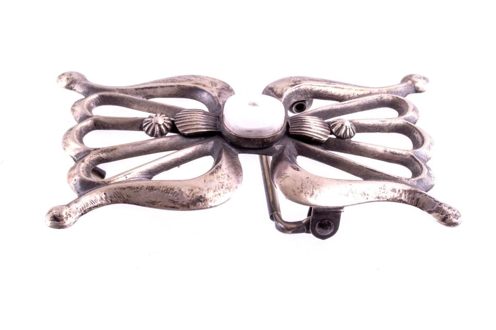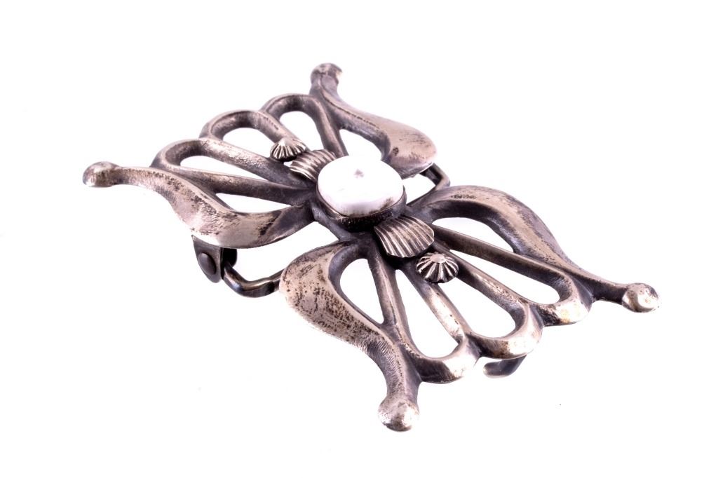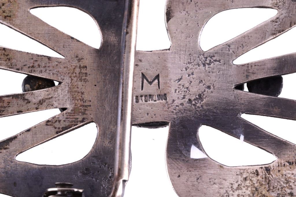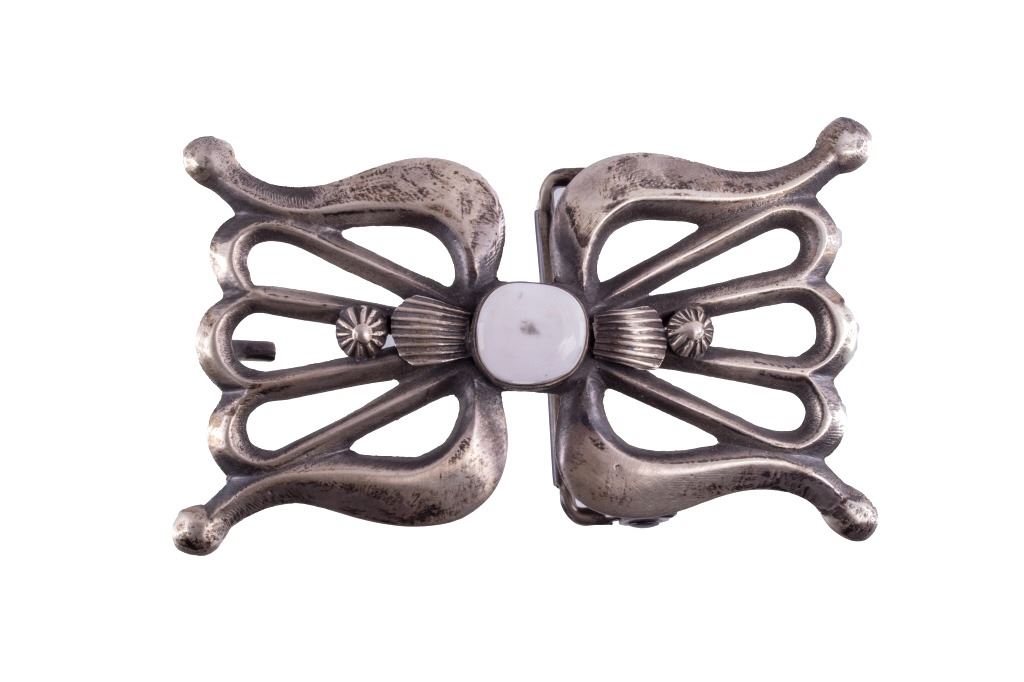 Featured in this lot is this sand cast sterling silver and white buffalo turquoise belt buckle from Navajo artist Henry Morgan. This sand cast buckle shows a wonderful example of Navajo construction and smaller examples of concho and shell decoration with a rough cut white buffalo turquoise cabochon set into the center. The artist’s hallmark is shown on the backside of the buckle above the 'sterling' mark. The condition of this bracelet is good, with no obvious signs of damage. The measurements of this buckle are 2" x 3 1/4" x 7/8". The weight of this buckle is 49.4g.