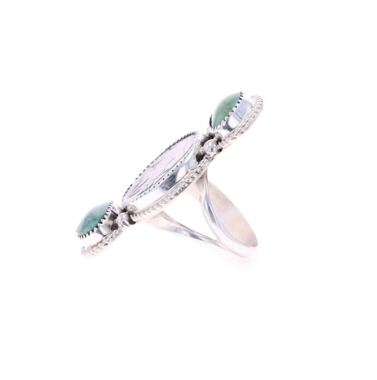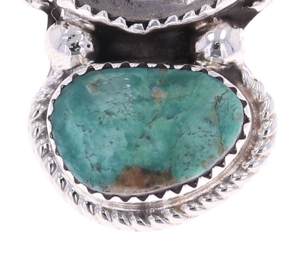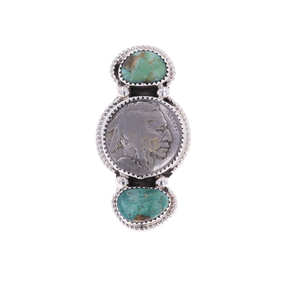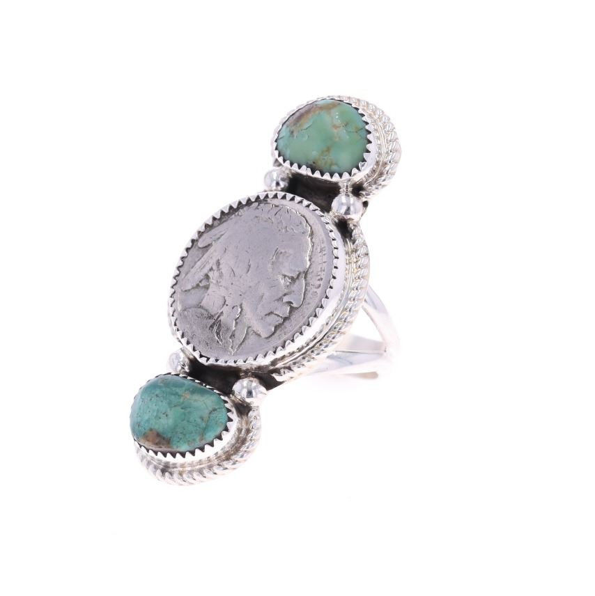 Featured in this lot is this Indian Head Nickel and Carico Lake Turquoise ring from Navajo artist Herbert Tsosie. The ring features a wonderfully and professionally crafted sterling silver, Indian Head Nickel, and Carico Lake Turquoise construction. The ring shows two nugget turquoise cabochon set into either side of an Indian Head Nickel with twisted rope border. The ring is marked as follows: HT - Sterling. The condition of this Navajo ring is good with no obvious signs of damage and shows good overall condition. The measurements of this ring is 1 1/8" x 2" x 1" and shows a ring size of US Adjustable. The collective weight of this ring is 19.2g.