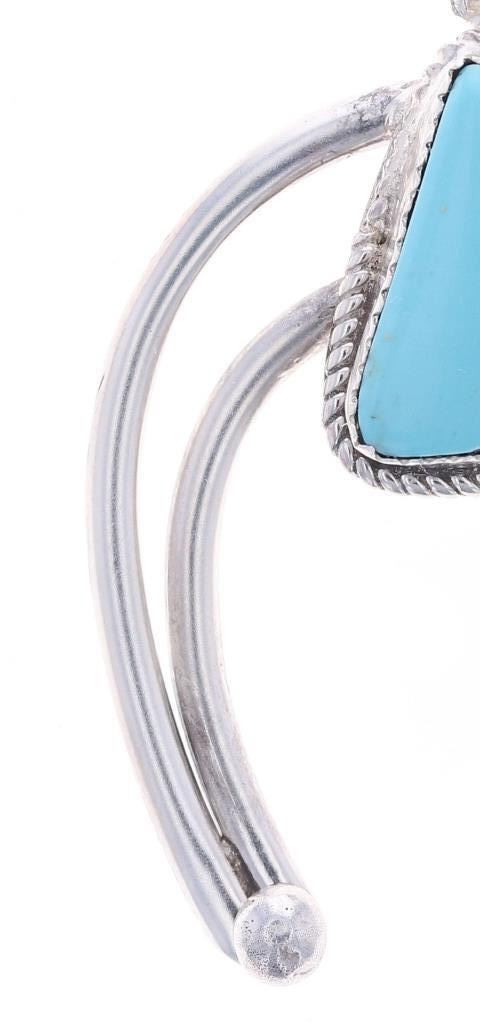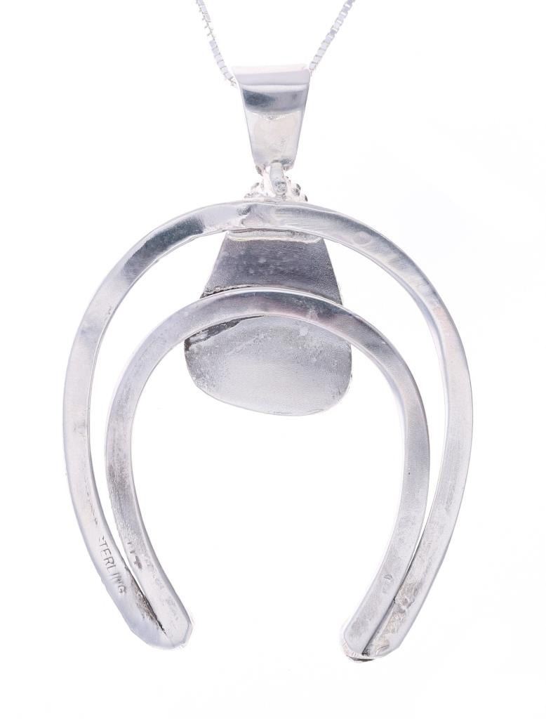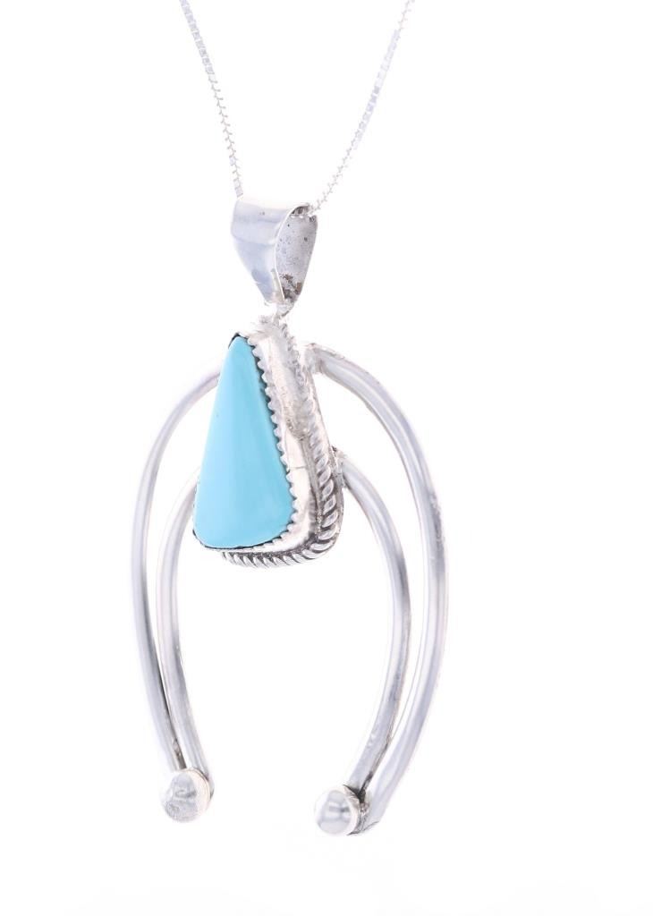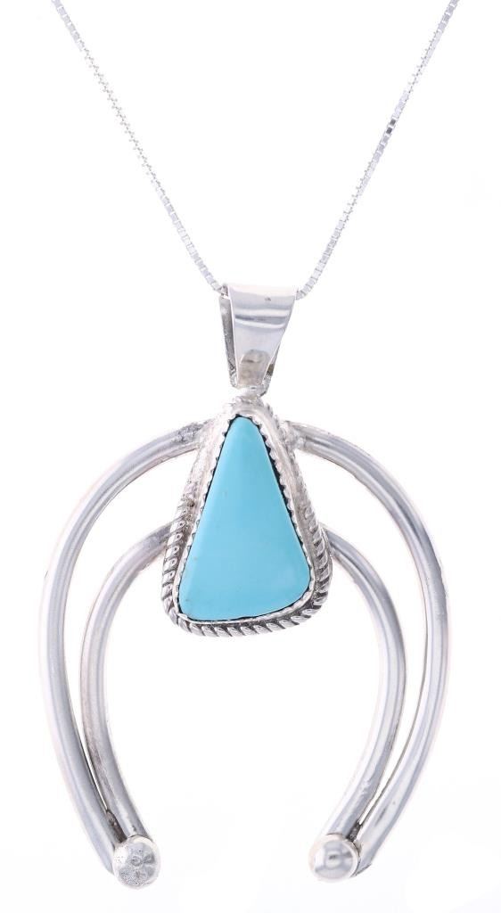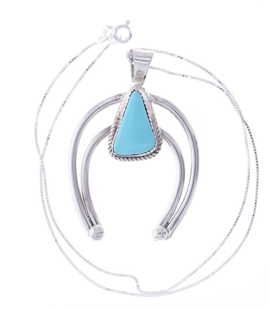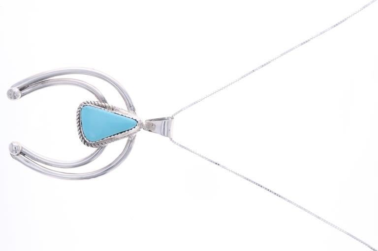 Featured in this lot is this sterling silver turquoise necklace from Navajo artist Herbert Tsosie. The necklace features a wonderfully and professionally crafted sterling silver and turquoise construction that shows the naga pendant set with a triangular example of Carico Lake turquoise and is marked 'Sterling' and 'HT' on the back side of the naga pendant. The condition of this necklace shows a bright sheen to the sterling silver and a nice light blue luster to the Carico Lake turquoise and no obvious signs of damage. The measurements of this necklace from clasp to clasp is 17 3/4" and the pendant measures 2 1/4" x 1 5/8". The collective weight of this necklace is 14.2g.