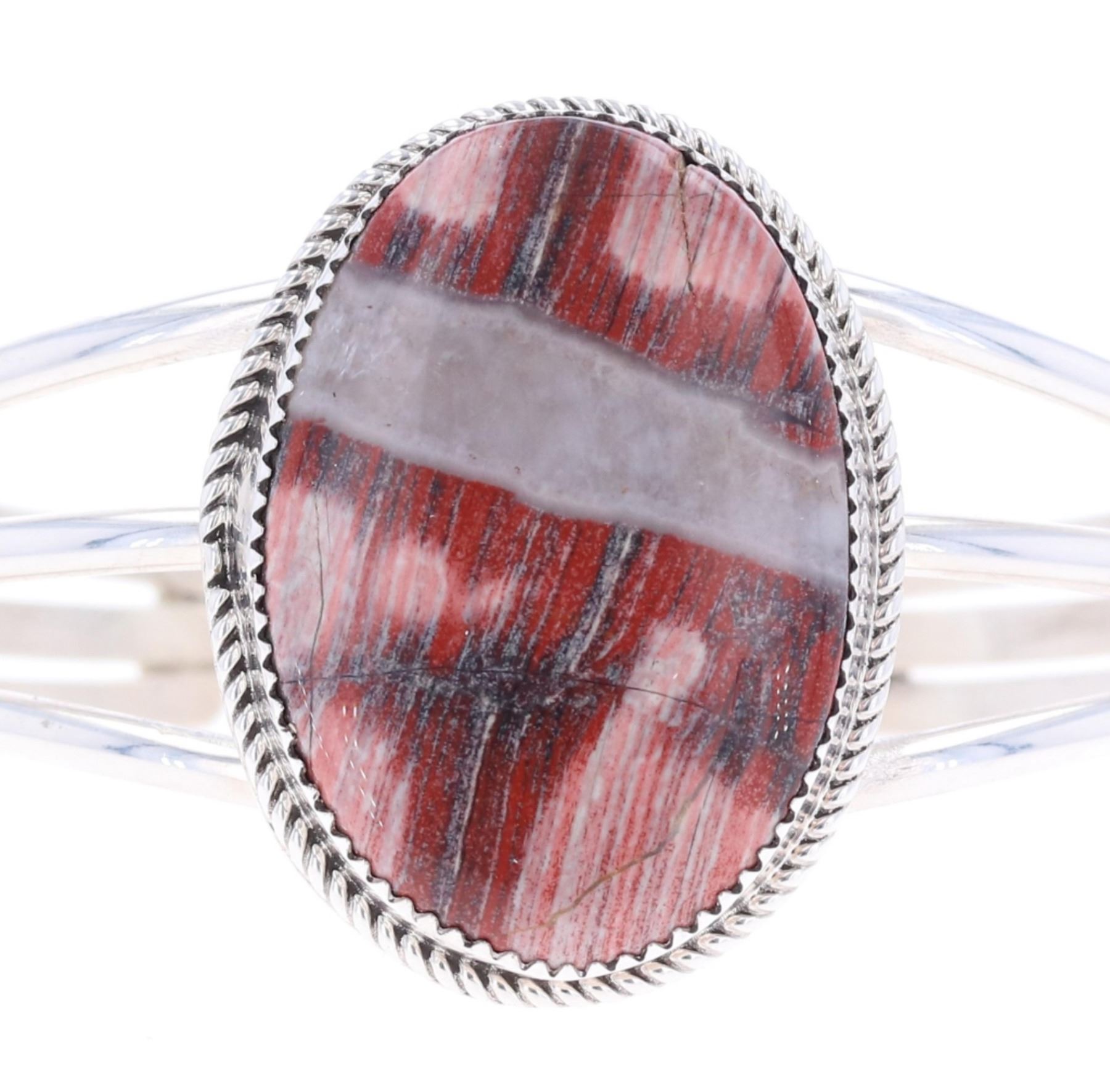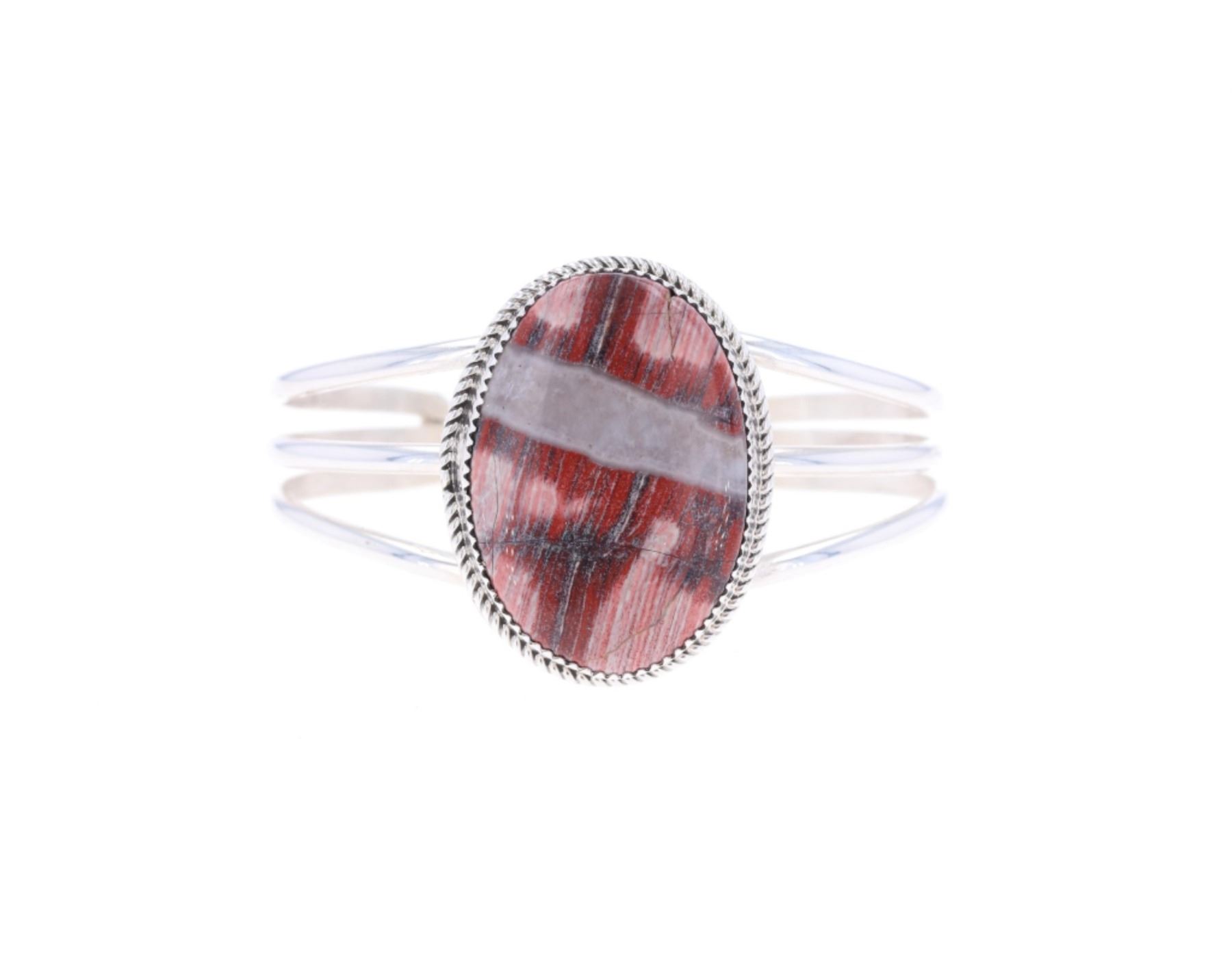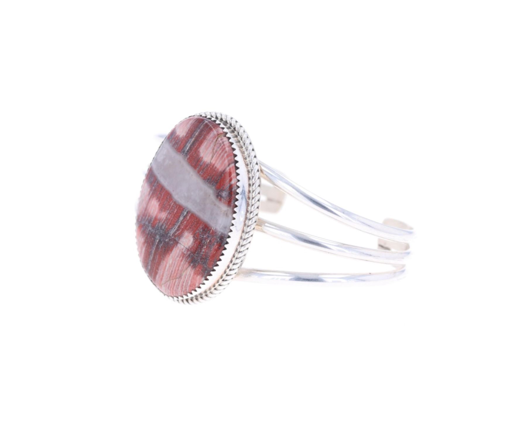 Featured in this lot is this sterling silver striped red jasper bracelet from Navajo artist Herbert Tsosie. The bracelet features a wonderfully and professionally crafted sterling silver construction that shows a twisted rope border with a triple split frame and a large oval striped red jasper cabochon set into the face of the bracelet. The underside of the bracelet is marked as follows: HT - Sterling. The condition of this Navajo bracelet is good with no obvious signs of damage and shows good overall condition. The overall measurements of this bracelet is 2" x 2 1/2" x 1 1/2" and the internal measurements of this bracelet is 4 3/4" from tip to tip and the gap measures 1". The collective weight of this bracelet is 30.4g.