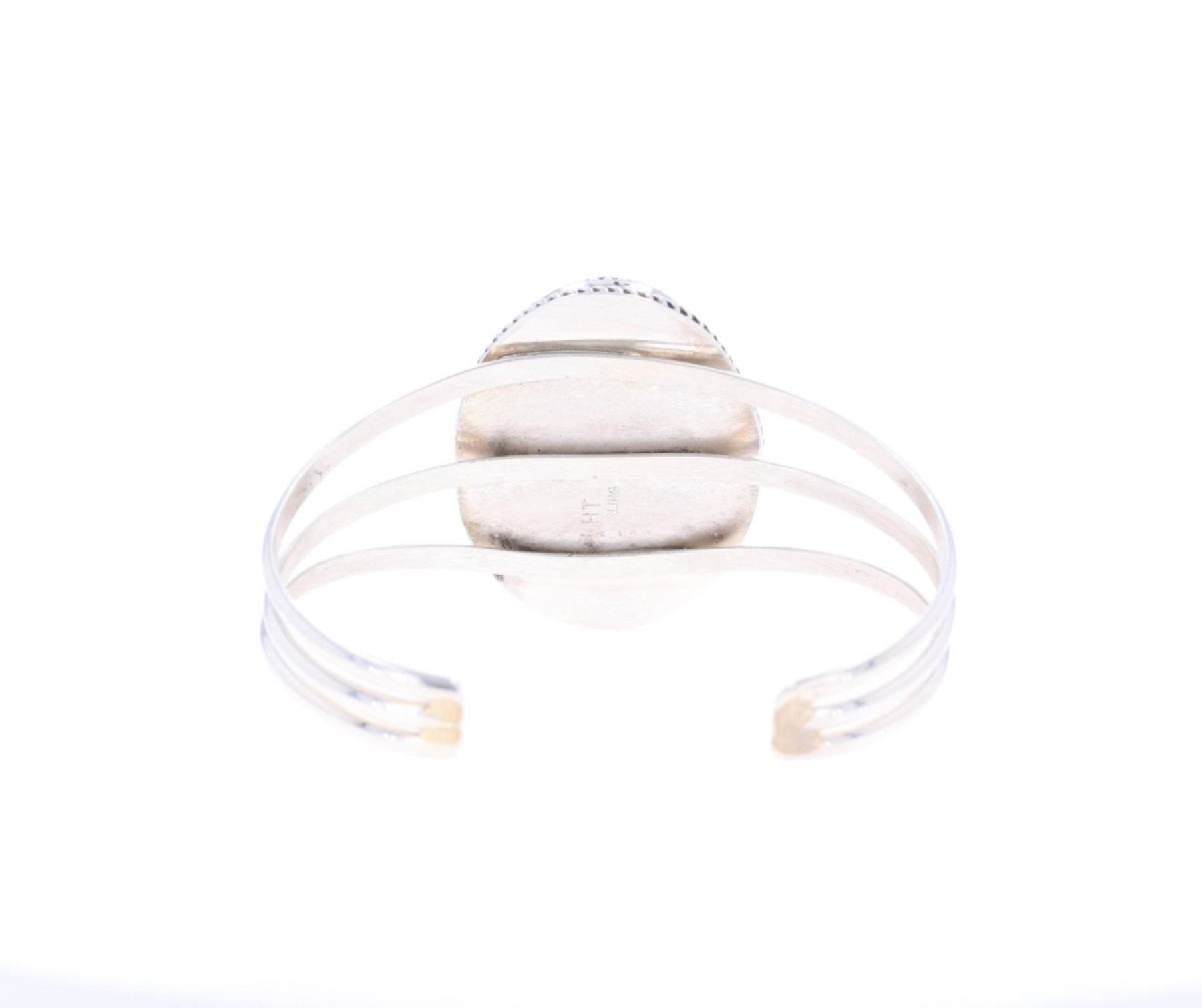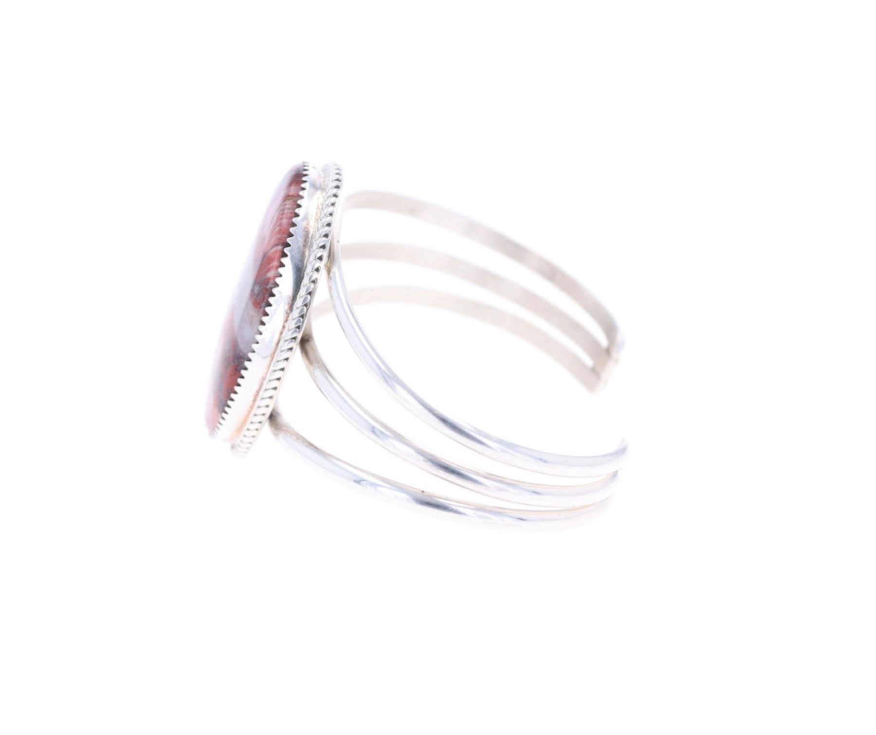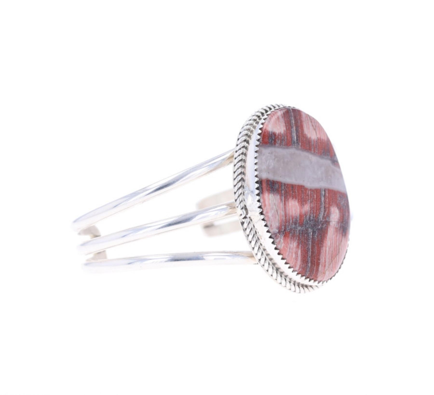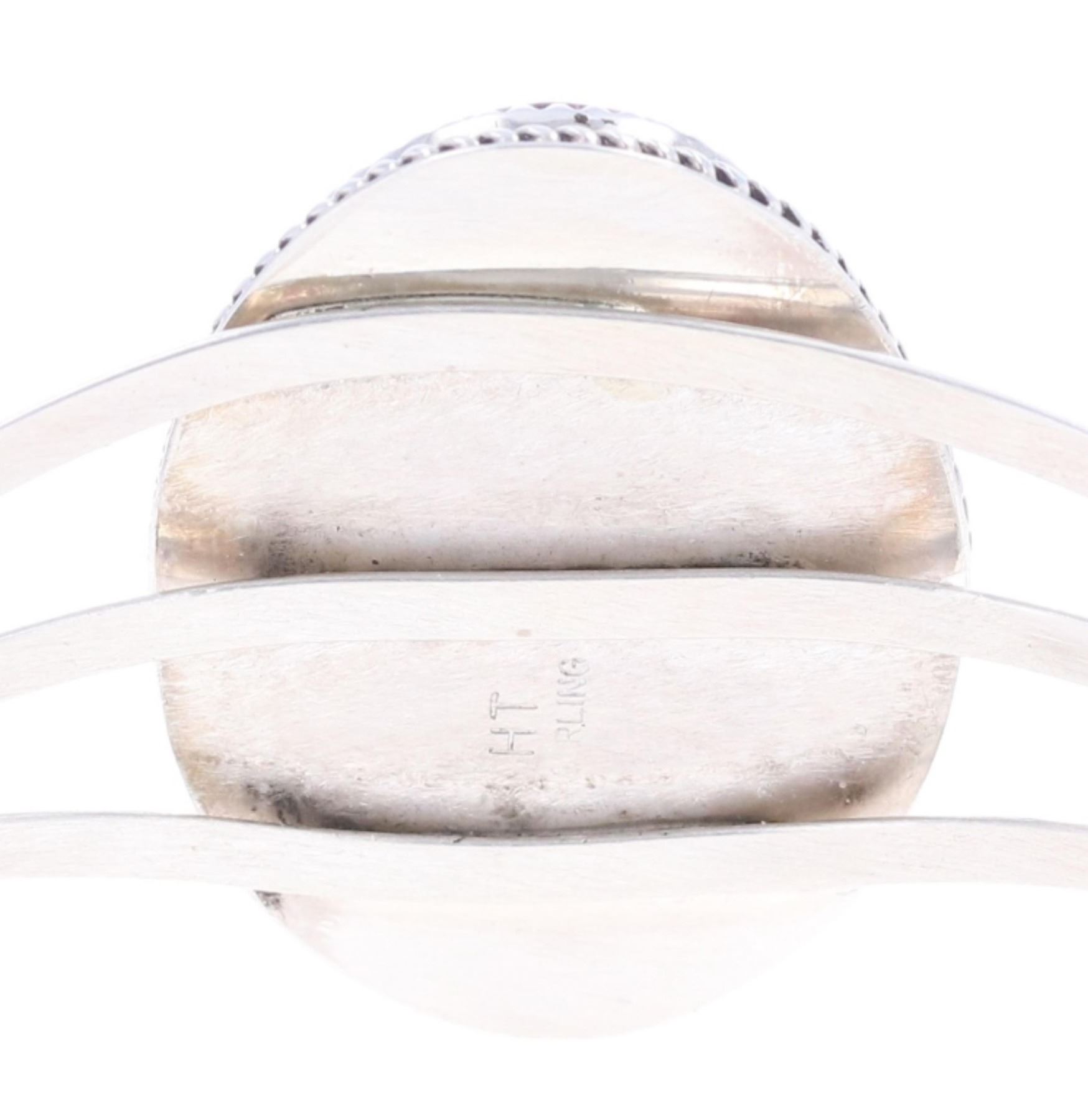 Featured in this lot is this sterling silver striped red jasper bracelet from Navajo artist Herbert Tsosie. The bracelet features a wonderfully and professionally crafted sterling silver construction that shows a twisted rope border with a triple split frame and a large oval striped red jasper cabochon set into the face of the bracelet. The underside of the bracelet is marked as follows: HT - Sterling. The condition of this Navajo bracelet is good with no obvious signs of damage and shows good overall condition. The overall measurements of this bracelet is 2" x 2 1/2" x 1 1/2" and the internal measurements of this bracelet is 4 3/4" from tip to tip and the gap measures 1". The collective weight of this bracelet is 30.4g.