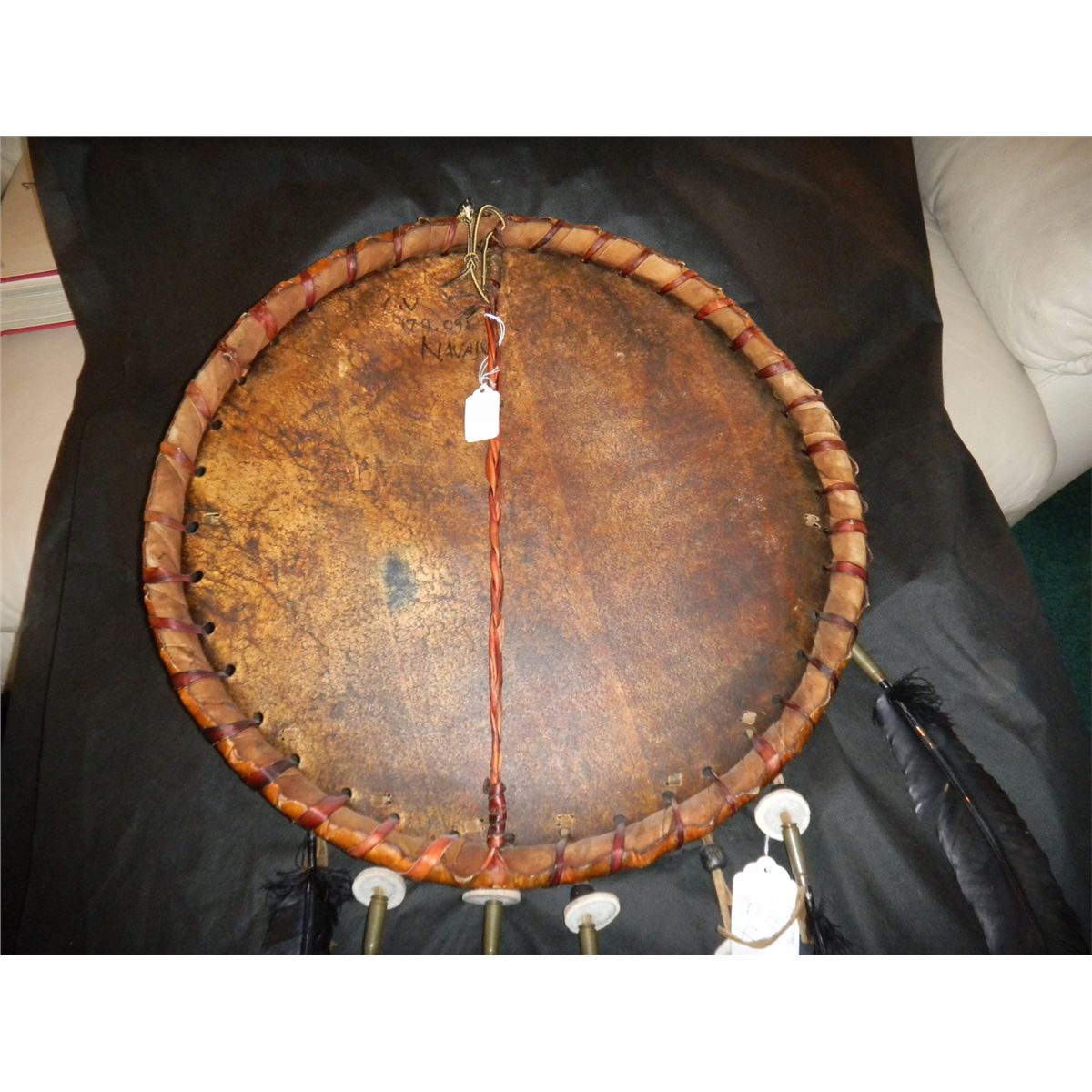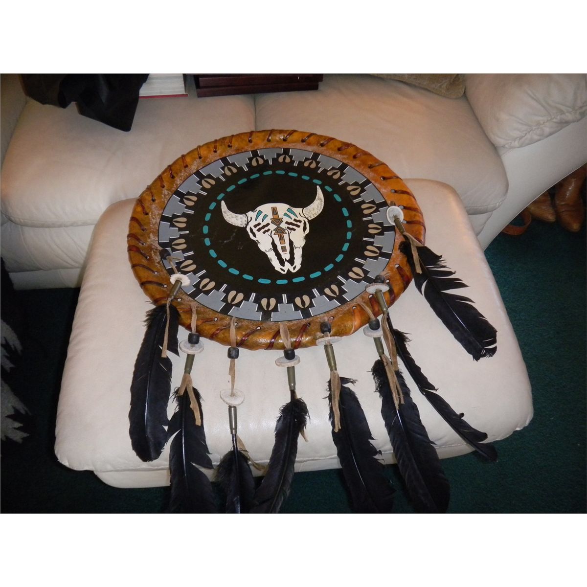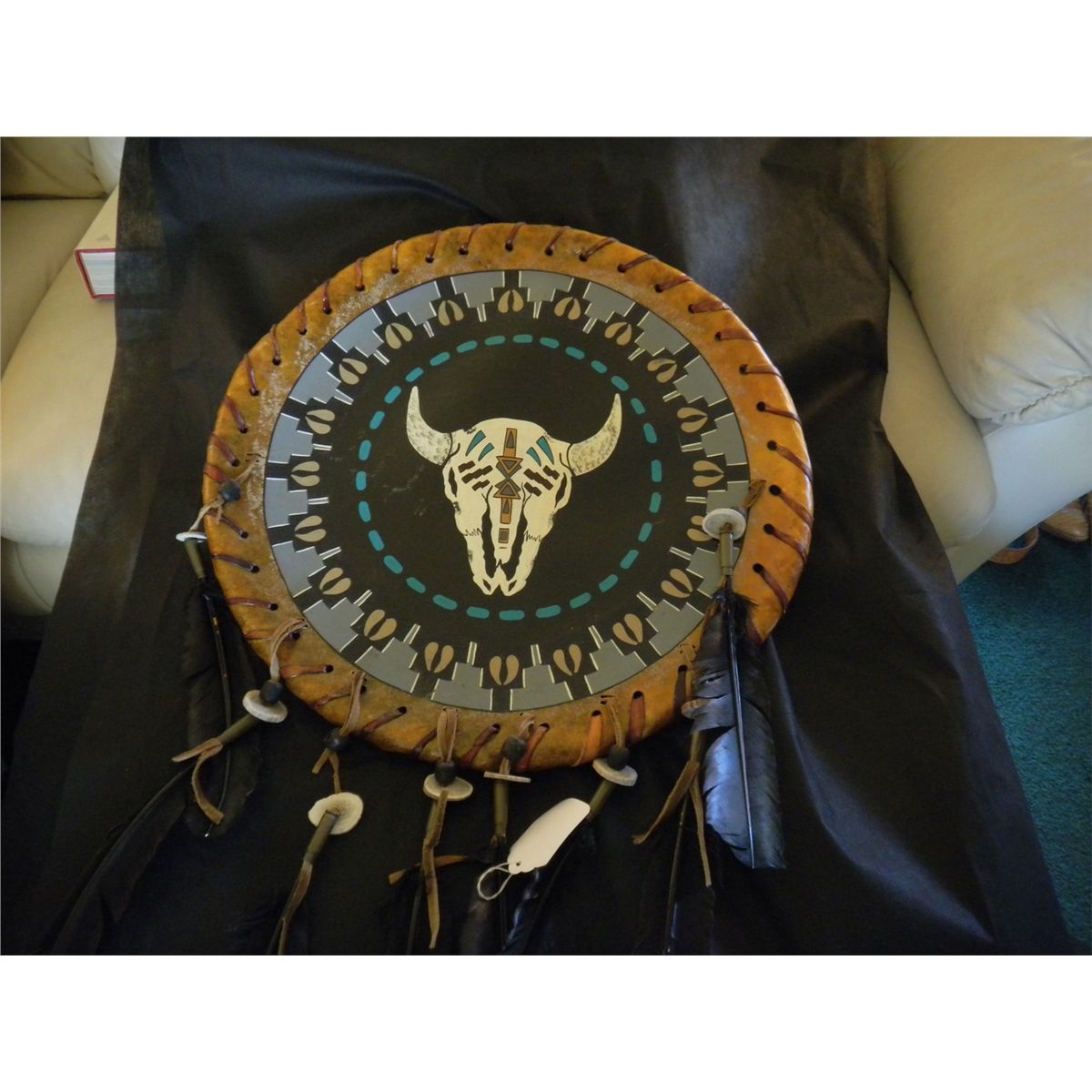 Navajo Leather, elaborately painted dance shield with horn and antler and feather design, with shell 30 caliber shell casings. 20"x2-"x1" excluding the feathers