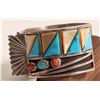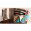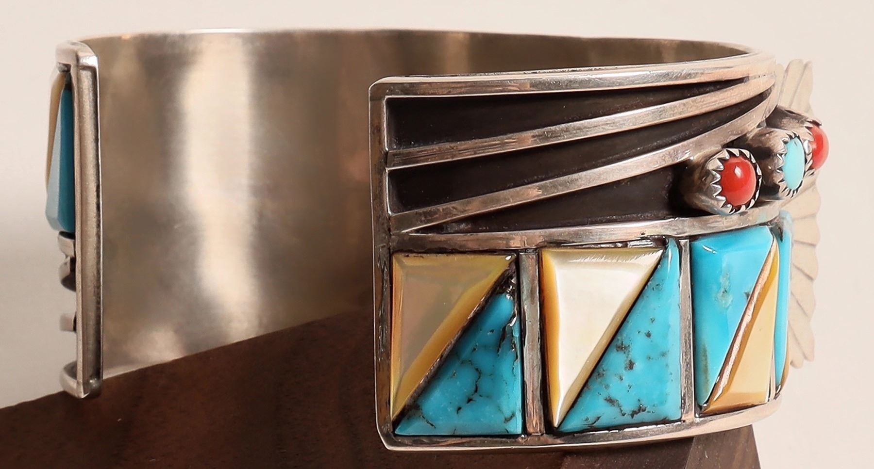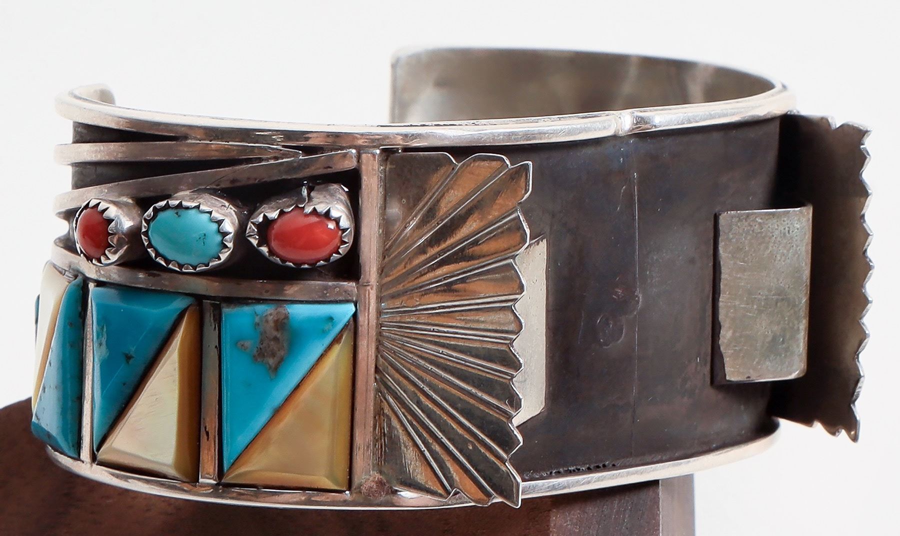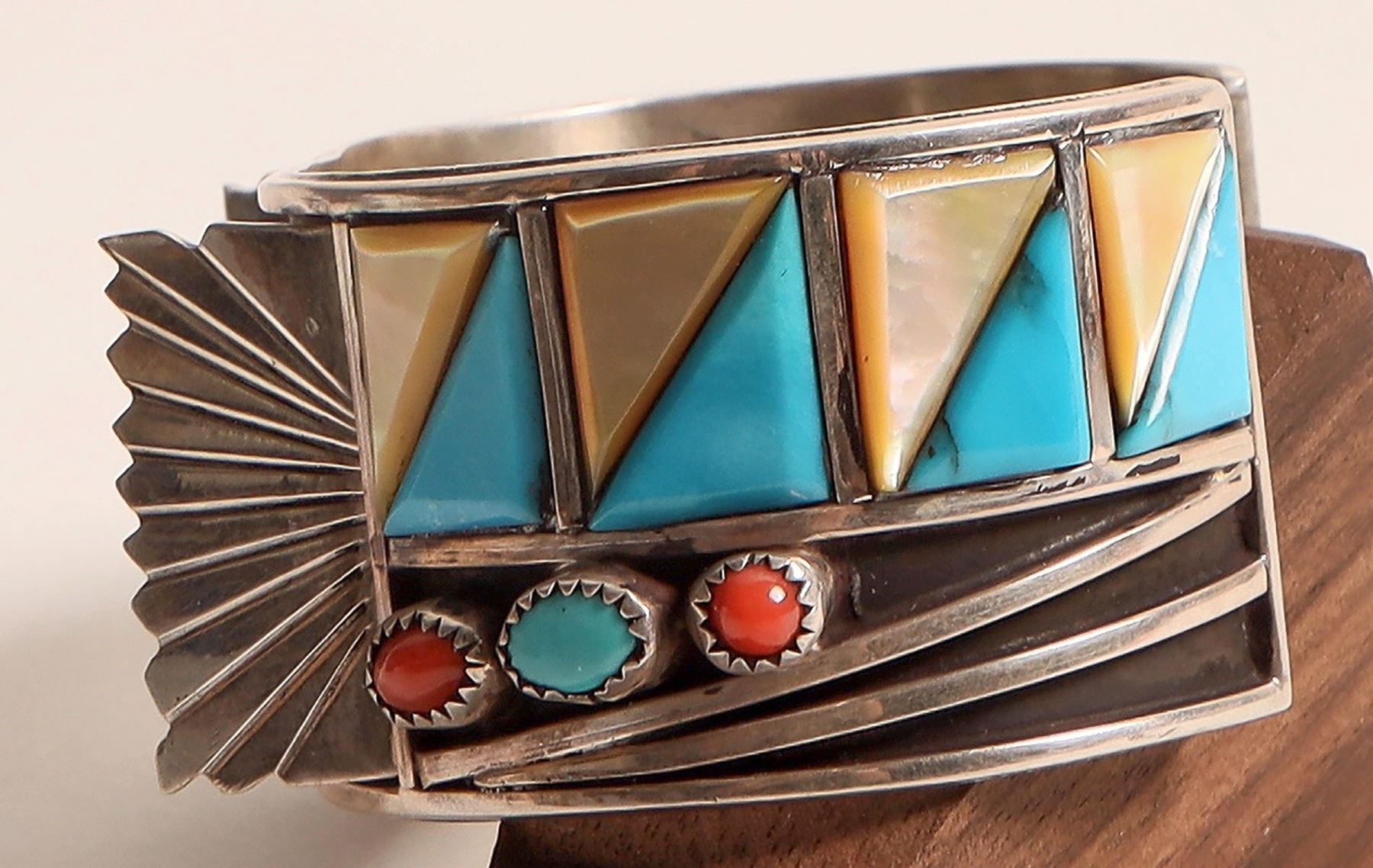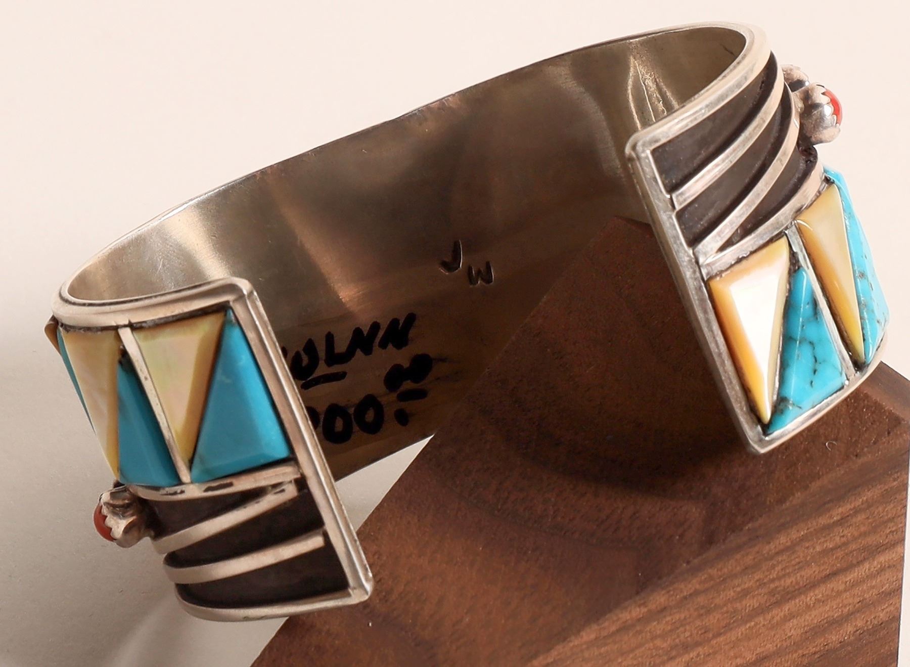 Navajo High Quality Watch Bracelet with Turquoise, Coral, and Gold Lip Mother of Pearl, signed JW. Exquisite! Frank Lewton Collection 1970's. [] [] [] [] []
