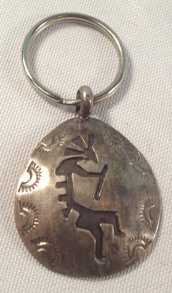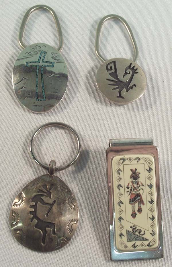 Native American Navajo & Hopi 3 Key Chains 1 Money Clip. Money clip has kachina and snake, measures approx. 2''L x 7/8''W. Key chains have Kokopelli, Cross and road runner. Key chains measure approx. 3''L x 1''W.