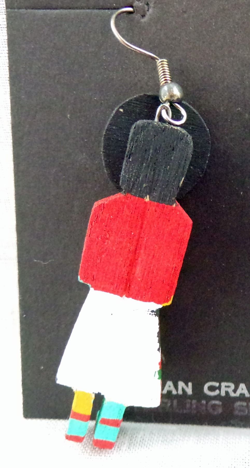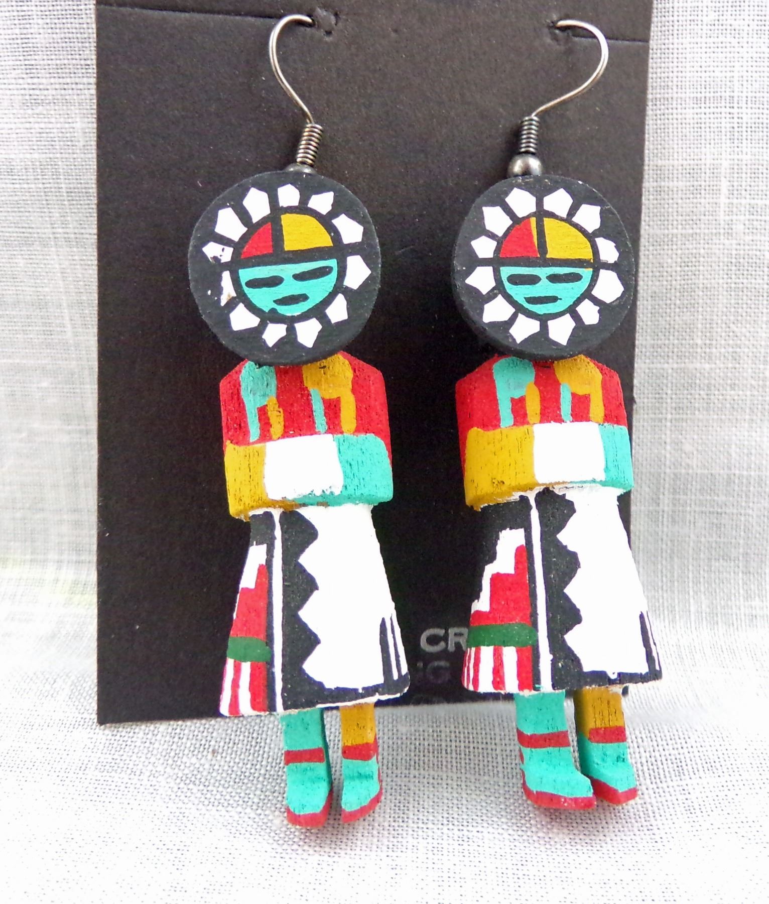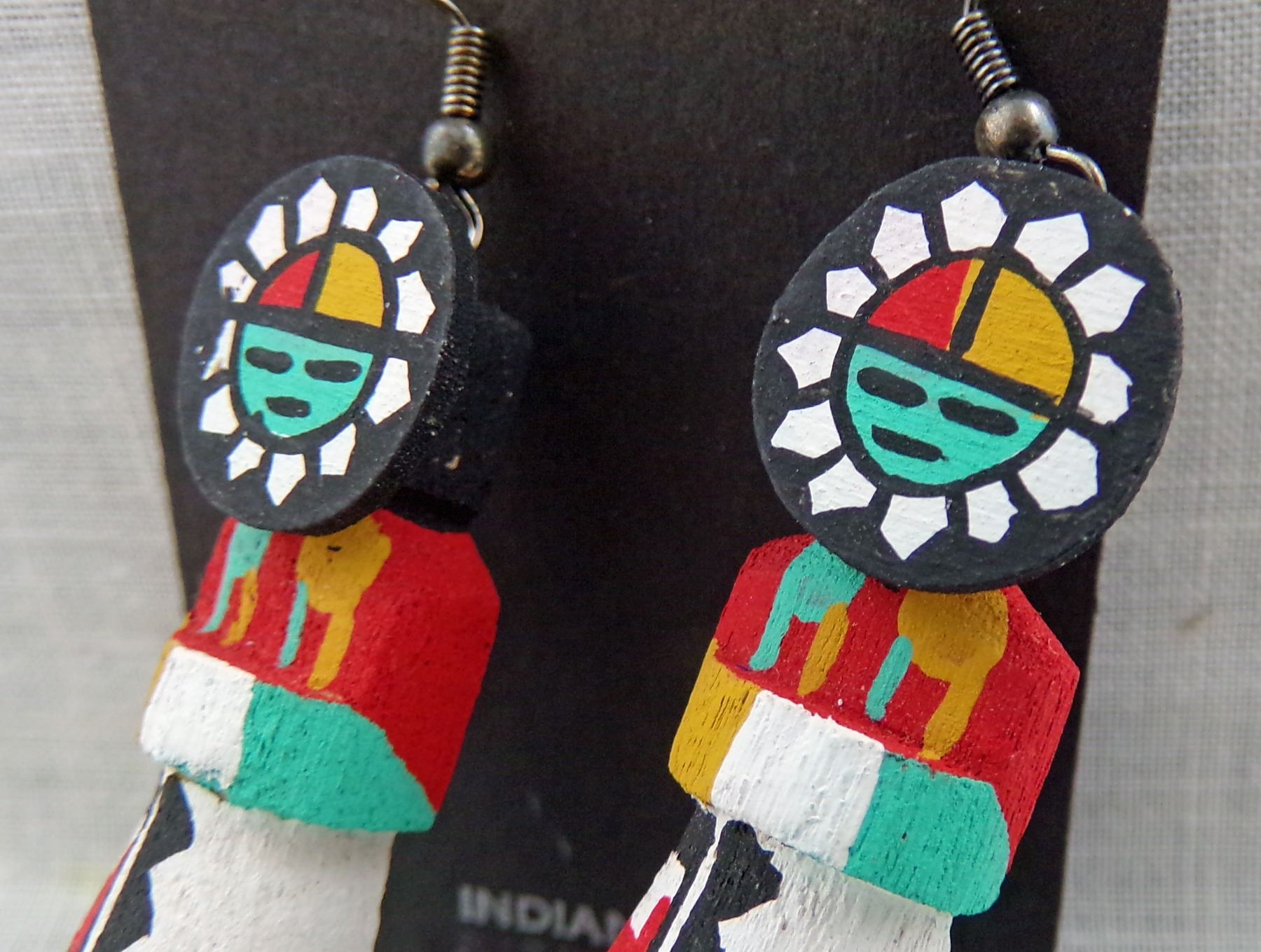 Native American Navajo Hopi Carved Wood Sun God Kachina Earrings by L. Martin (I really think they are by Loretta Multine), measures 2.5''L which includes the wire and are signed on the back