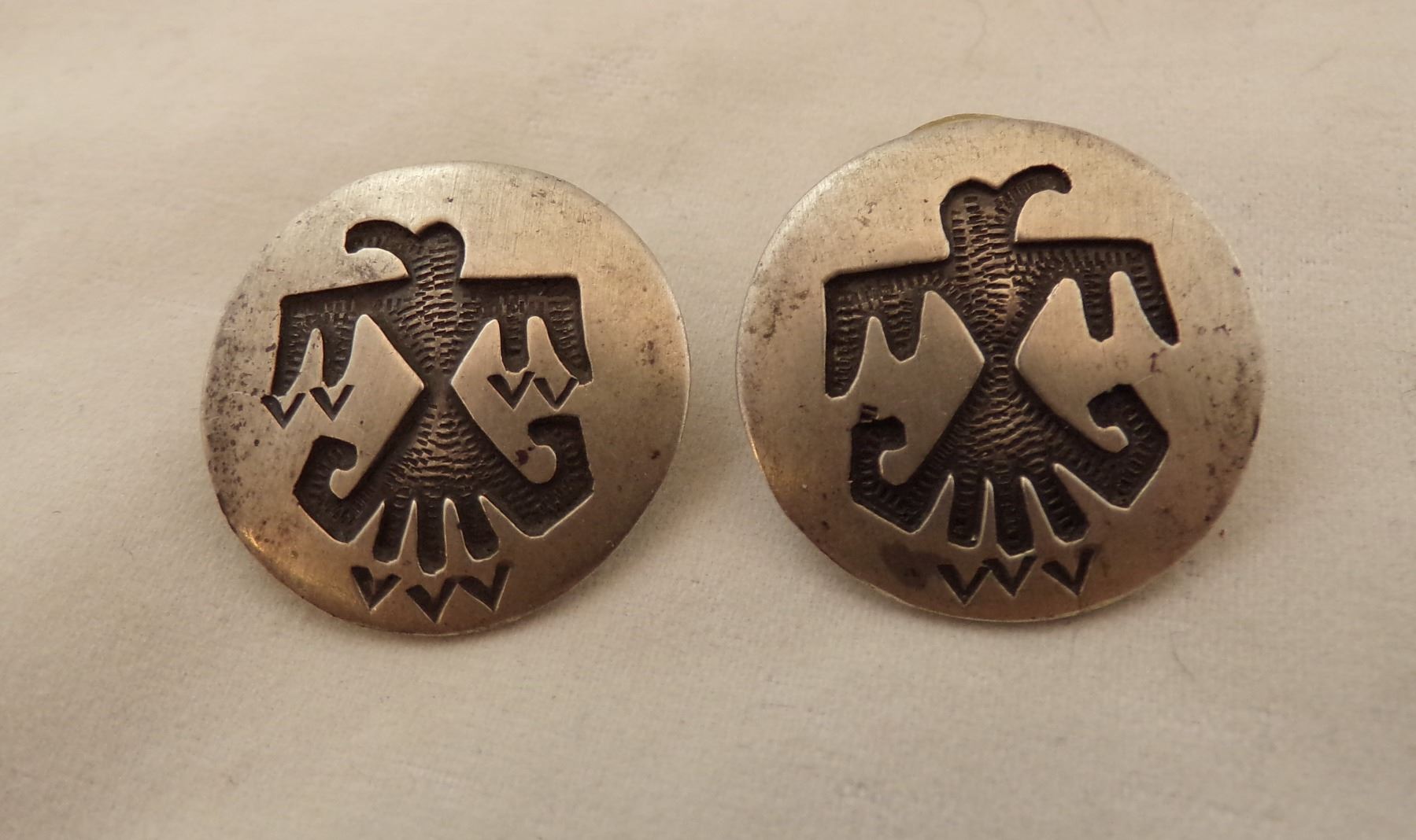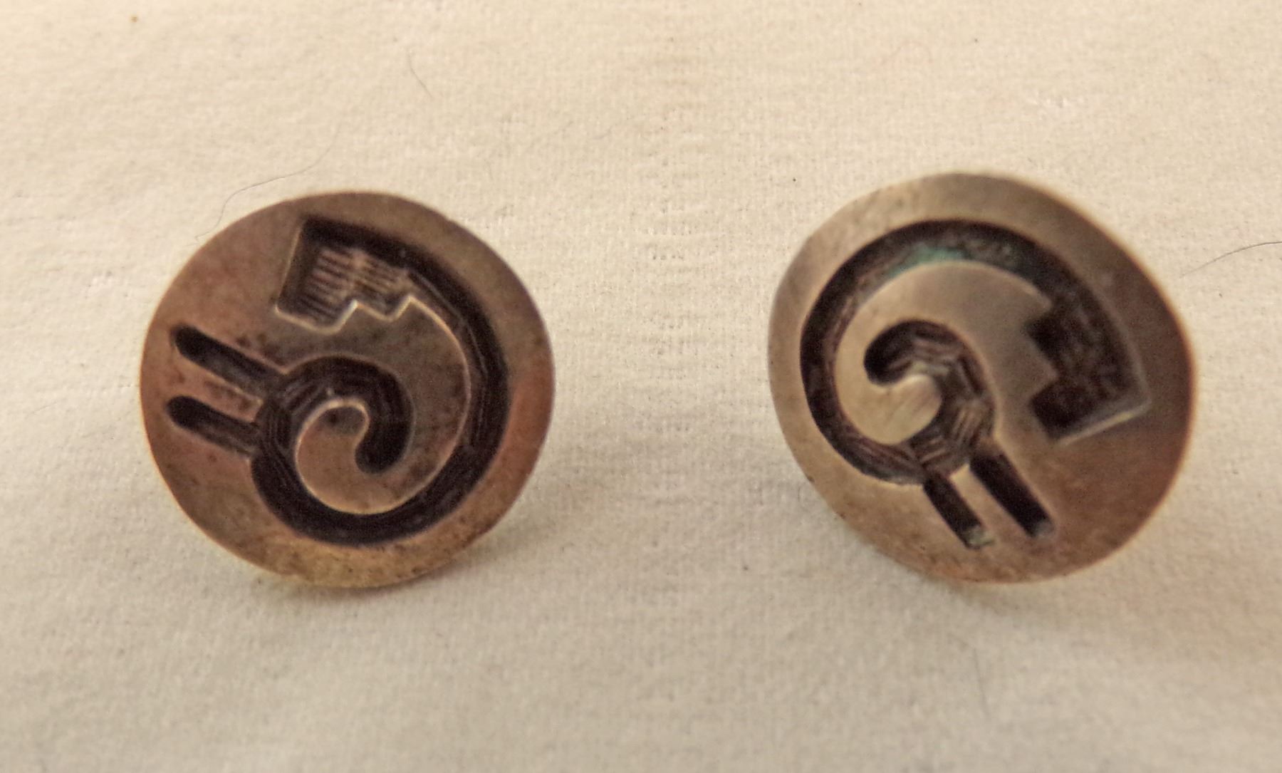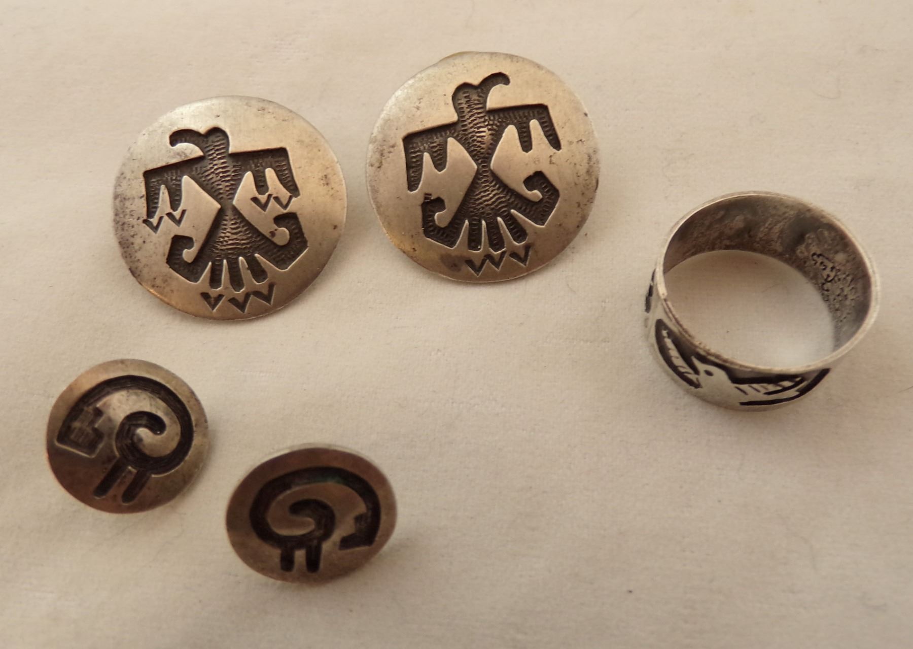 Navajo, Hopi, and Taxco Jewelry, includes 1. Taxco Ring, size 7.5 and measures 5/8''W, hallmarked and stamped .925 2. Hopi Post Earrings, measure .5''D 3. Navajo Thunderbird Post Earrings, hallmarked T and stamped sterling