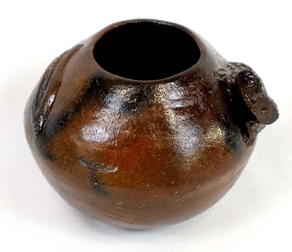 Native American Navajo Horned Toad Pottery Seed Jar by Larrisena S. Blackgoat, measures 4.5''D x 2.75''H, corn and horned toad motif, artist's initials on the bottom