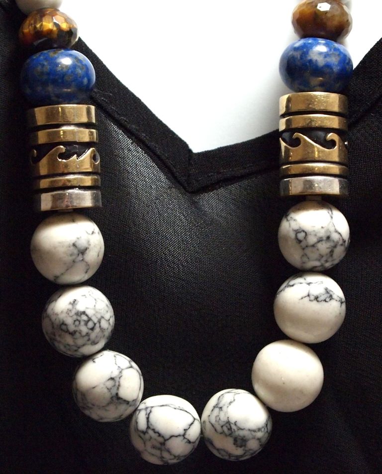 Measures 29" around by from 1/4" to 9/16" wide. Stones present: Howlite, 12k Gold Fill & Sterling Silver Beads, Denim Lapis Lazuli, Turquoise, Rhodochrosite, Tiger's Eye, Onyx, Sugilite.