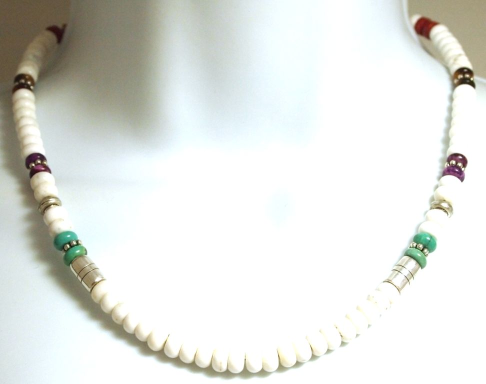 Measures 18" around by 1/4" wide. Stones present: Howlite, Sterling Silver beads, Tiger's Eye, Spiny Oyster, Turquoise.