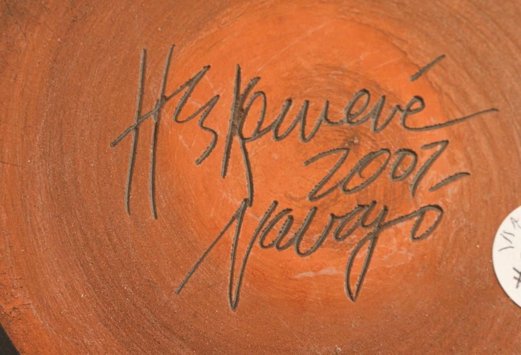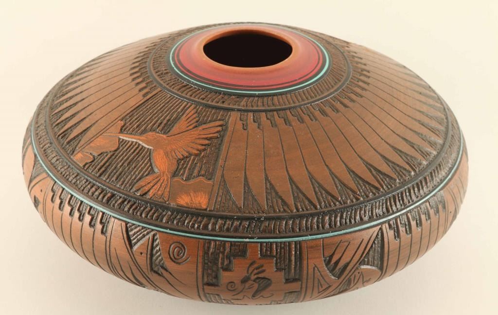 This beautiful incised carved pot shows lone hummingbirds on opposite ends and geometric designs with hints of blue in the rigs while it is mostly colored orange and black. The pot measures 12" wide and 5" tall.