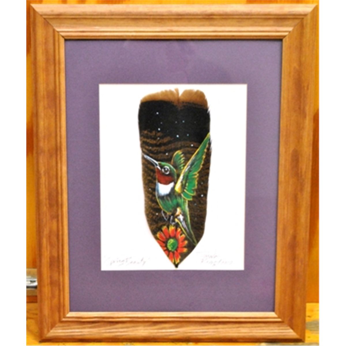 Painting is titled "Spring Beauty". Frame measures 15-1/2" tall by 12-1/2" wide. Feather measures 8-1/4" tall by 3-1/4" wide.