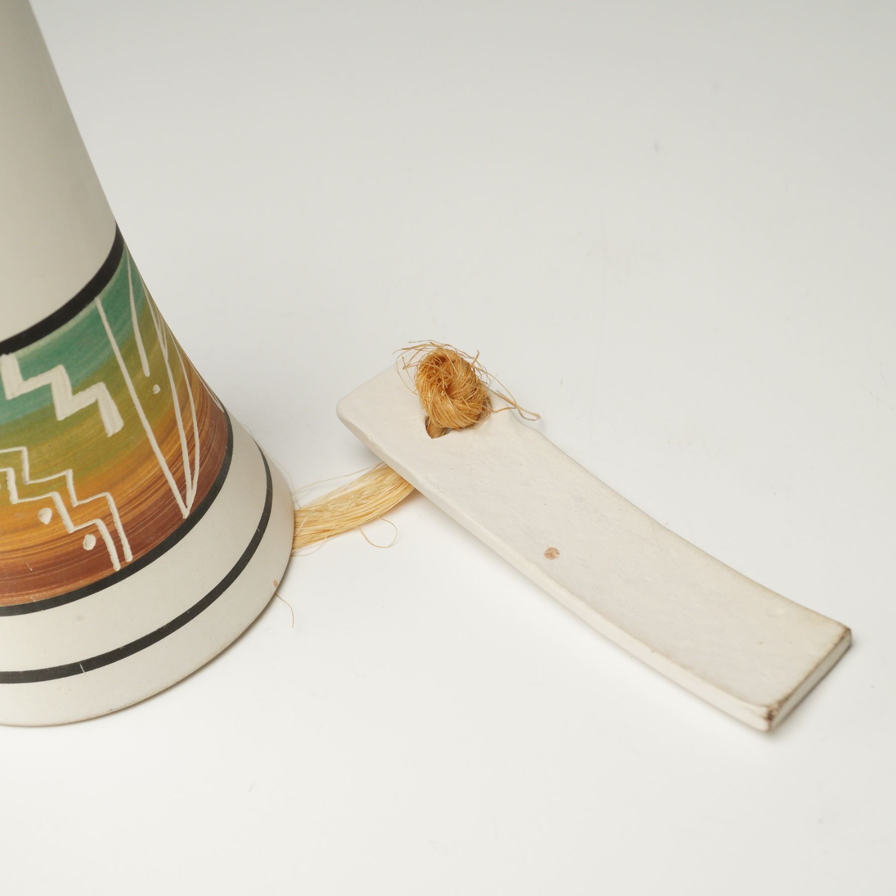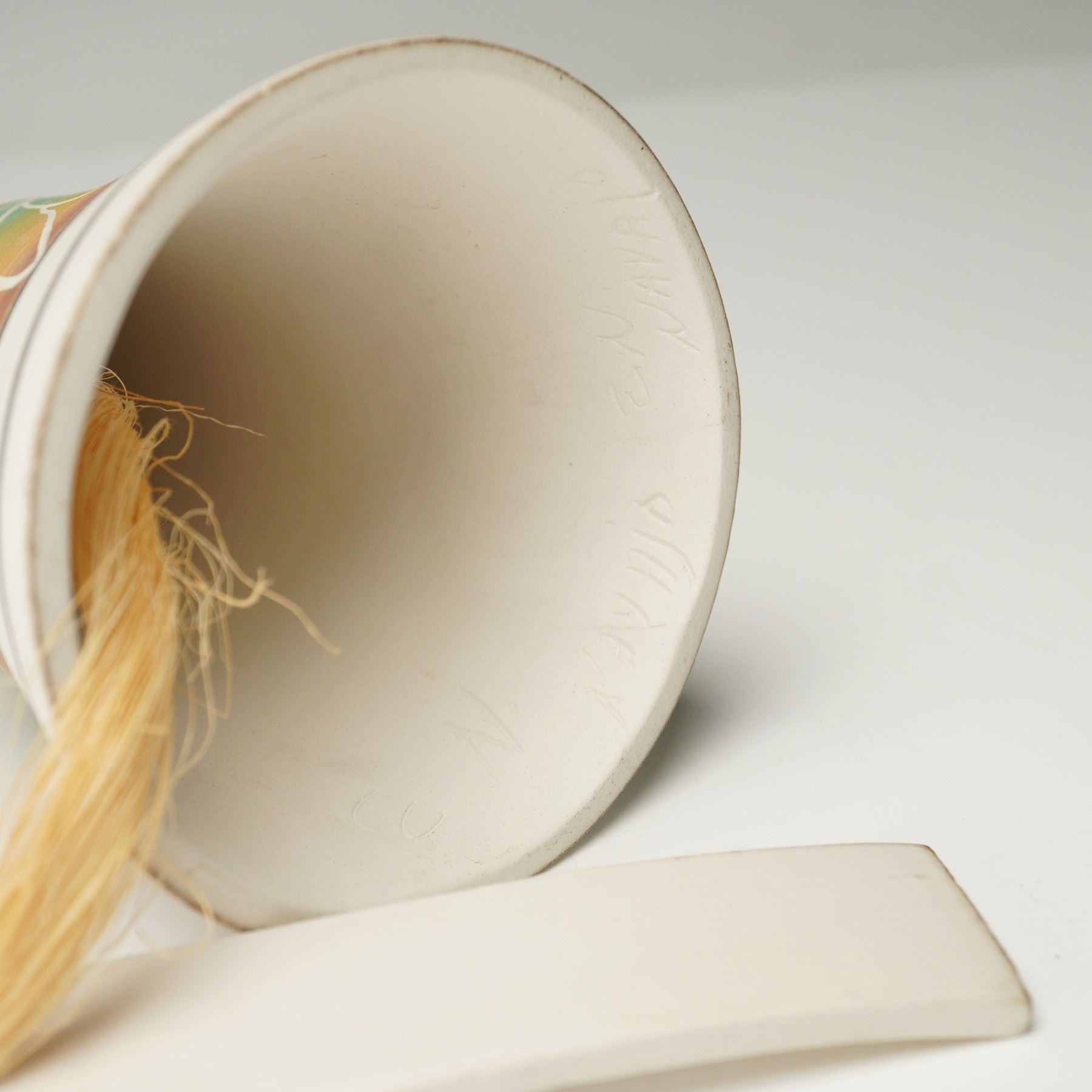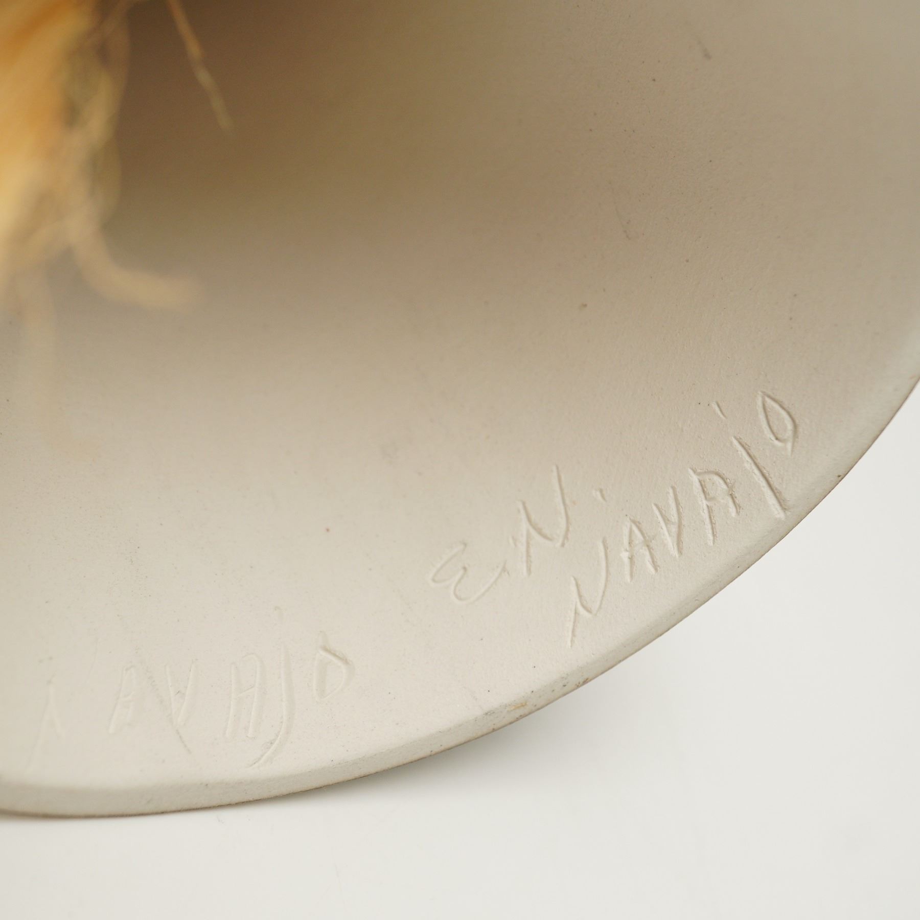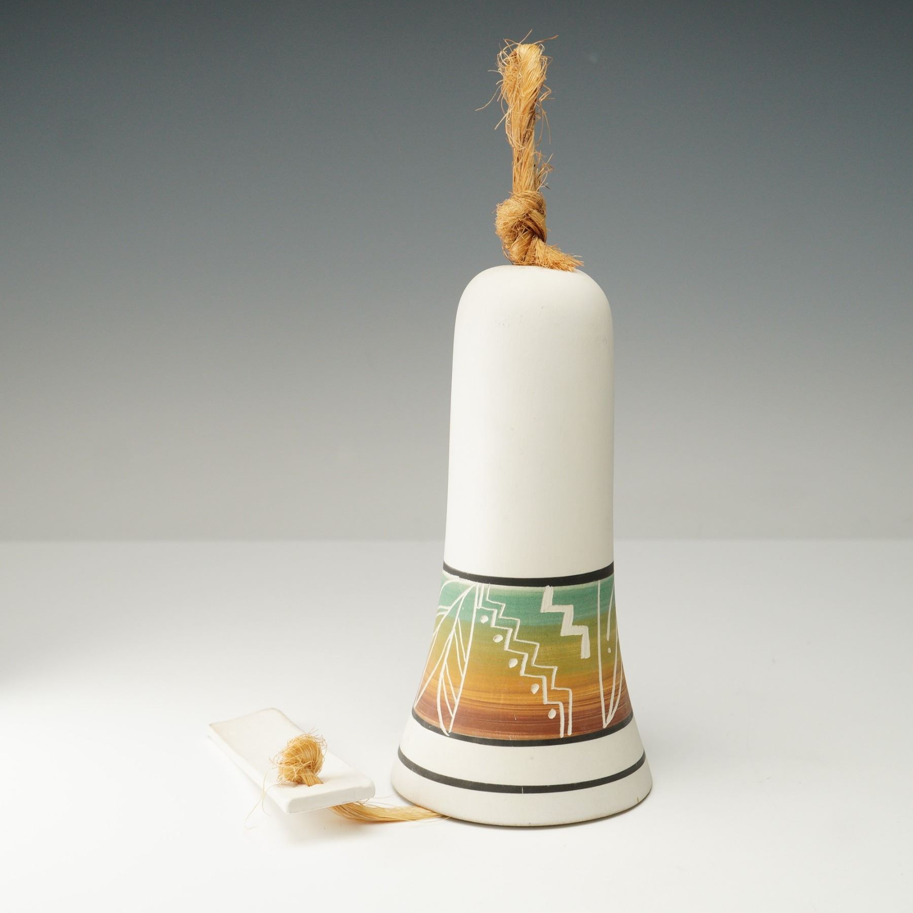 Handcrafted Navajo pottery bell with a matte white surface, decorated with a band of incised geometric and leaf motifs over a multicolor gradient ground in warm earth tones. The bell features a rope handle at the top and includes its clay clapper attached with fiber cord. The underside is incised and signed EN Navajo, indicating Navajo artisan origin.