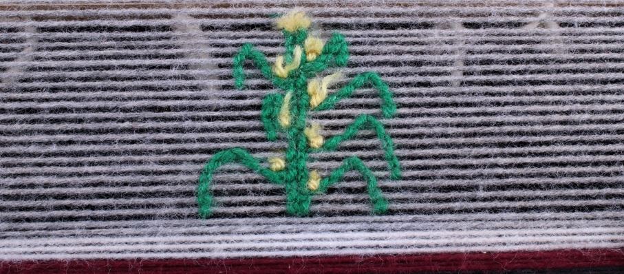 Featured in this lot is Navajo decorative wooden loom. These looms were used to weave rugs, clothing, and other accessories. This piece features two Native American women figures on each side of the loom, which shows the makings of a handmade rug. The top of the loom is marked "God Bless Our Home" and the frame is decorated with black and gray poms. The piece also includes various colorful patterns and shapes. It is measured 20" tall by 18" wide and is in good condition.
