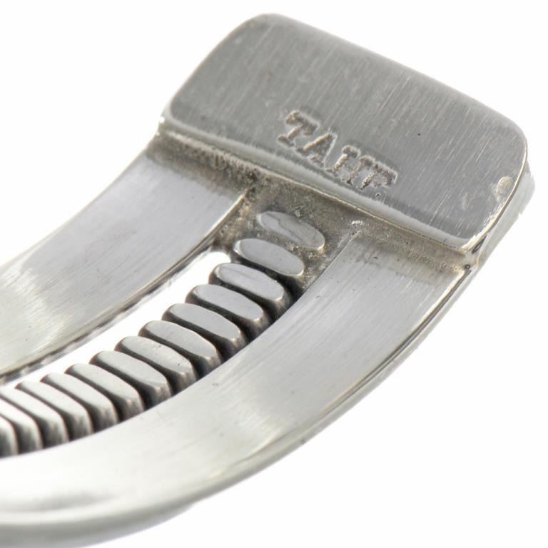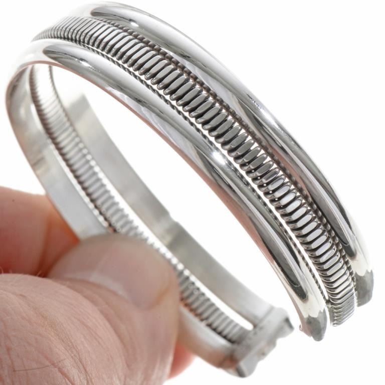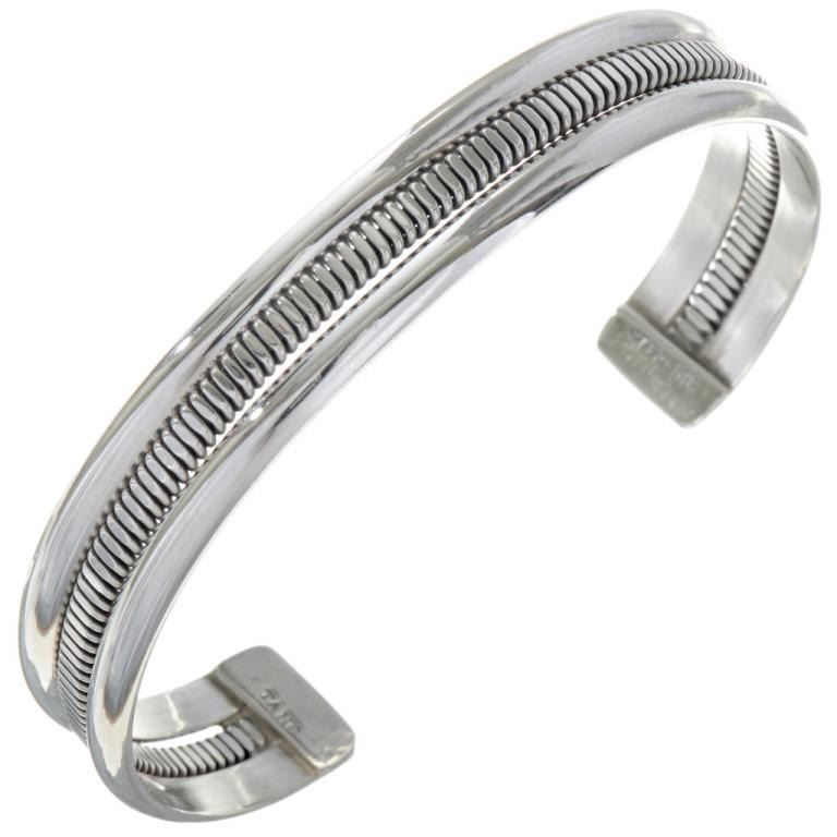 At the center of this all Sterling cuff is a vertical, hand coiled wire edged in smooth, half round bands. About 1/2" wide for a man or woman. Stamped Sterling and hallmarked by Native American Elaine and Verna Tahe.