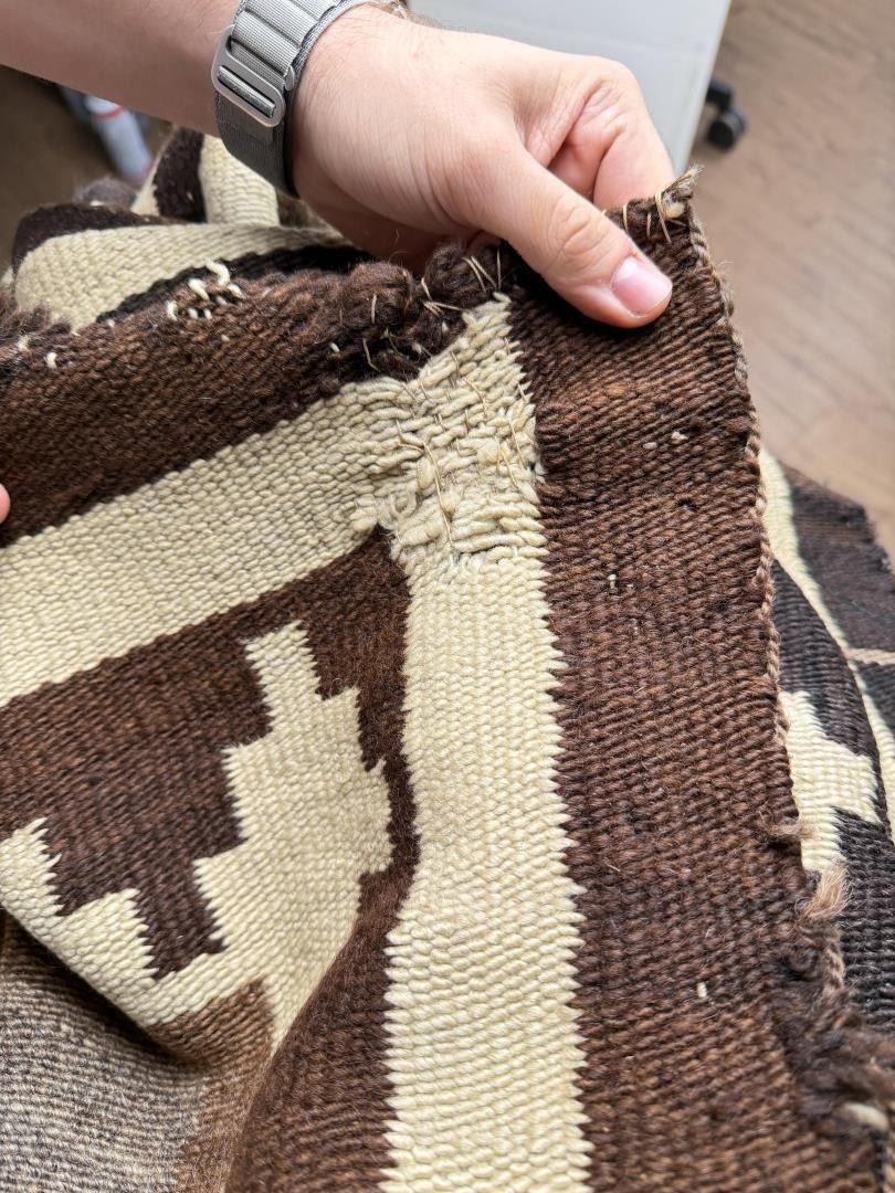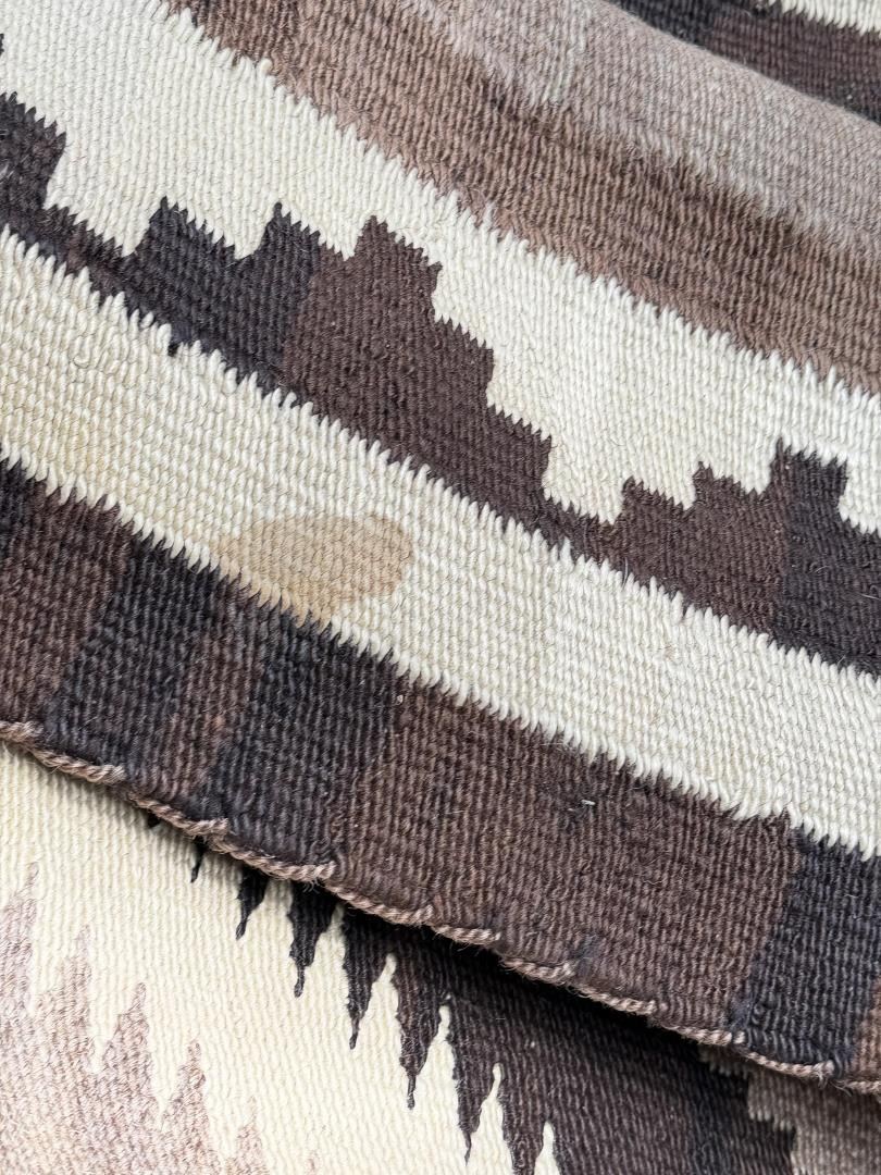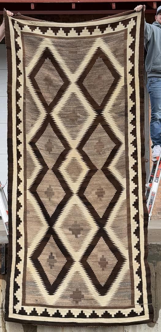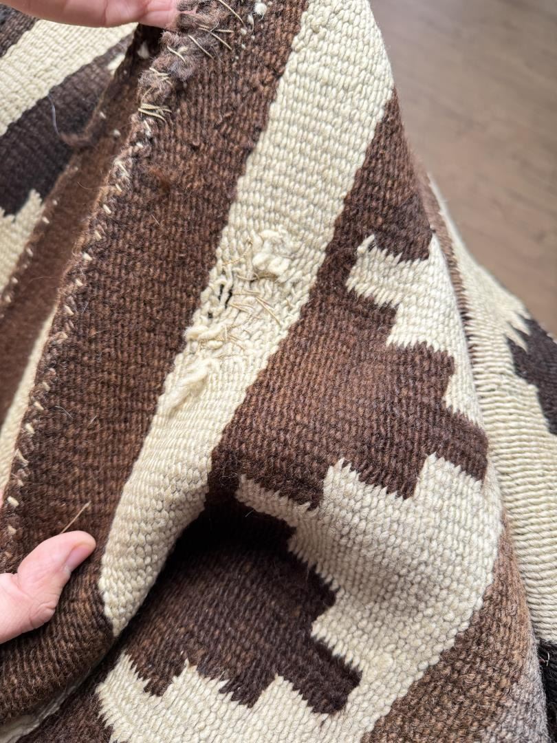 121 1/2" long by 60" wide. Some damage and repair to side weaving, small stain on white portion of weave.