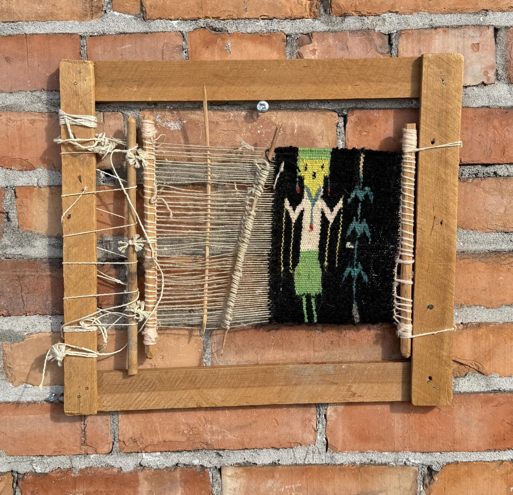 Unfinished on loom. 17 1/8" by 14 1/8".
