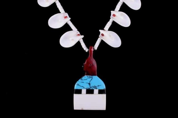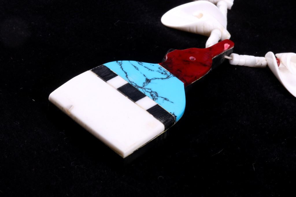 Offered in this lot is a Navajo shell necklace with an inlay stone pendant. The necklace is made of heishi cut shells and pieces of spiral shells set with a Red Coral beads. At the point of the necklace is a pendant made of a mosaic of inlaid stones including, Jasper, Sleeping Beauty Turquoise, Magnasite, and Red Matrix Jasper. The necklace is strung on twine. The necklace measures 30".