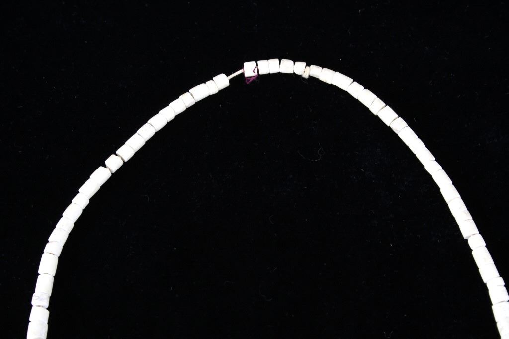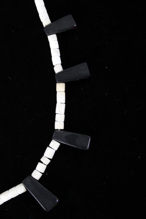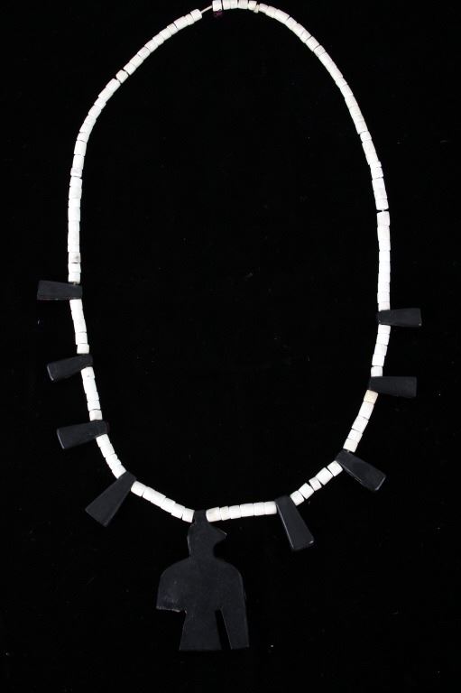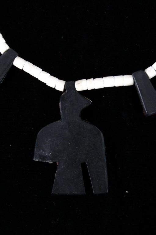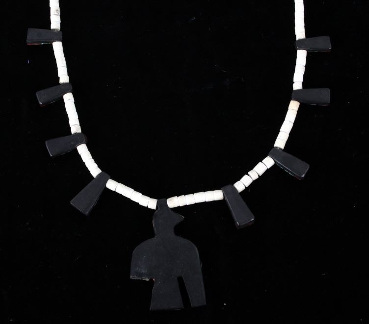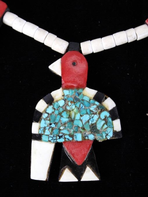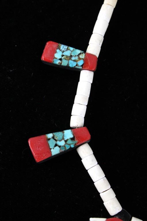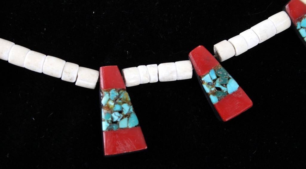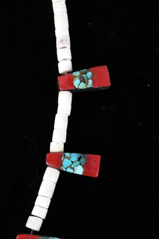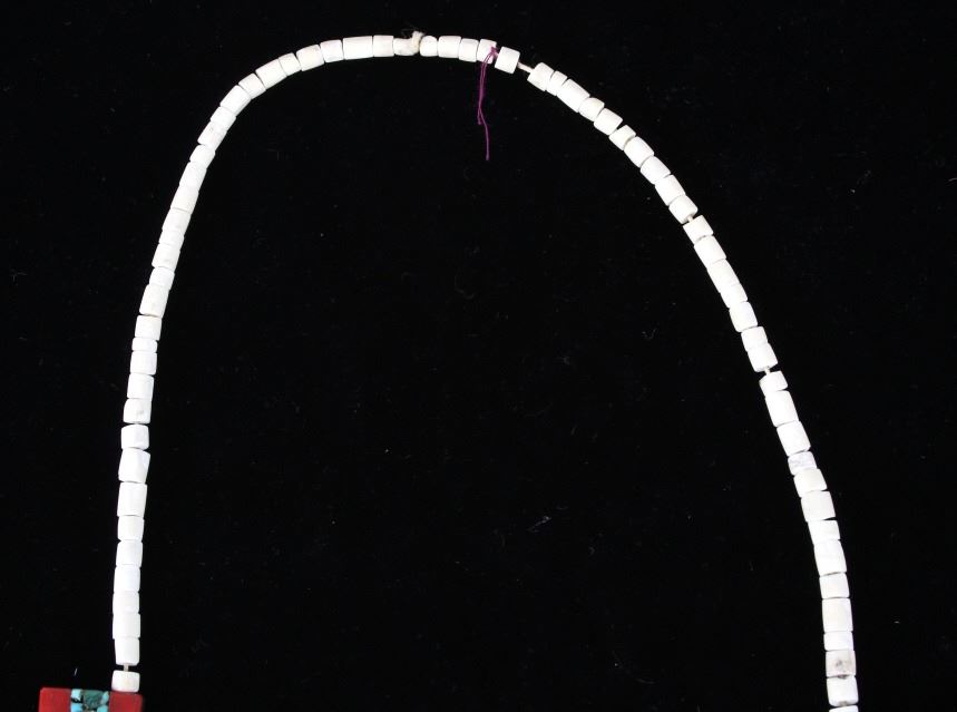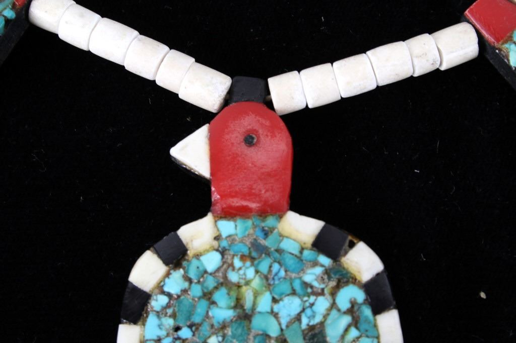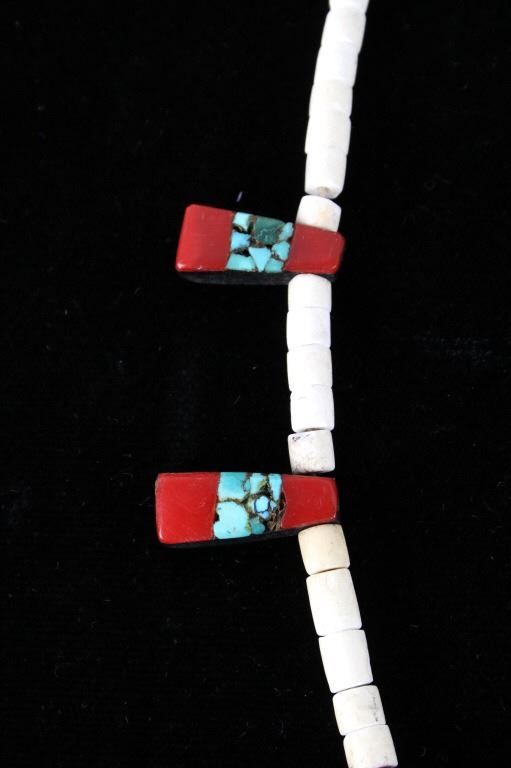 Featured in this lot is this Navajo inlaid thunderbird bone necklace circa 1930's. The necklace features a wonderfully and professionally crafted chipped inlaid and bone construction with a thunderbird effigy as the pendant that shows catlinite base for the beads and the pendant showing inlaid turquoise and re branch coral with a bone decoration. The condition of this necklace is fair with a break to the right arm of the thunderbird but otherwise shows fair overall condition. The measurements from tip to the tip of the pendant is 15" and the pendant measures 2 1/2" x 1 5/8".