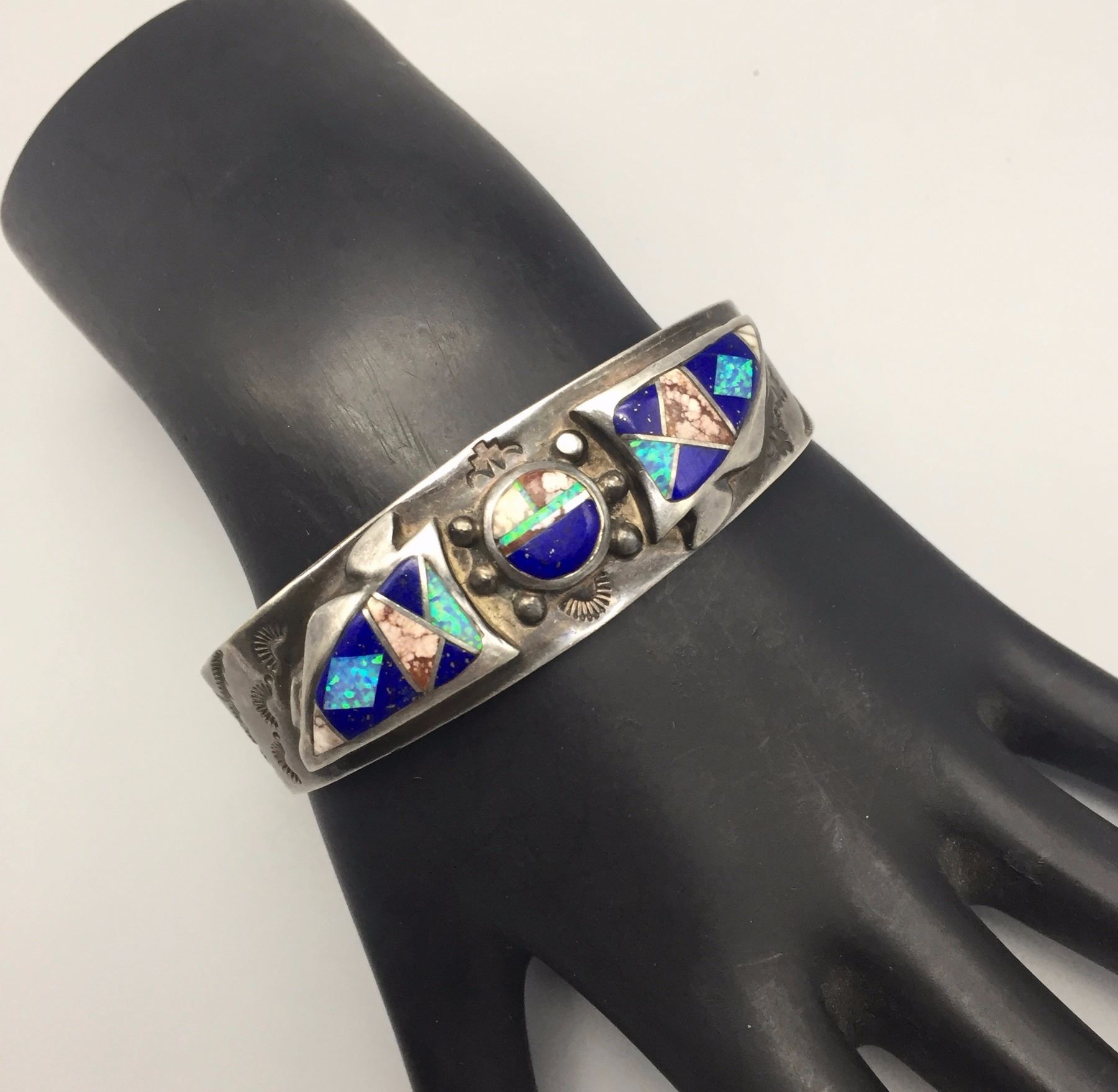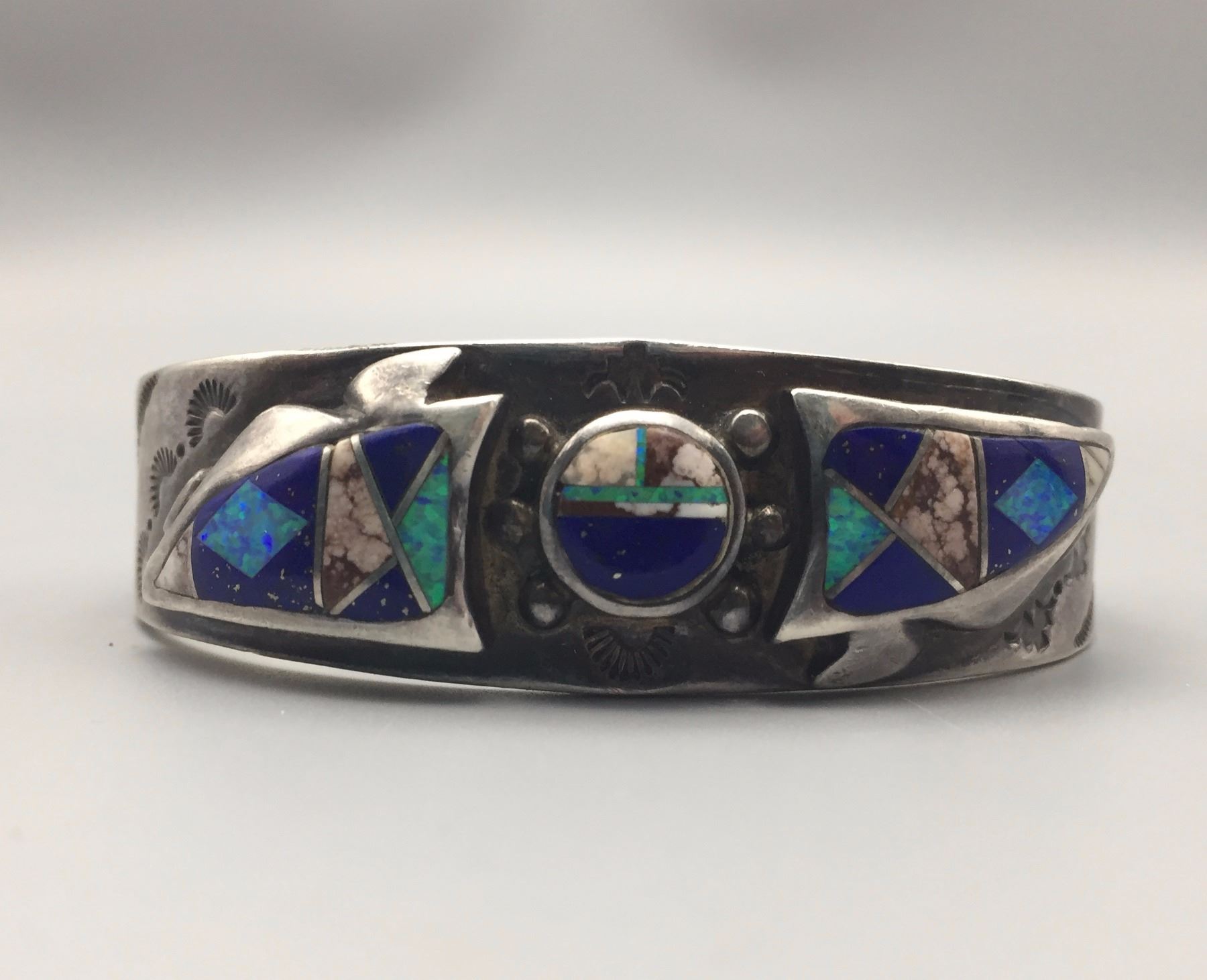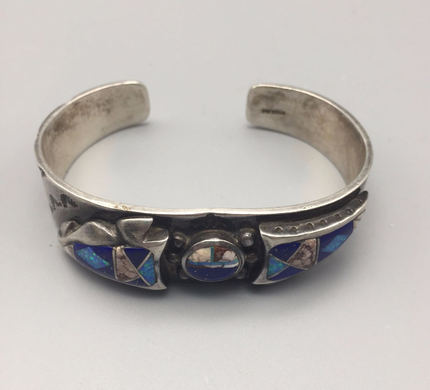 Maker: Hallmarked T. Benally, mark of Fernando Benally, Navajo. Approx. Age: Fairly modern. Size: Inside circumference measures 5 3/4” with an additional 7/8” opening (making it fit an approx. 6 5/8” wrist), 3/4” w and weighs 52.2 g. Additional Info: Lapis, opal, wild horse and sterling silver inlay bracelet. Nicely done. Condition: Good, normal wear expected. Please look closely at the pictures - they are an important part of our description. Shipping: There will be a $5 handling / packaging fee for shipping this lot. The actual cost of postage will be added on top of that.