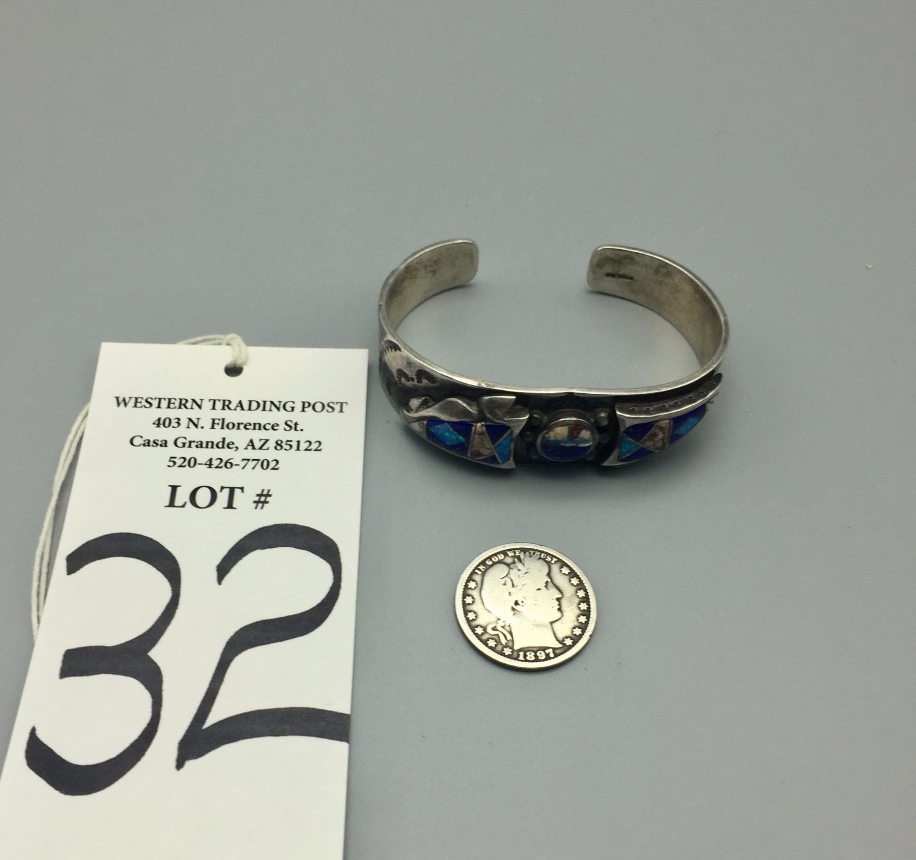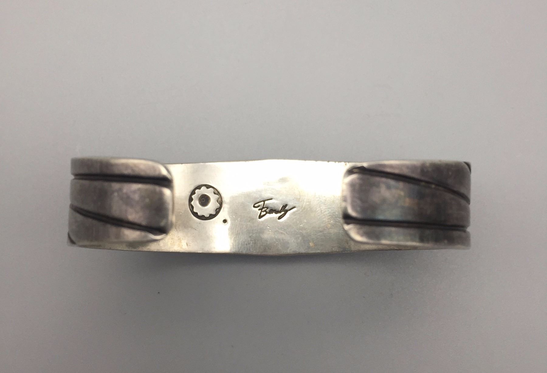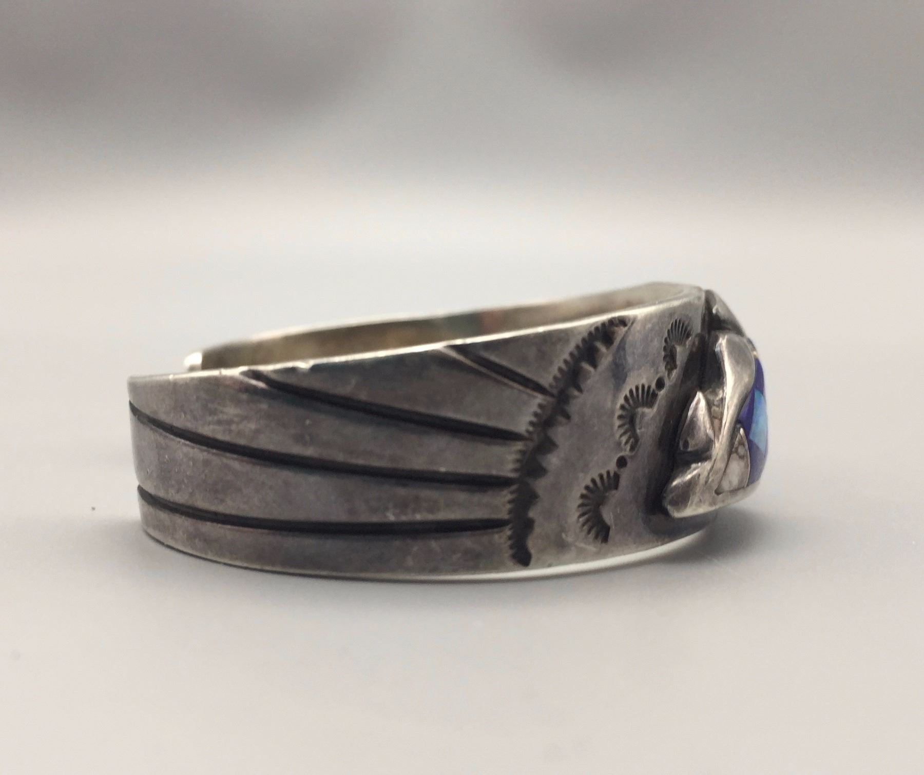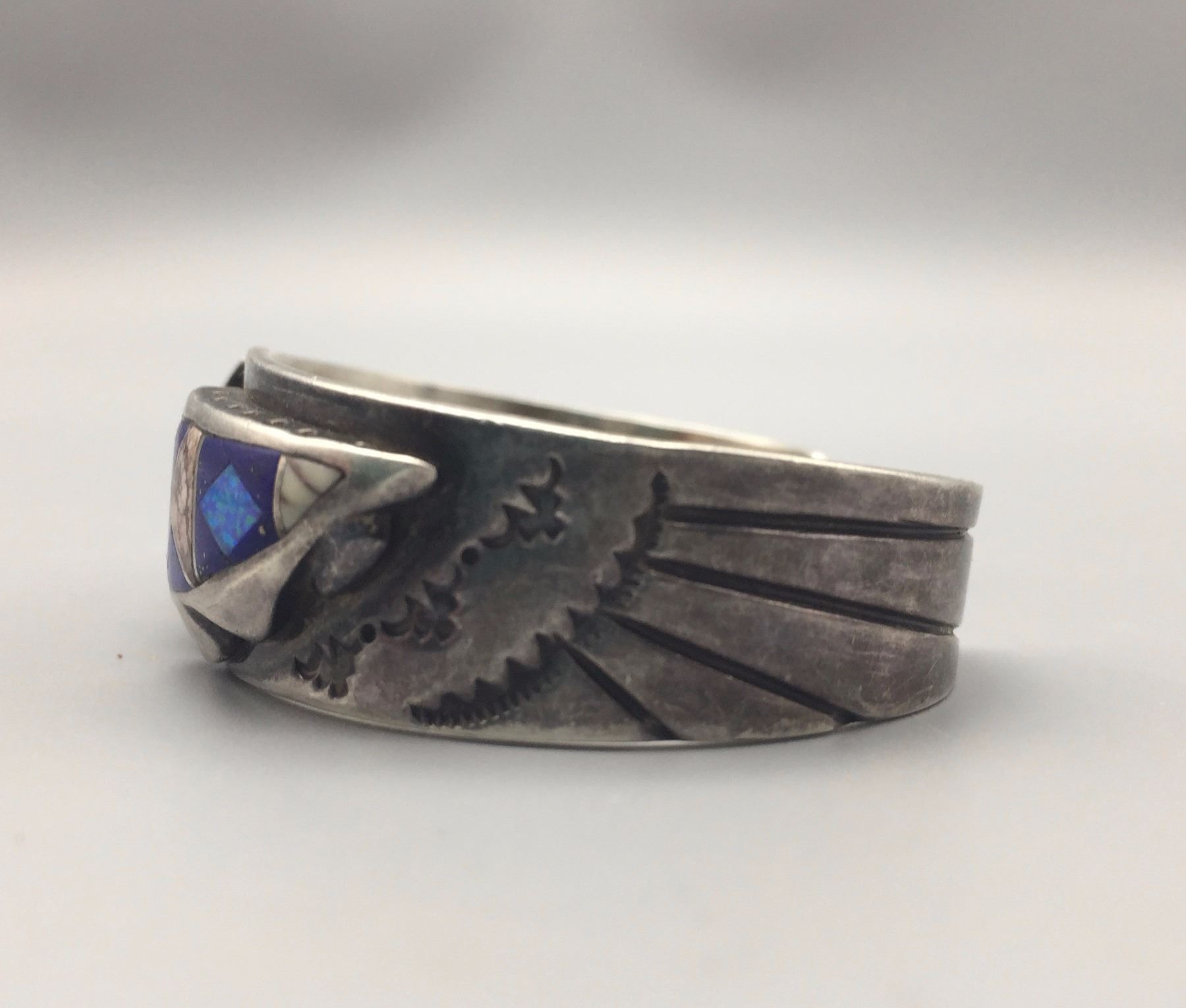 Maker: Hallmarked T. Benally, mark of Fernando Benally, Navajo. Approx. Age: Fairly modern. Size: Inside circumference measures 5 3/4” with an additional 7/8” opening (making it fit an approx. 6 5/8” wrist), 3/4” w and weighs 52.2 g. Additional Info: Lapis, opal, wild horse and sterling silver inlay bracelet. Nicely done. Condition: Good, normal wear expected. Please look closely at the pictures - they are an important part of our description. Shipping: There will be a $5 handling / packaging fee for shipping this lot. The actual cost of postage will be added on top of that.
