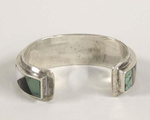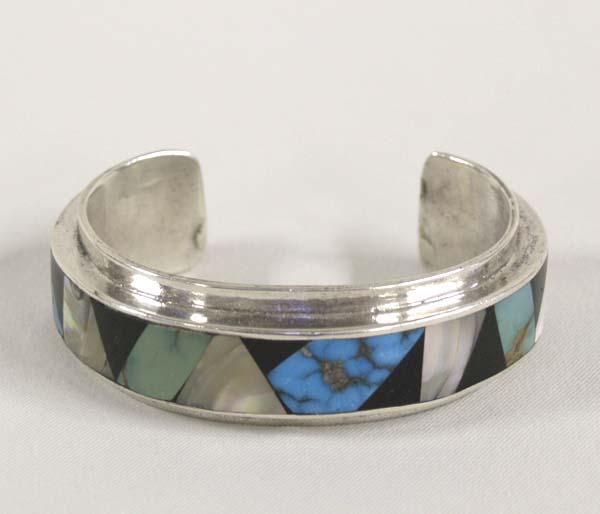 Navajo Inlay Bracelet Hallmarked. Inlayed with Mother Of Pearl, Turquoise, Jet and is a stone to stone inlay. Measures approx. 6''. SHI $15.