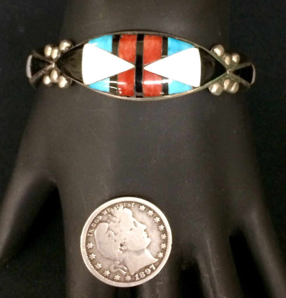 This sterling and inlay cuff bracelet is marked M. Benally. Tested as sterling silver. It measures 5.5” inside circumference plus there is a 1” opening. It is .5” at the widest point and weighs 24g