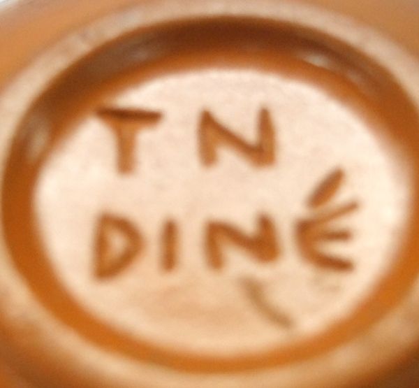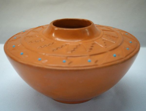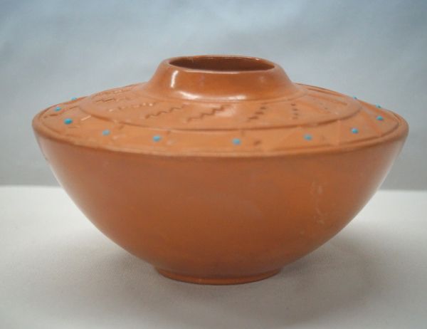 From the Tucson, Arizona Collection. Navajo Pottery Jar, measures 3.5''H x 6.5''D, embellished with inlay turquoise cabs 1/8''D, has carved stairstep cloud designs, signed on bottom TN Dine'