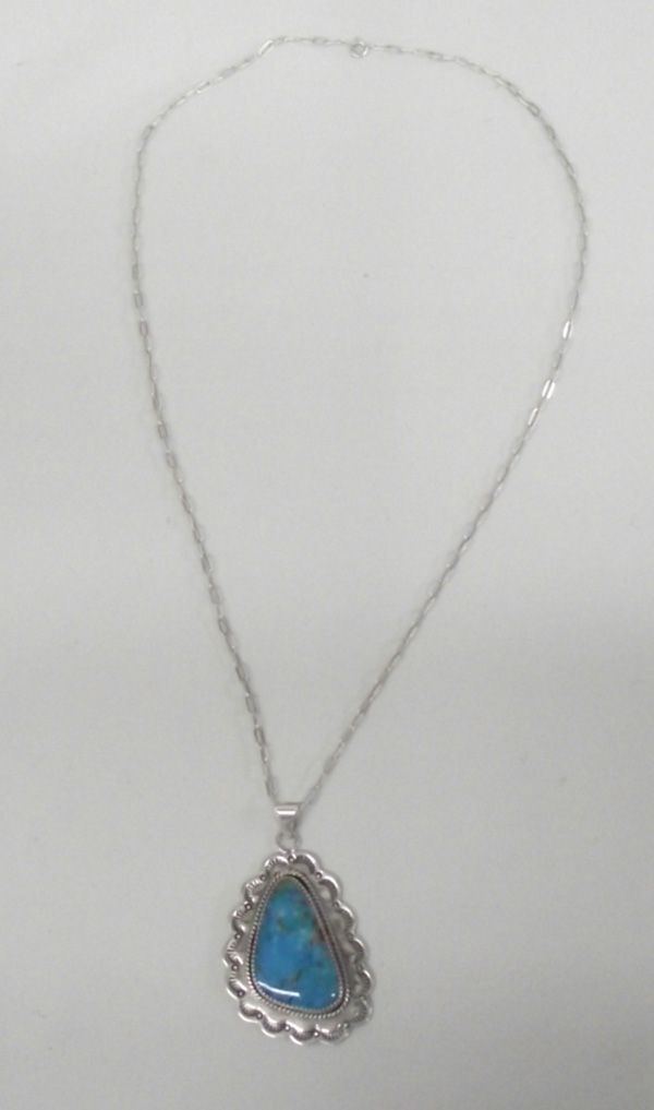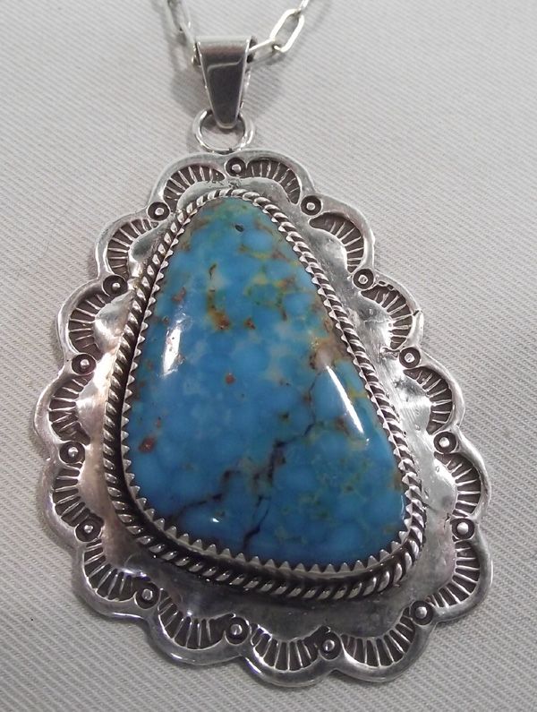 Navajo Inscribed Sterling and Turquoise Necklace. Beautiful sea blue with nice matrix surrounded by a rope design. 24''L chain. Pendant is 2.75''L x 1.5''W. A beautiful example of Navajo work.