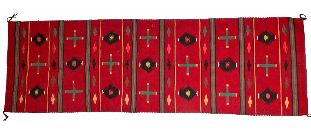 This 34 x 112 runner is non-Navajo and features a cross design with orange, yellow, salmon, green, red, brown, black, and white yarns. Tightly woven and in very good condition. From the Tahoe Wovoka Estate Collection. Wovoka Collection HKA#63112