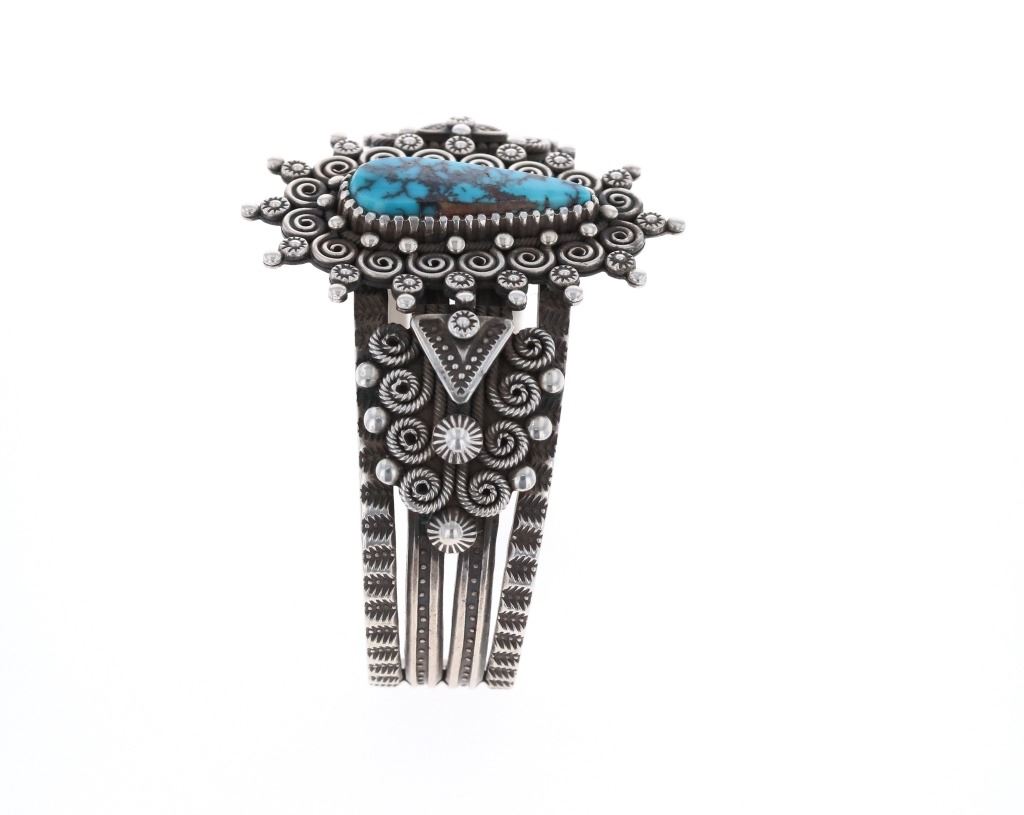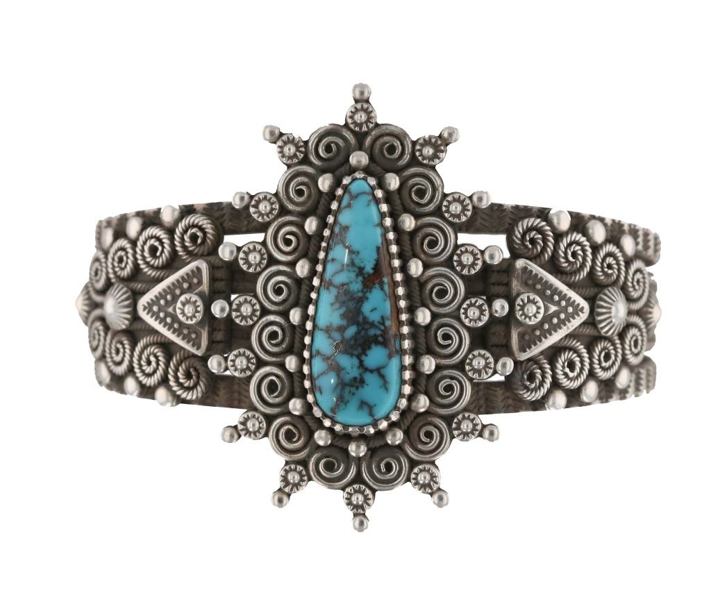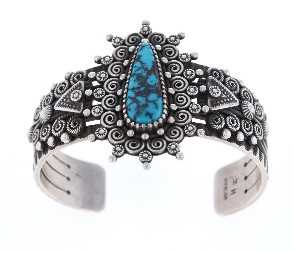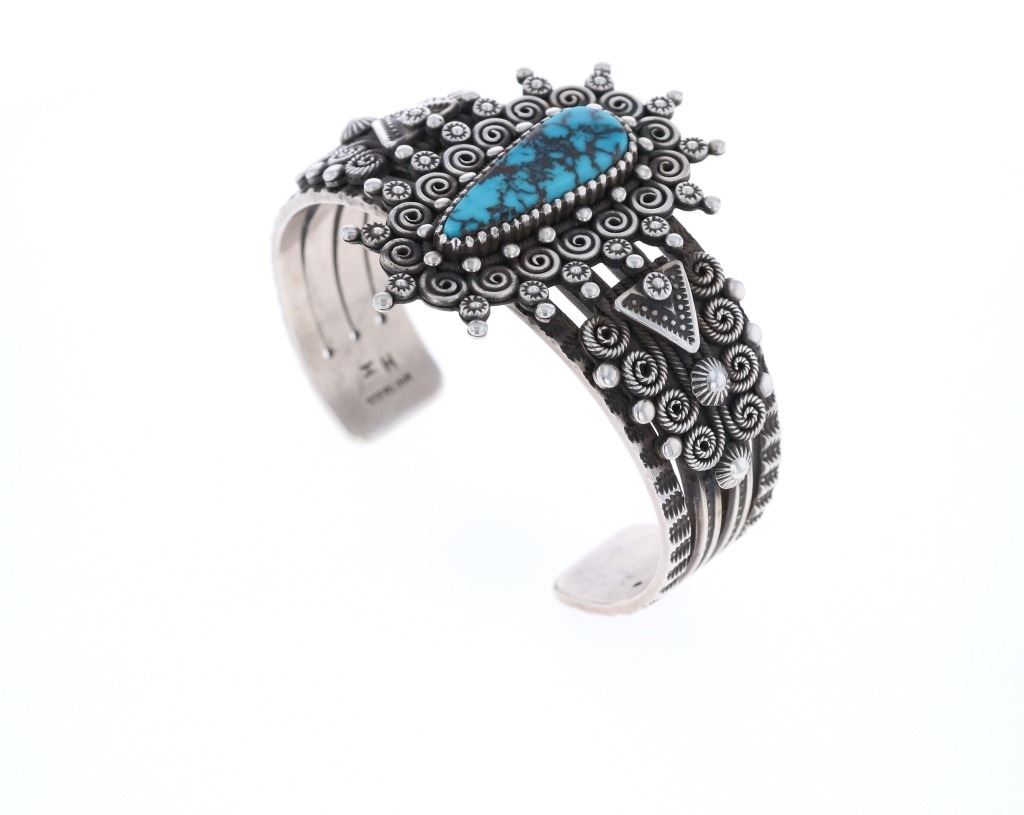 Featured in this lot is this sterling silver turquoise bracelet from Navajo (Diné) artist Ivan J. Howard. The bracelet features a wonderfully and professionally crafted sterling silver construction that shows a beautifully decorated shoulders and around the center stone that features a Kingman turquoise cabochon with a beautiful spider webbing and a beautiful luster. The bracelet is marked 'IH' and 'Sterling' underneath the hallmark. The condition of this bracelet is good with no obvious signs of damage and shows good overall condition. The measurements of this bracelet is 2" x 2 1/2" x 1 3/4" and the collective weight is 58g.