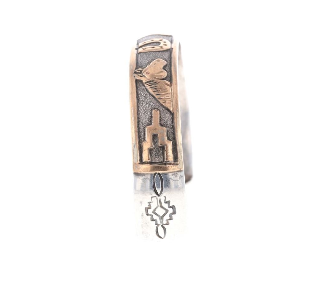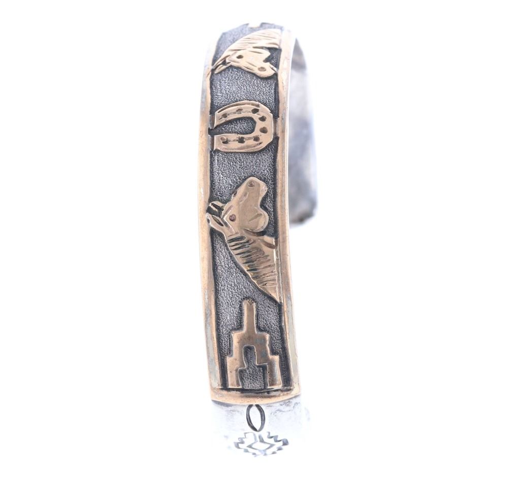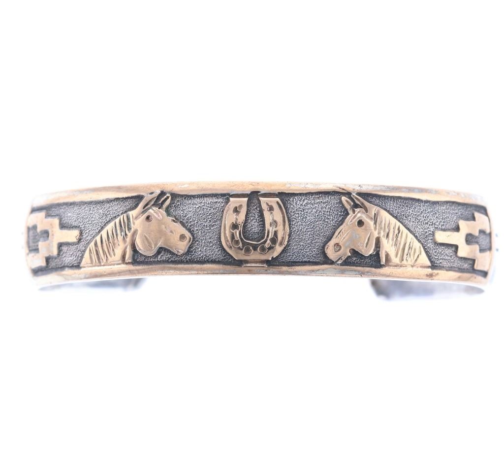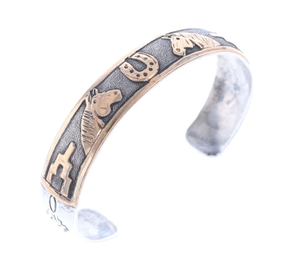 Featured in this lot is this sterling silver and 12k gold filled storyteller bracelet from Navajo artist Jessie Claw. This bracelet features a beautiful sterling silver construction with a 12k gold filled storyteller depiction of two horses, displaying geometric patterns, texture, and a lucky horseshoe in the center. The bracelet features a sterling stamp and an etched inclusion for 12k gold filled with the artist’s hallmark shown above. The condition of this bracelet is good, with no obvious signs of damage. The measurements of this bracelet are 1 7/8" x 2 1/2" x 1/2" with a circumference of 4 1/2". The overall weight of the bracelet is 16.8 g.