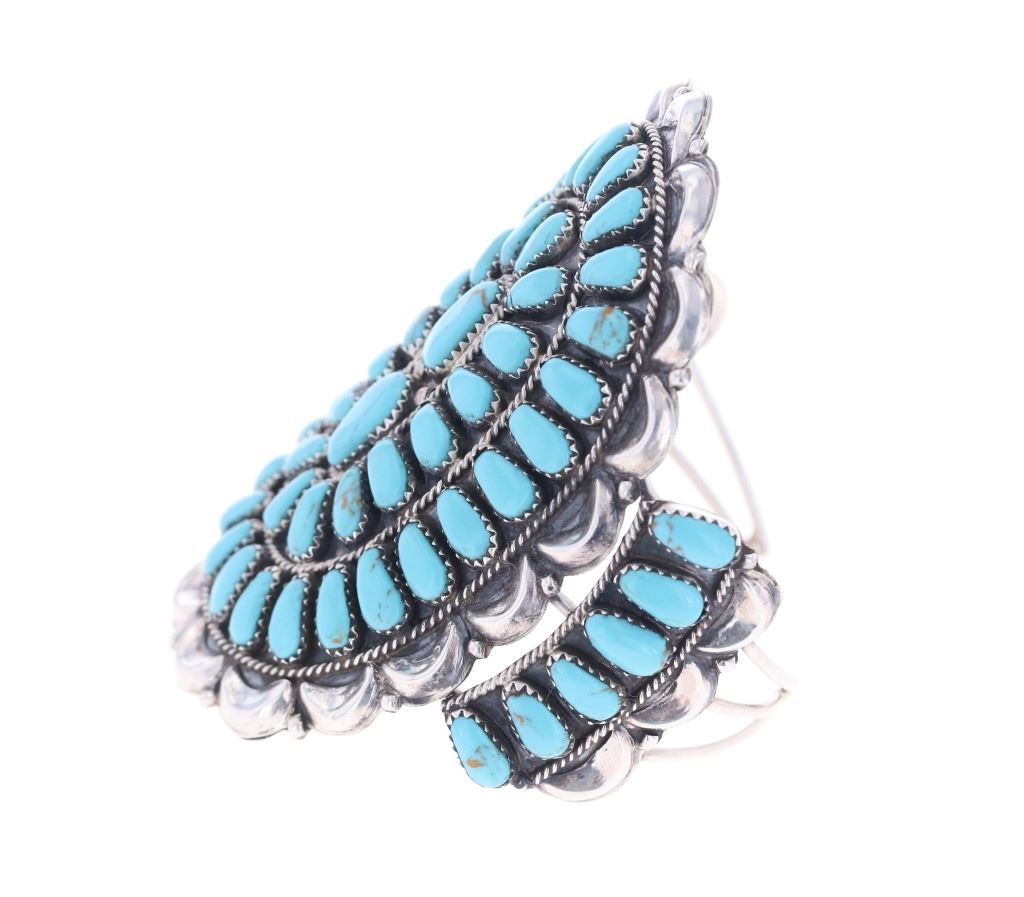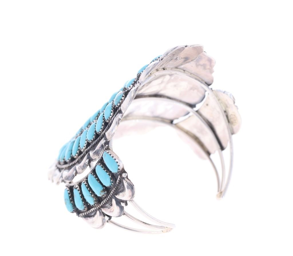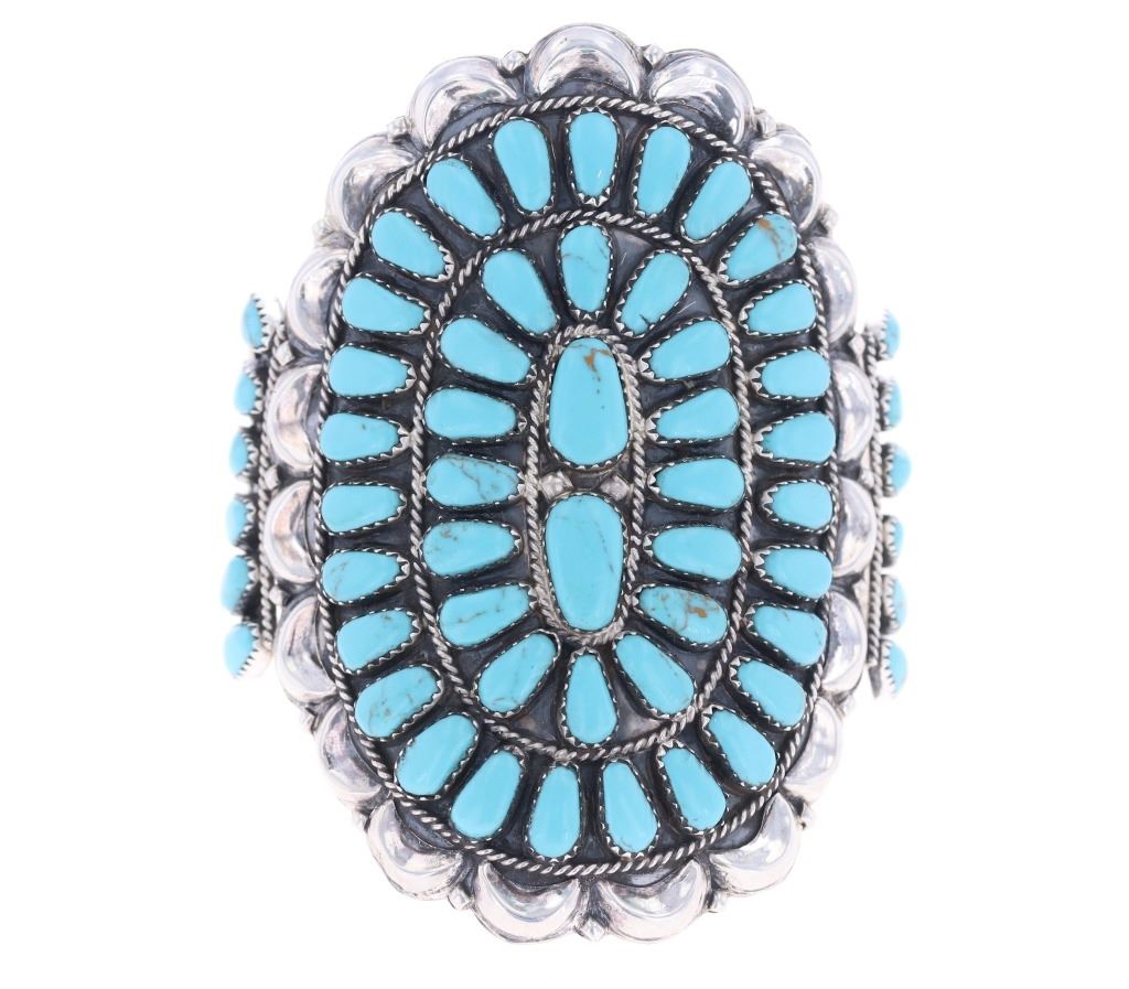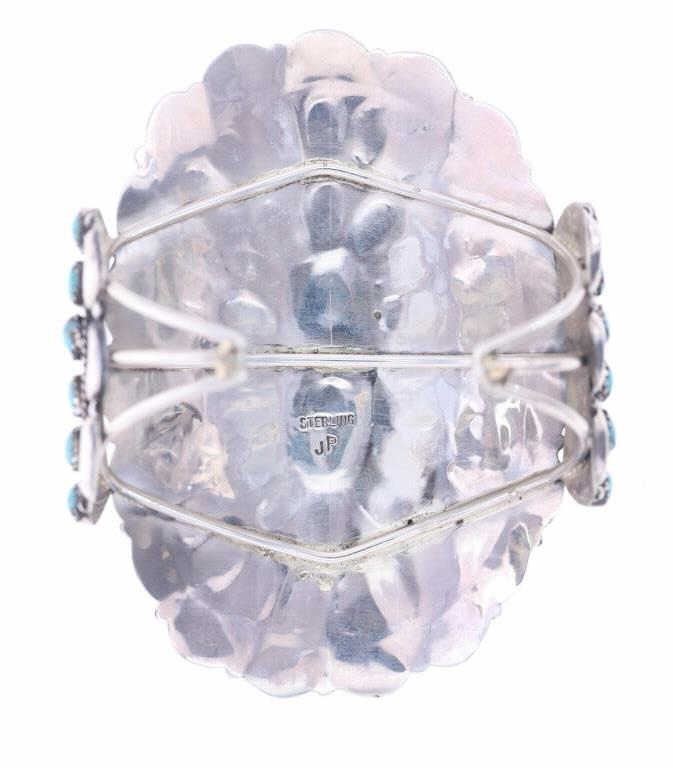 Featured in this lot is a sterling silver turquoise bracelet from Navajo artist, Jane Popovitch. The bracelet features a wonderfully and professionally crafted sterling silver and cripple creek turquoise construction that shows point decoration with pear cut turquoise cabochon with two larger cabochon in the center. The bracelet is marked as follows: Sterling - JP. The condition of this Navajo bracelet is good with no obvious signs of damage and shows good overall condition. The measurements of this bracelet are 2" x 2 3/4" x 3 3/8". The collective weight of this bracelet is 47.6g.*