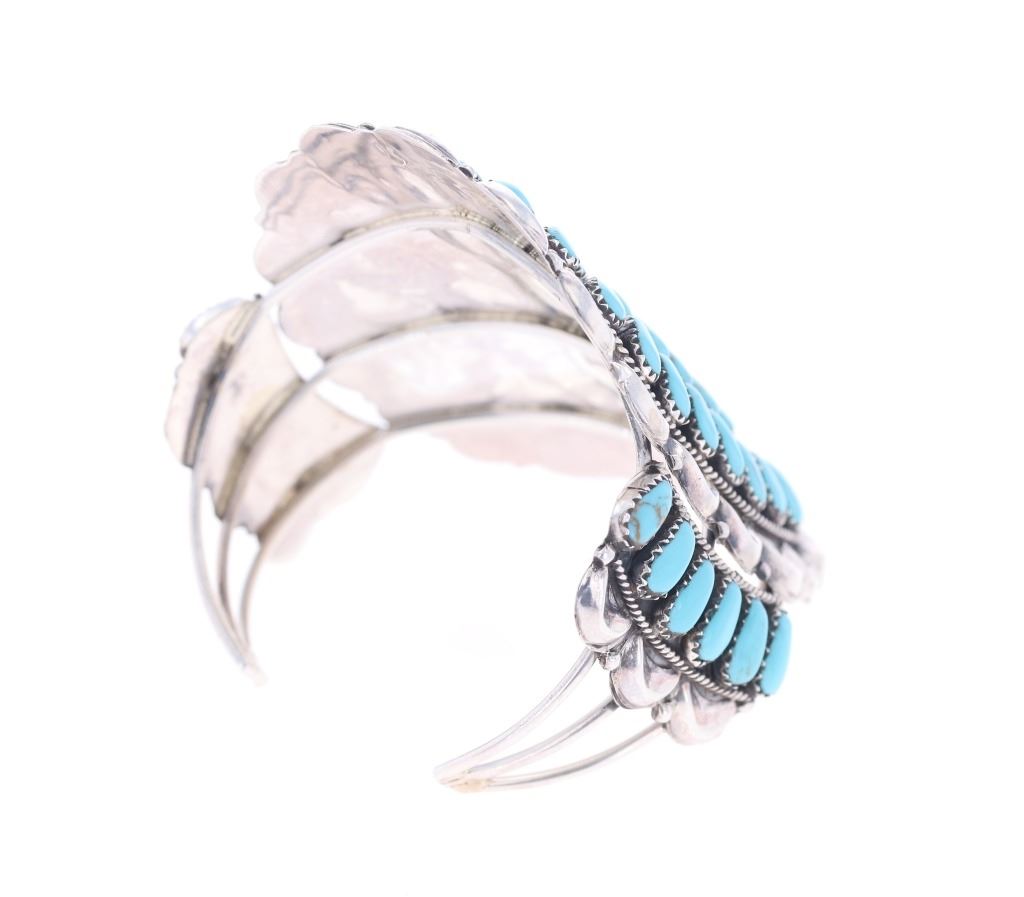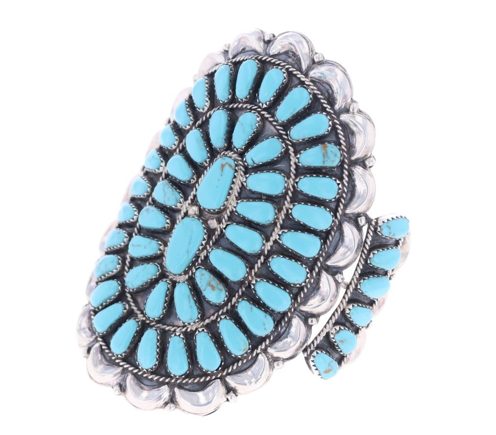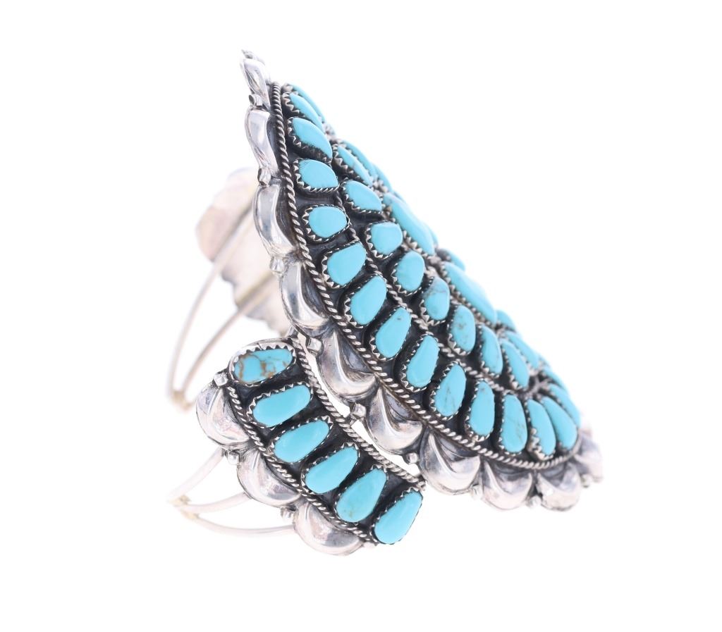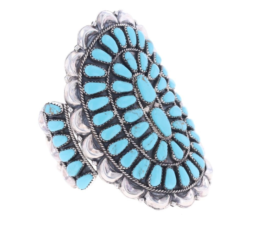 Featured in this lot is a sterling silver turquoise bracelet from Navajo artist, Jane Popovitch. The bracelet features a wonderfully and professionally crafted sterling silver and cripple creek turquoise construction that shows point decoration with pear cut turquoise cabochon with two larger cabochon in the center. The bracelet is marked as follows: Sterling - JP. The condition of this Navajo bracelet is good with no obvious signs of damage and shows good overall condition. The measurements of this bracelet are 2" x 2 3/4" x 3 3/8". The collective weight of this bracelet is 47.6g.*