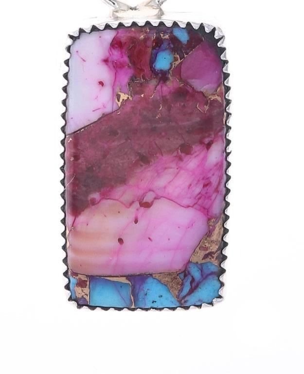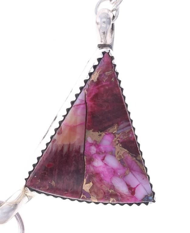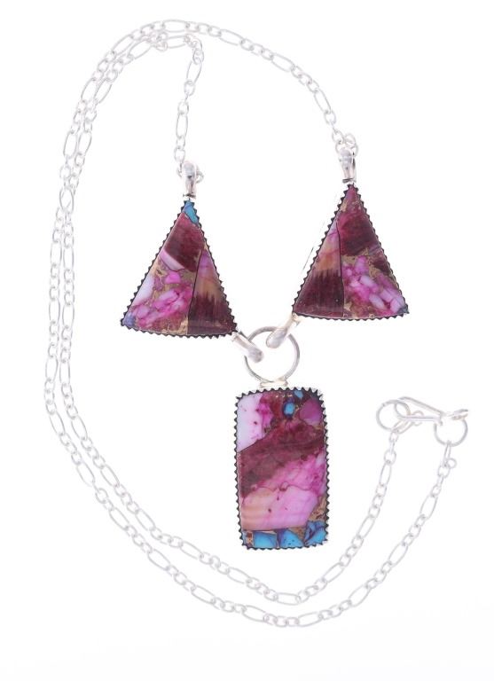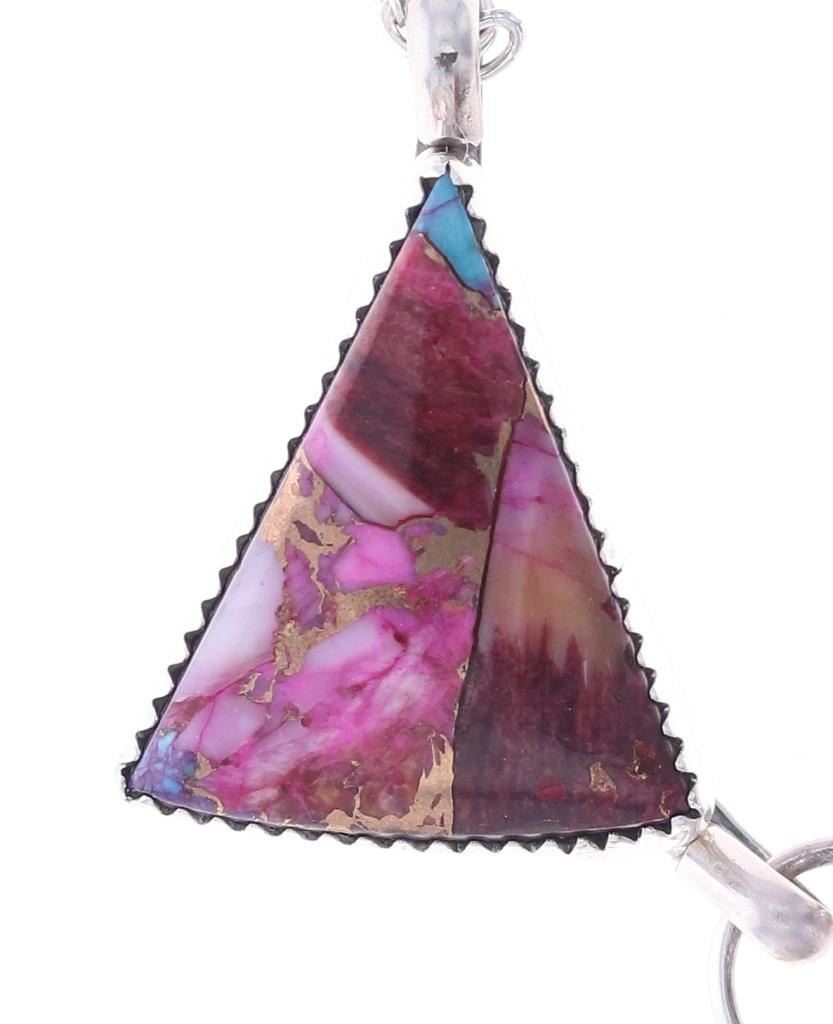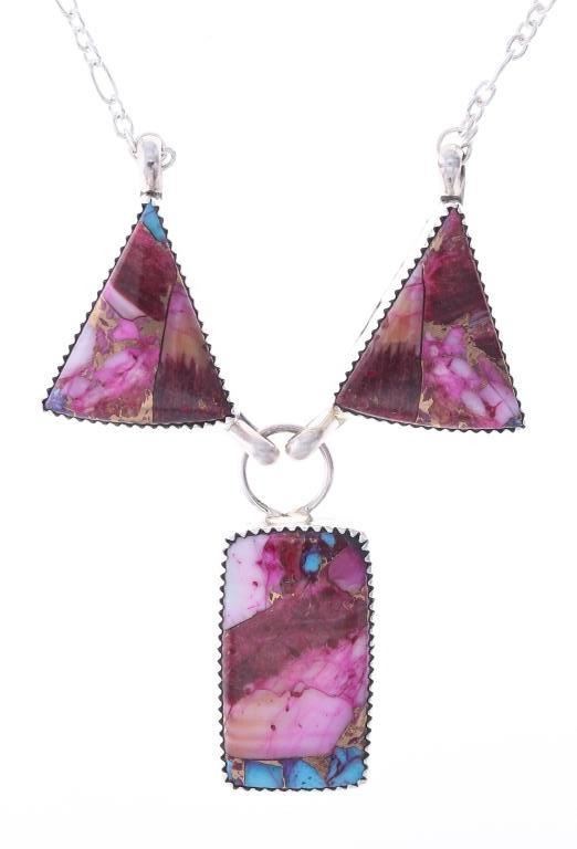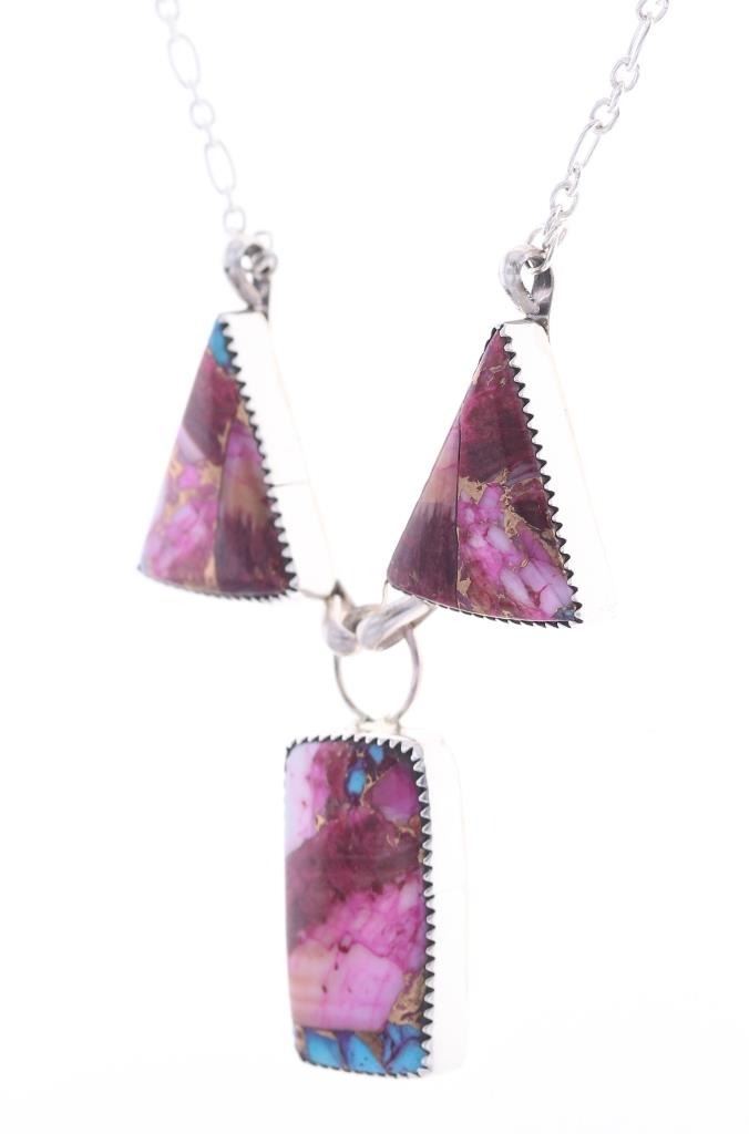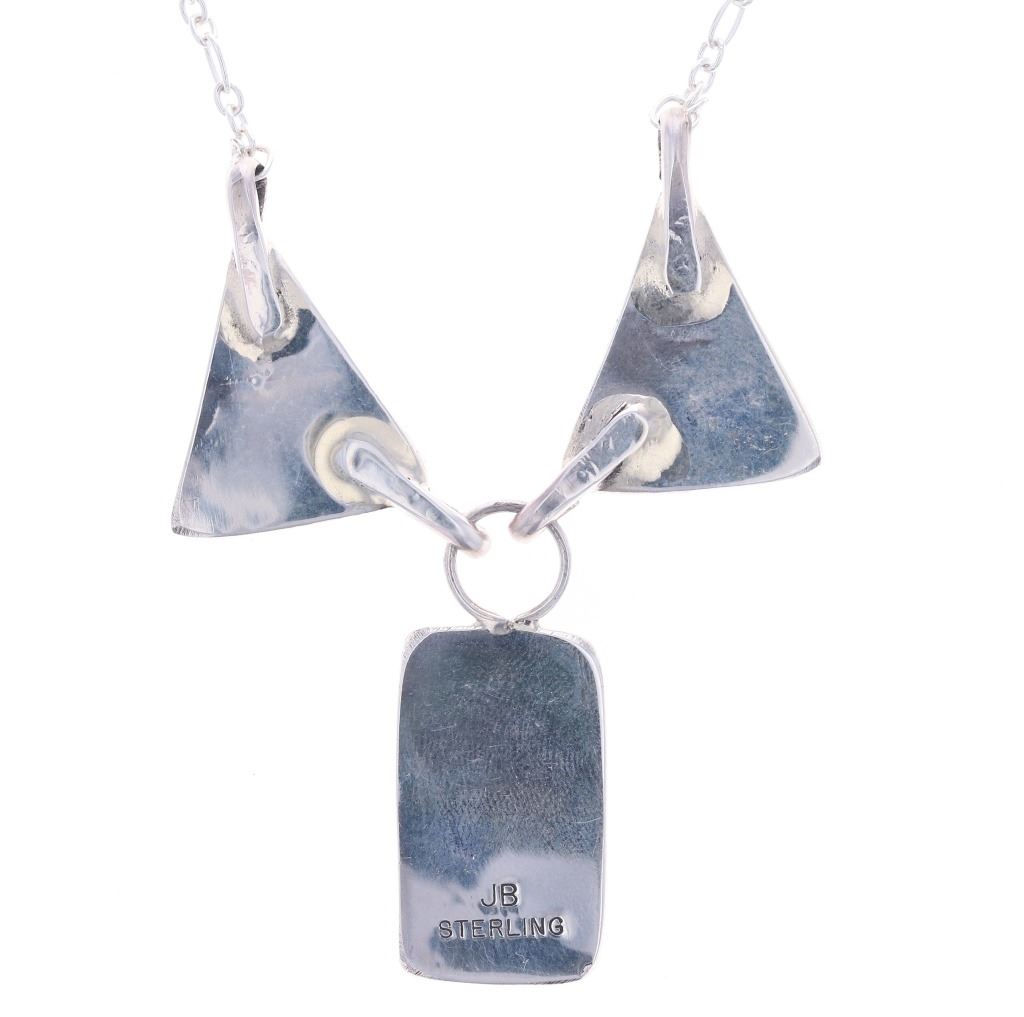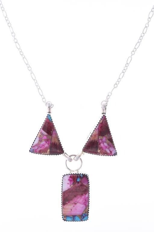 Featured in this lot is this Mojave Turquoise necklace from Navajo artist Jennifer Begay. The necklace features a wonderfully and professionally crafted sterling silver and Mojave Turquoise construction. The necklace shows a cluster arrangements of pendants that shows two triangular and rectangular cabochon of Mojave Turquoise that shows pink purplish coloration that shows some small specks of blue coloration. The pendant is marked 'JB' and 'Sterling' on the back of the pendant. The condition of this necklace shows a bright sheen to the sterling silver with a beautiful luster to the purplish pink coloration. The measurements of this necklace from clasp to clasp is 20 1/8" and the cluster of pendants measures 1 1/2" x 3". The collective weight of this necklace is 23.2g.