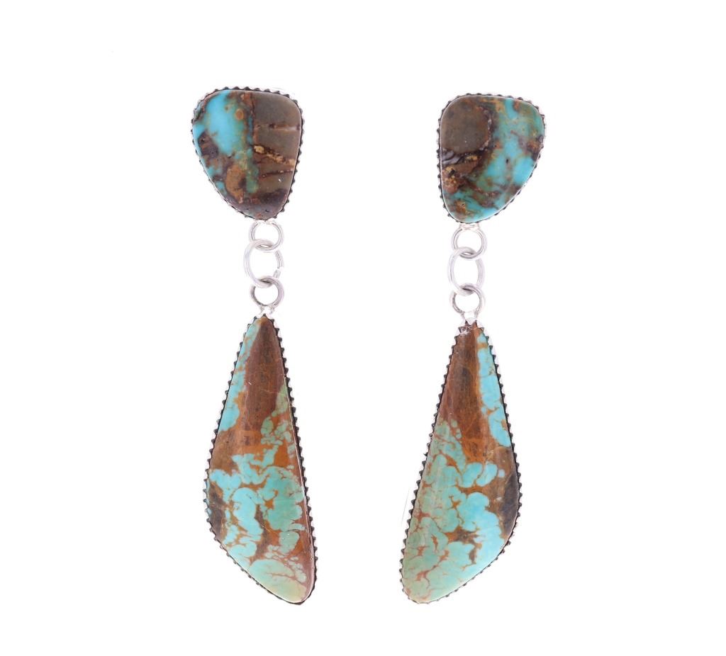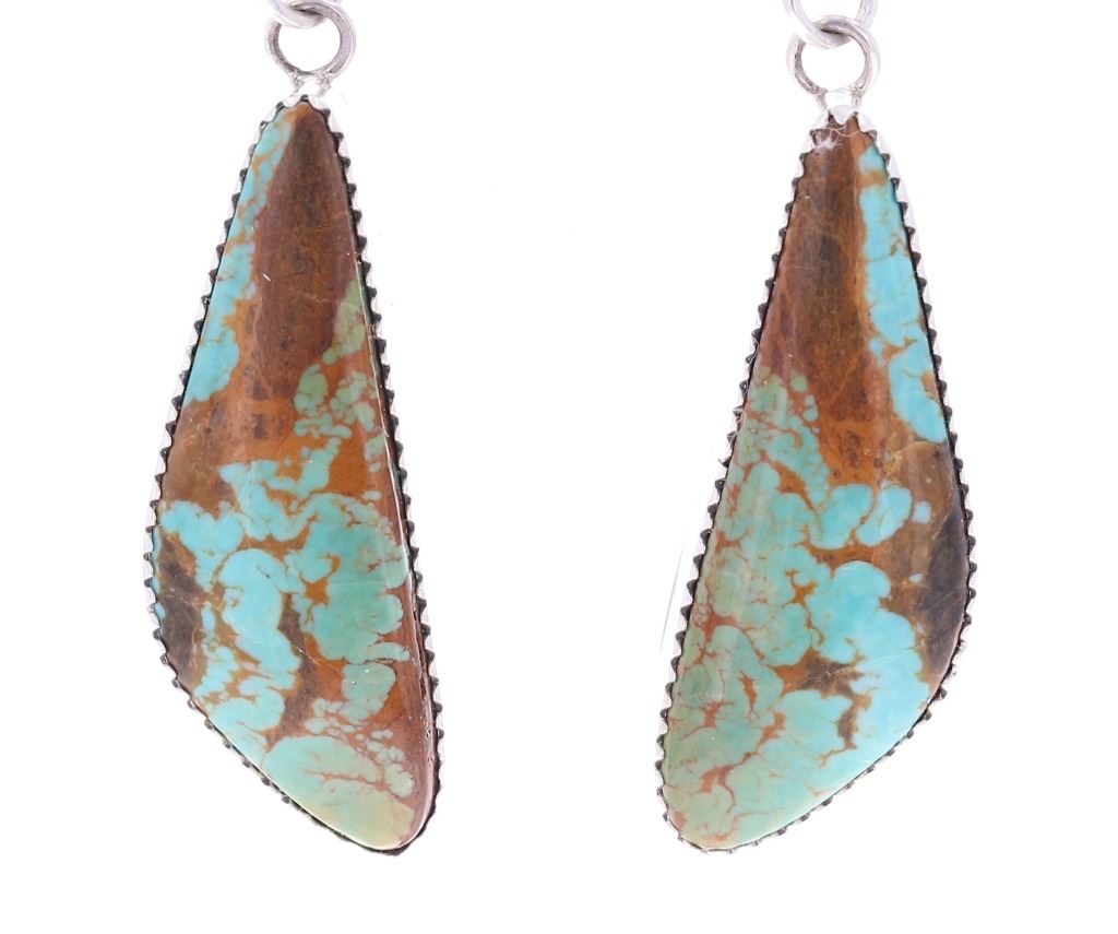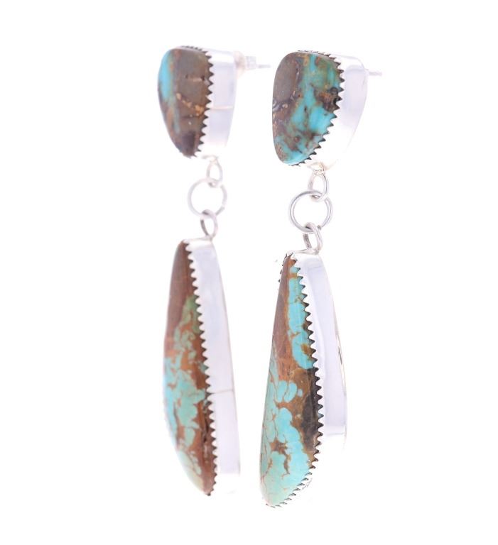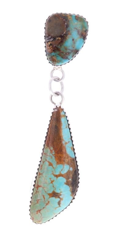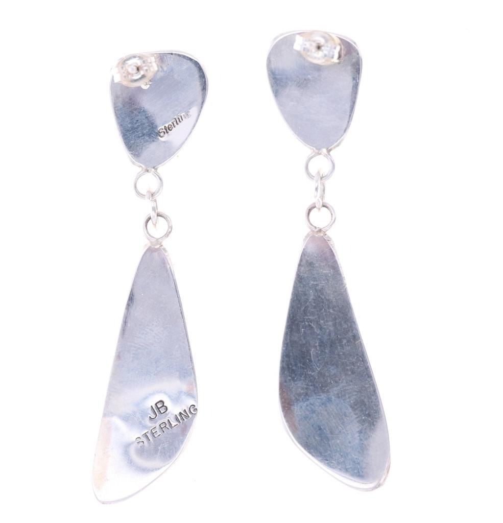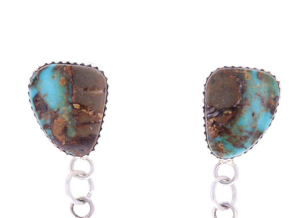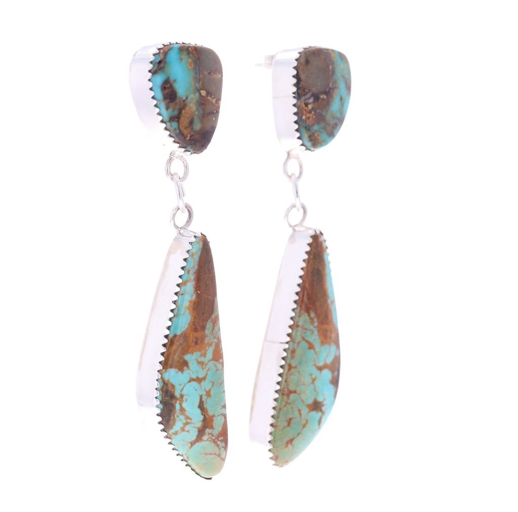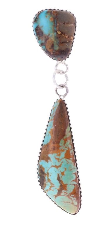 Featured in this lot is this sterling silver turquoise earrings from Navajo artist Jennifer Begay. The earrings feature wonderfully and professionally crafted sterling silver and turquoise construction that shows a dangle design that shows a total of four rough cut Cripple Creek turquoise cabochon set into the face fo the earrings. The earrings are marked 'JB' and 'Sterling'. The condition of this pair of Navajo earrings is good with no obvious signs of damage and shows good overall condition. The measurements of this pair of earrings is 2 3/8" x 5/8" x 5/8". The earrings collective weight is 17.4g.